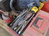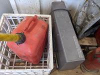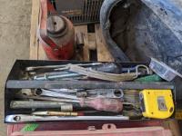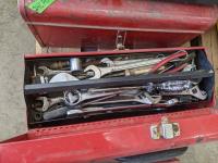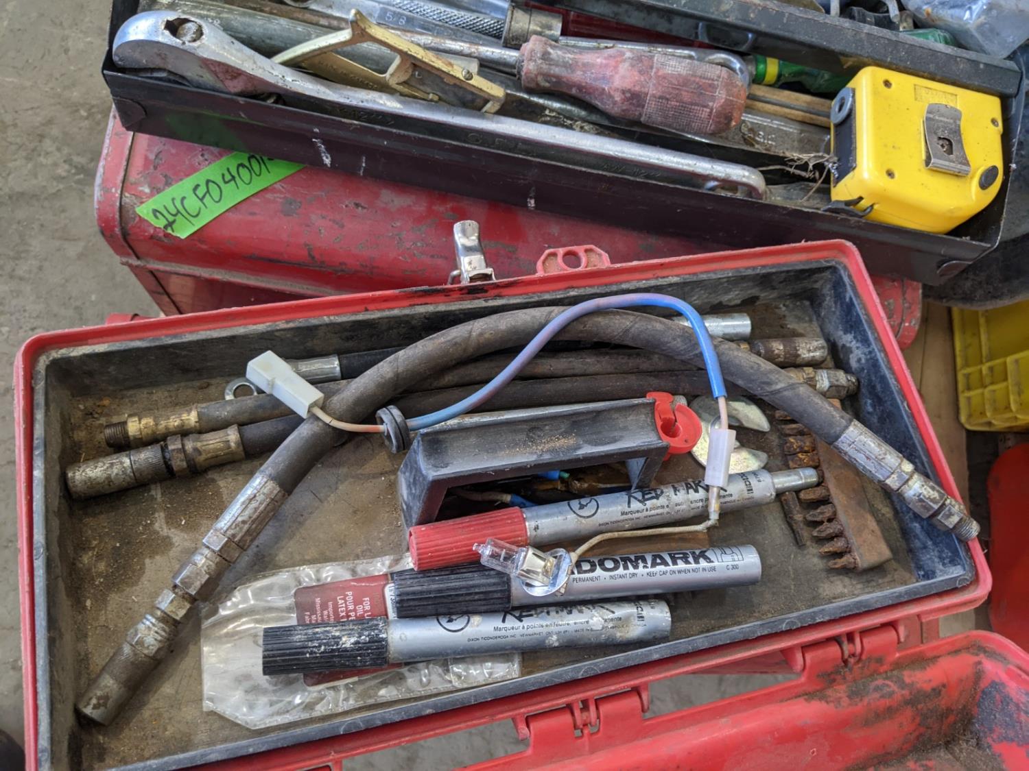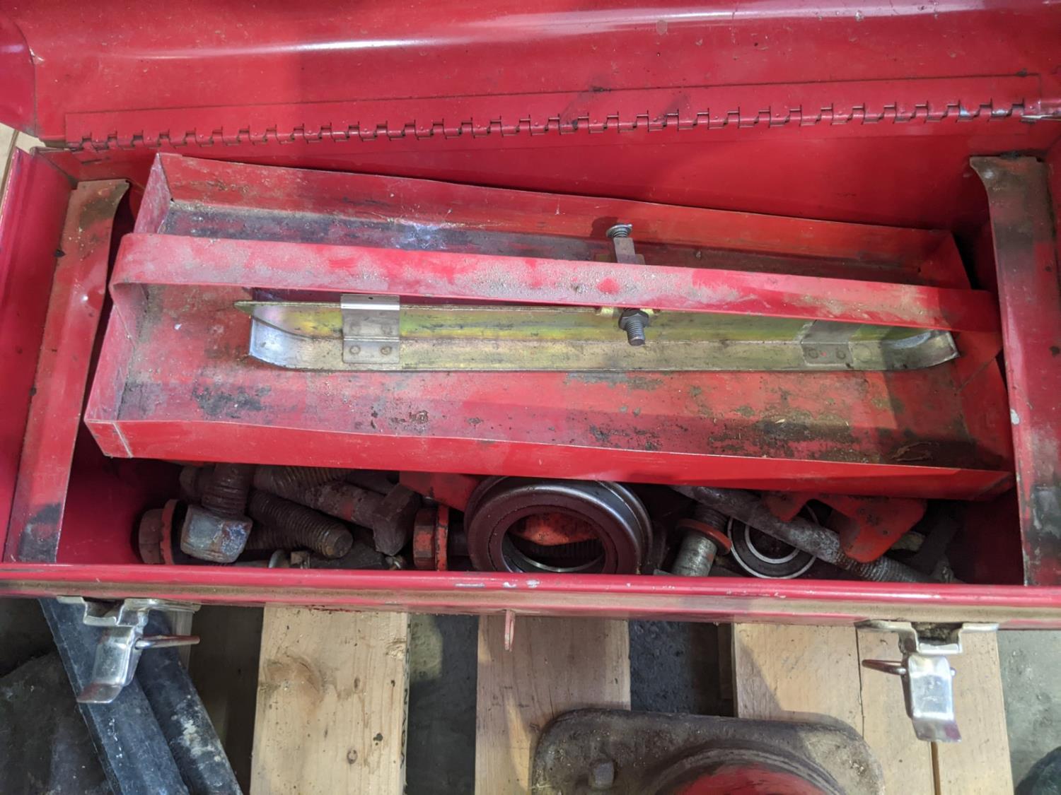 Toolboxes with contents, jerry cans, hand tools, oil pan, bottle jack, heater