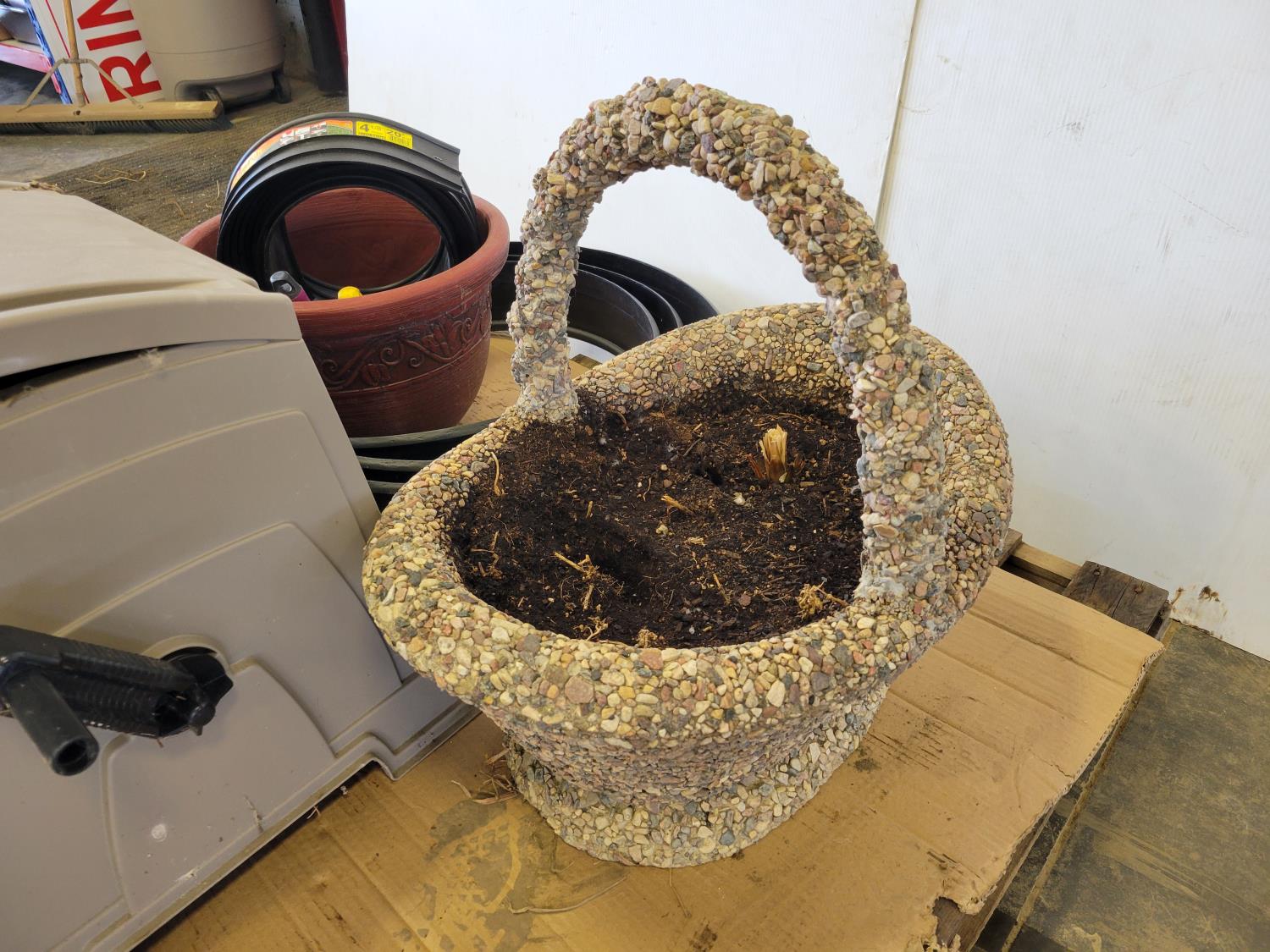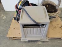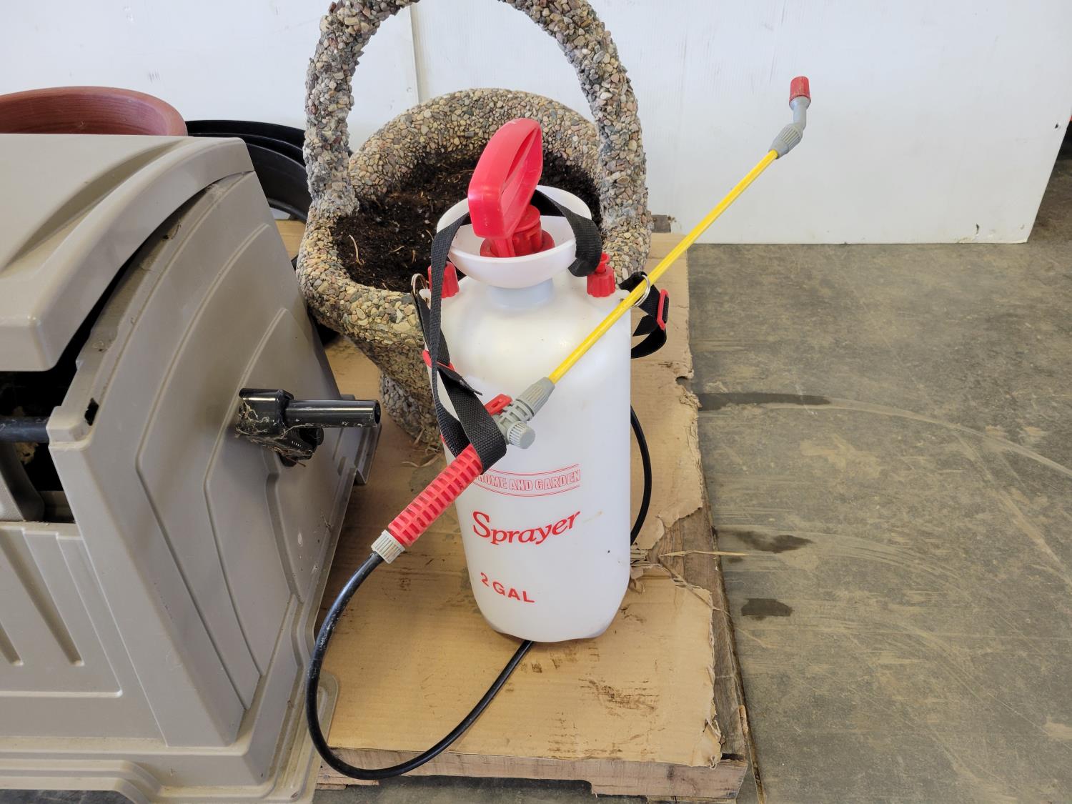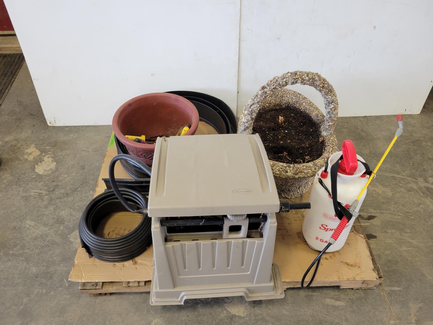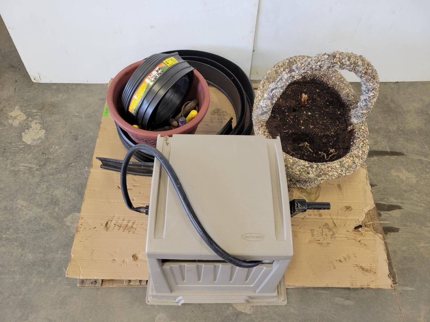 5322 Deck Hose Reel Box, Concrete Planter and Qty of Gardening Tools