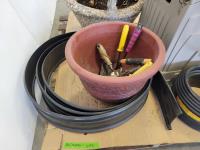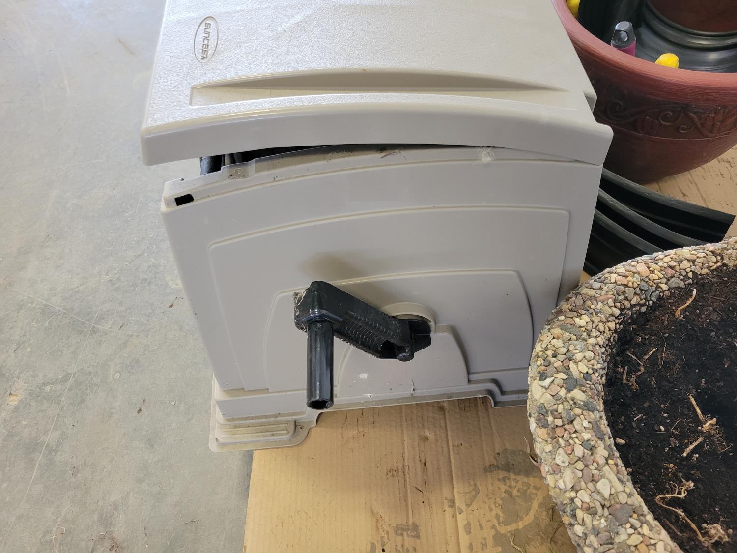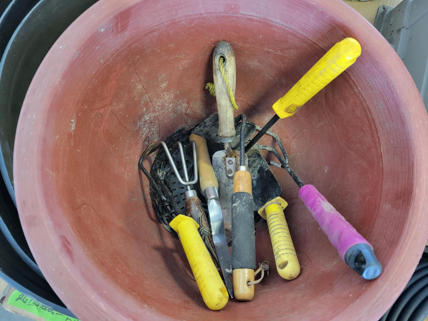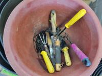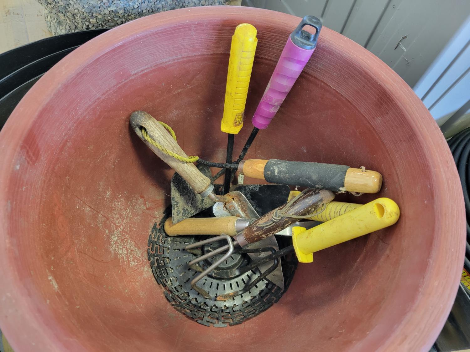 5322 Deck Hose Reel Box, Concrete Planter and Qty of Gardening Tools