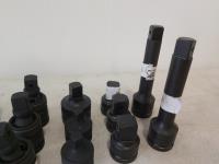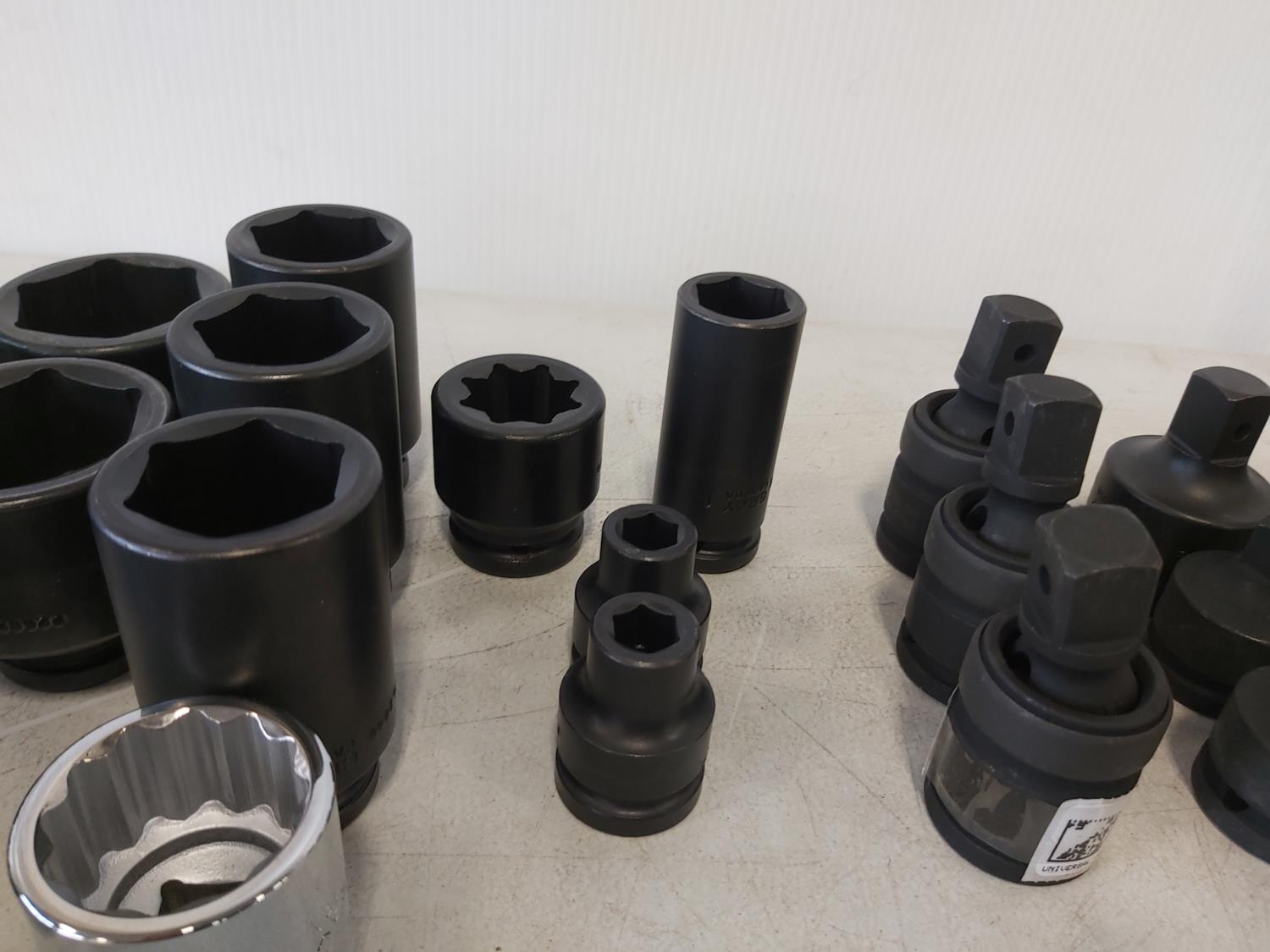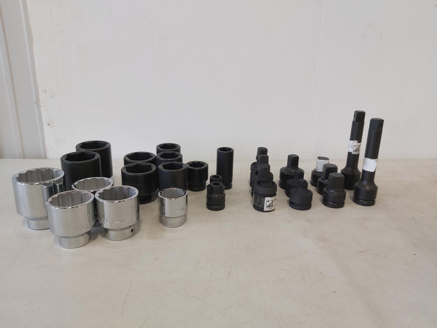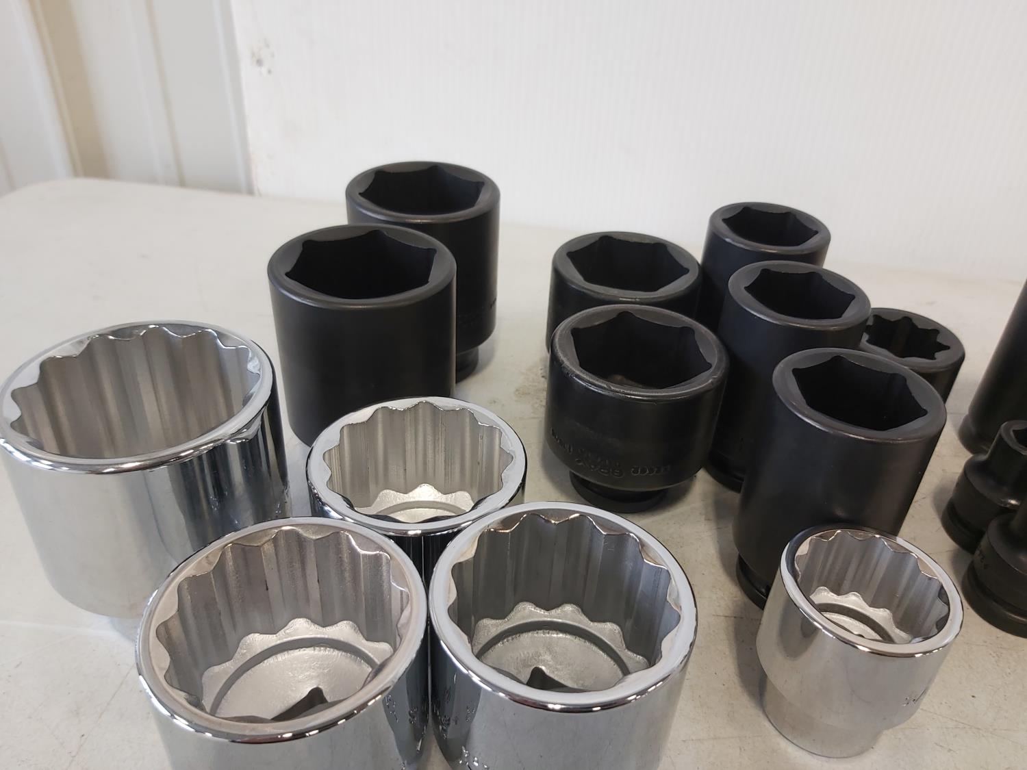 Sockets: (2) 9/16 inch, 1 inch, 1-1/16 inch, (4) 1-7/16 inch, (2) 1-15/16 inch, (2) 2 inch impact, (3) 2 inch chrome, 2-3/8 inch