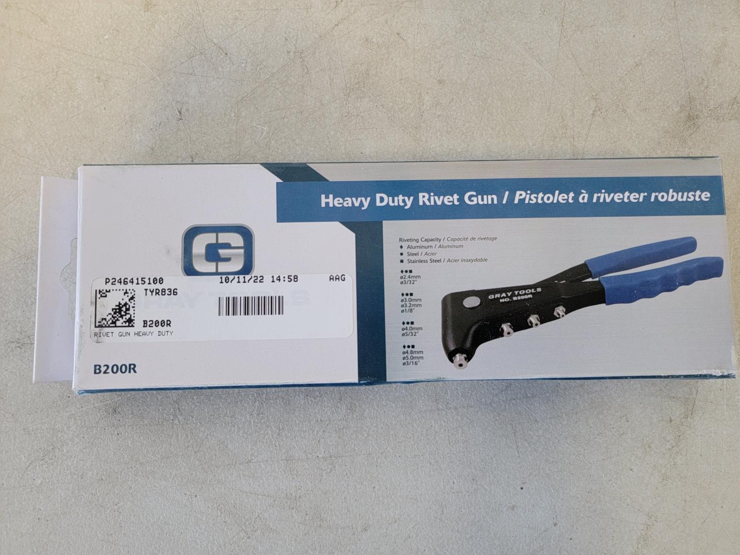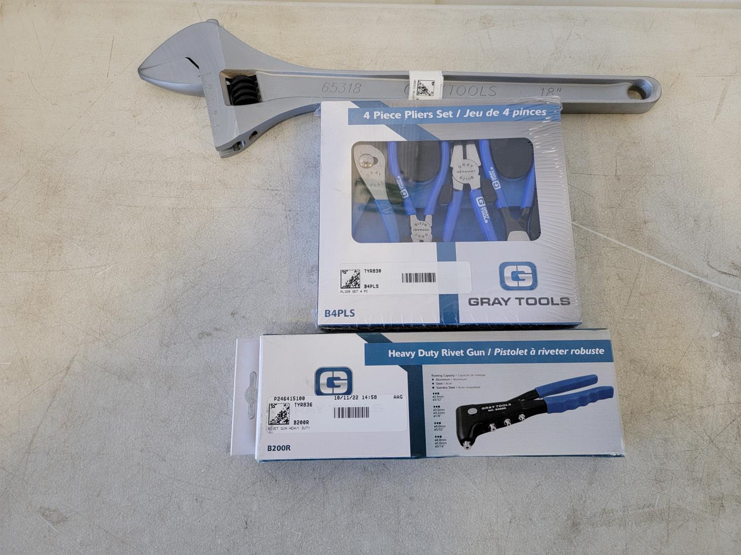 5157 Gray Tools 4 Piece Plier Set, Heavy Duty Rivet Gun & 18 Inch Adjustable Wrench (Unused)