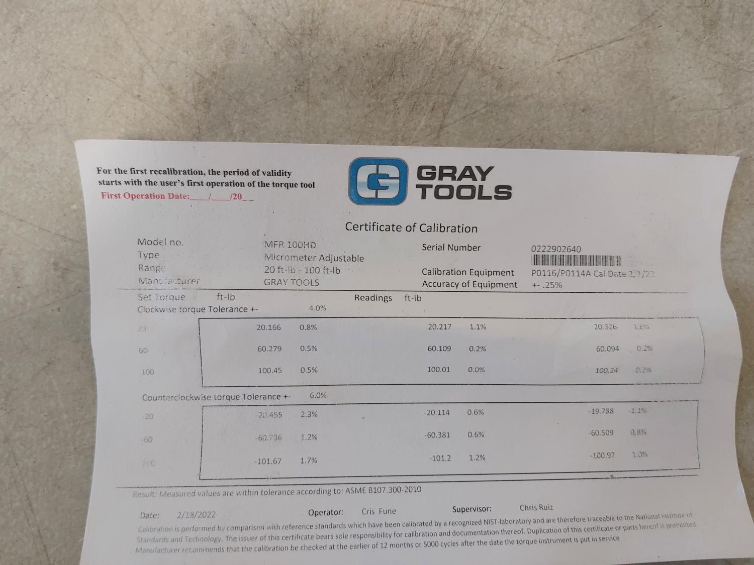 5206 Gray Tools MFR100HD 20 Ft -lb - 100 Ft -lb Torque Wrench 3/8 Drive (Unused)