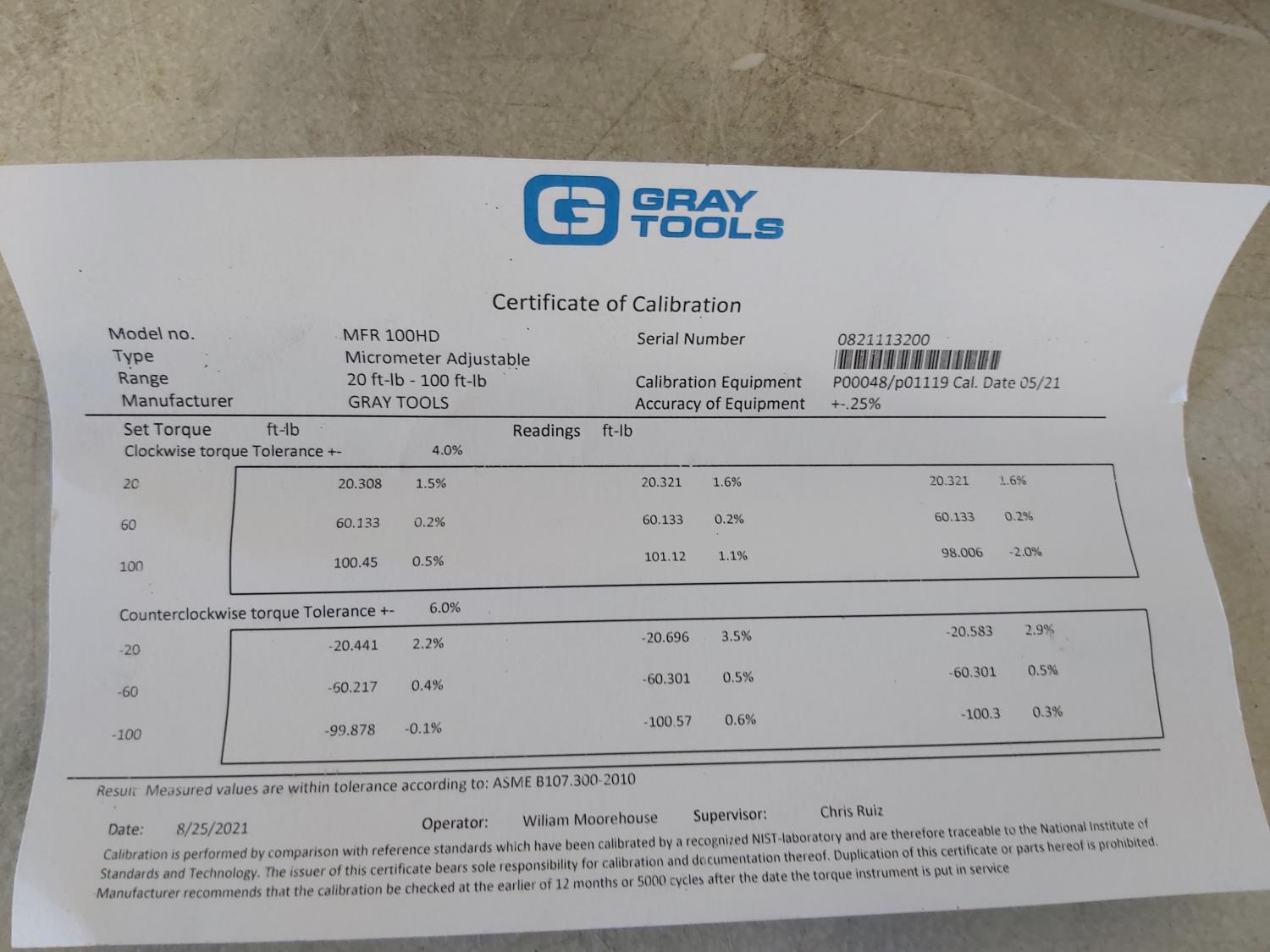 5138 Gray Tools MFR100HD 20 Ft -lb - 100 Ft -lb Torque Wrench 3/8 Inch Drive (Unused)