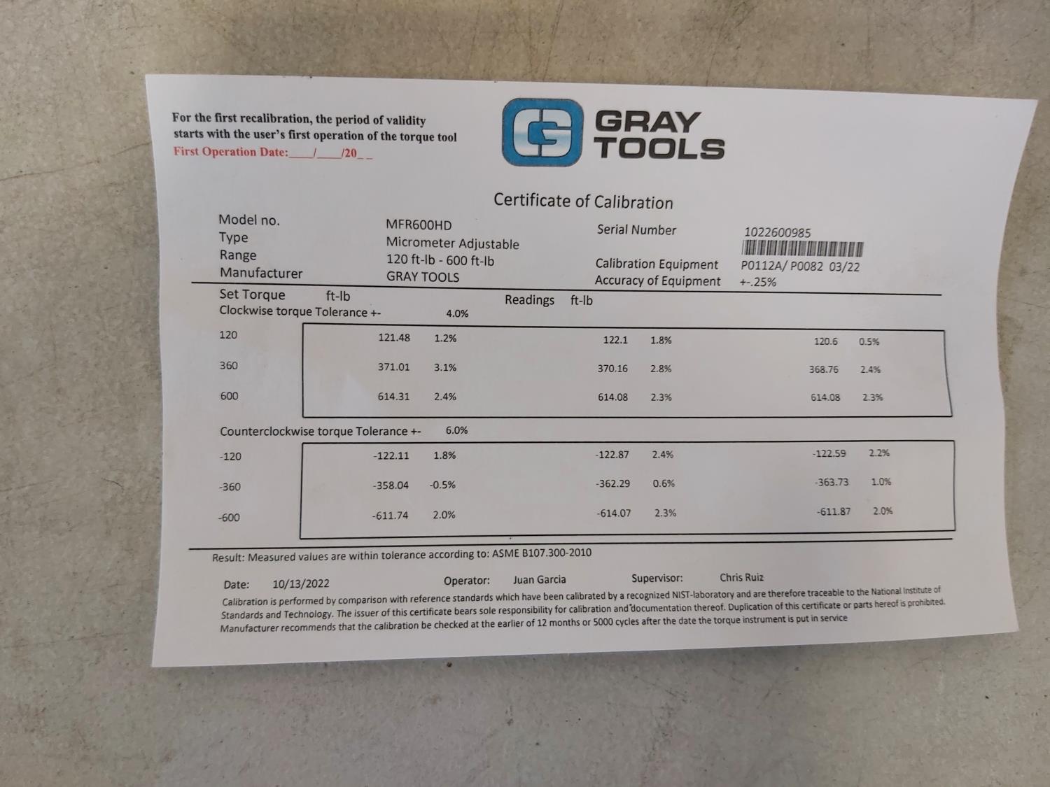 5241 Gray Tools MFR600HD 120 Ft -lb - 600 Ft -lb Torque Wrench 3/4 Inch Drive (Unused)