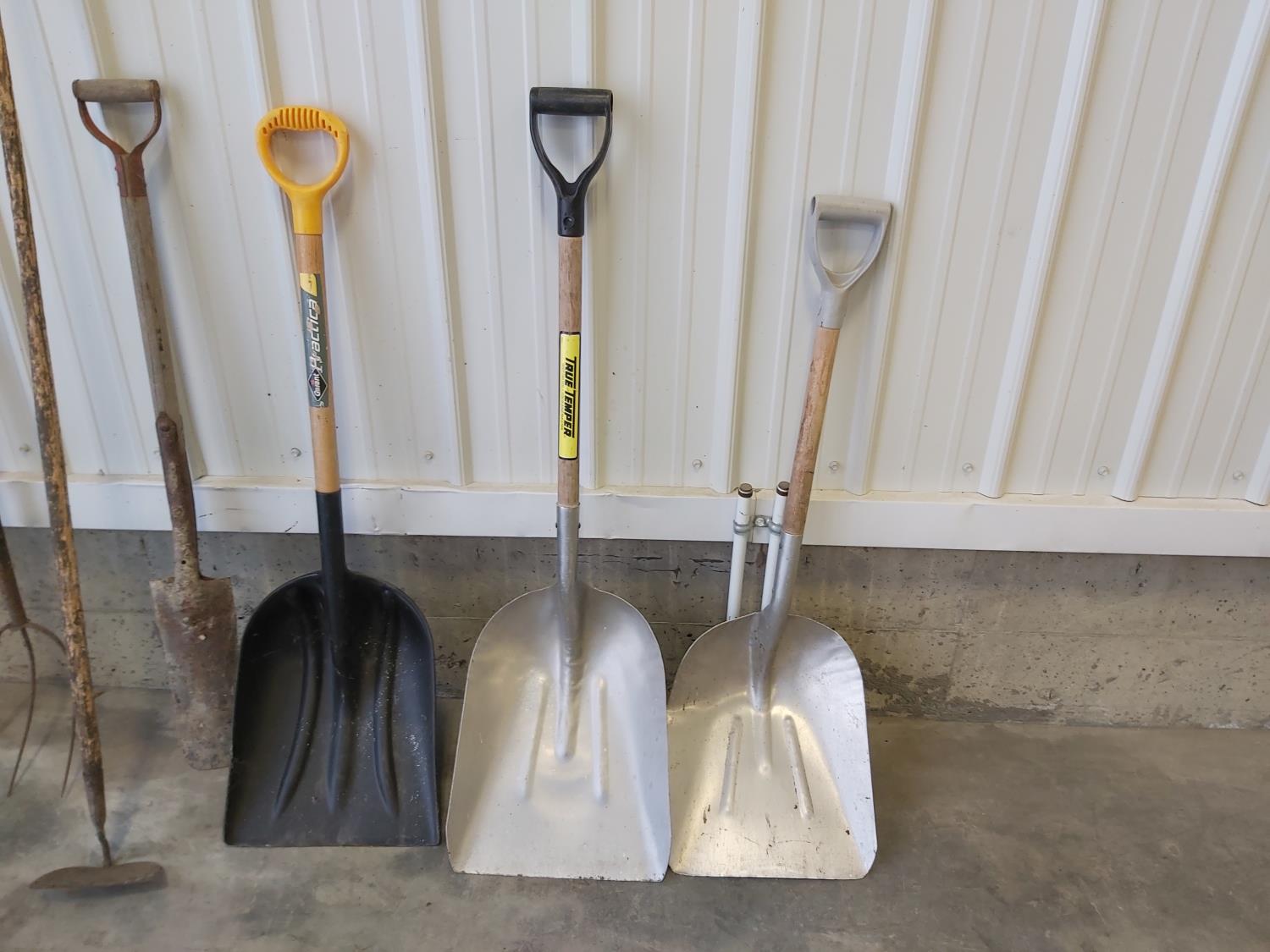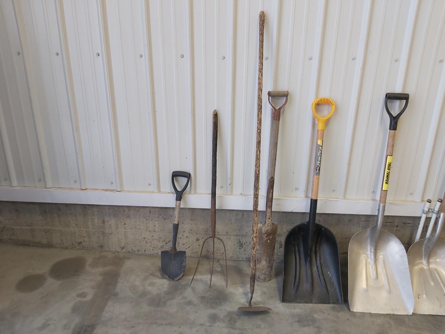 (3) shovels, vintage draining spade, hoe, fork, small spade