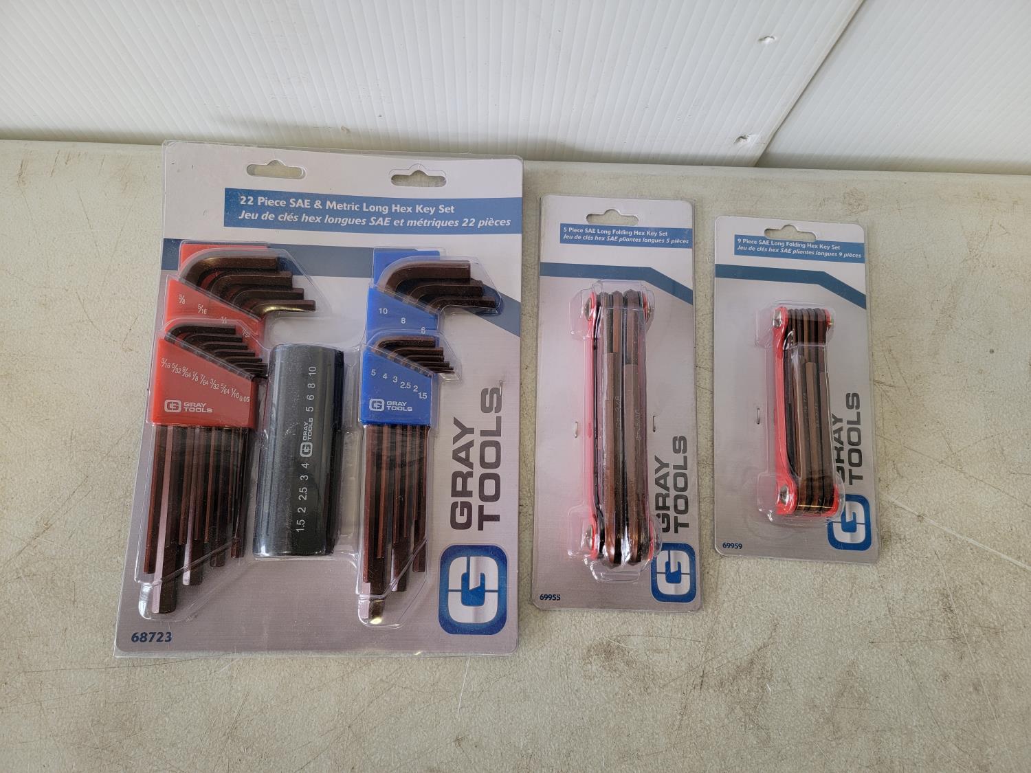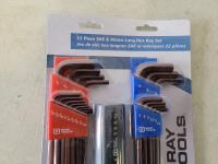 22 piece SAE and metric hex key set, 5 piece long folding hex key set, 9 piece SAE long folding hex keys set