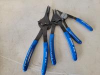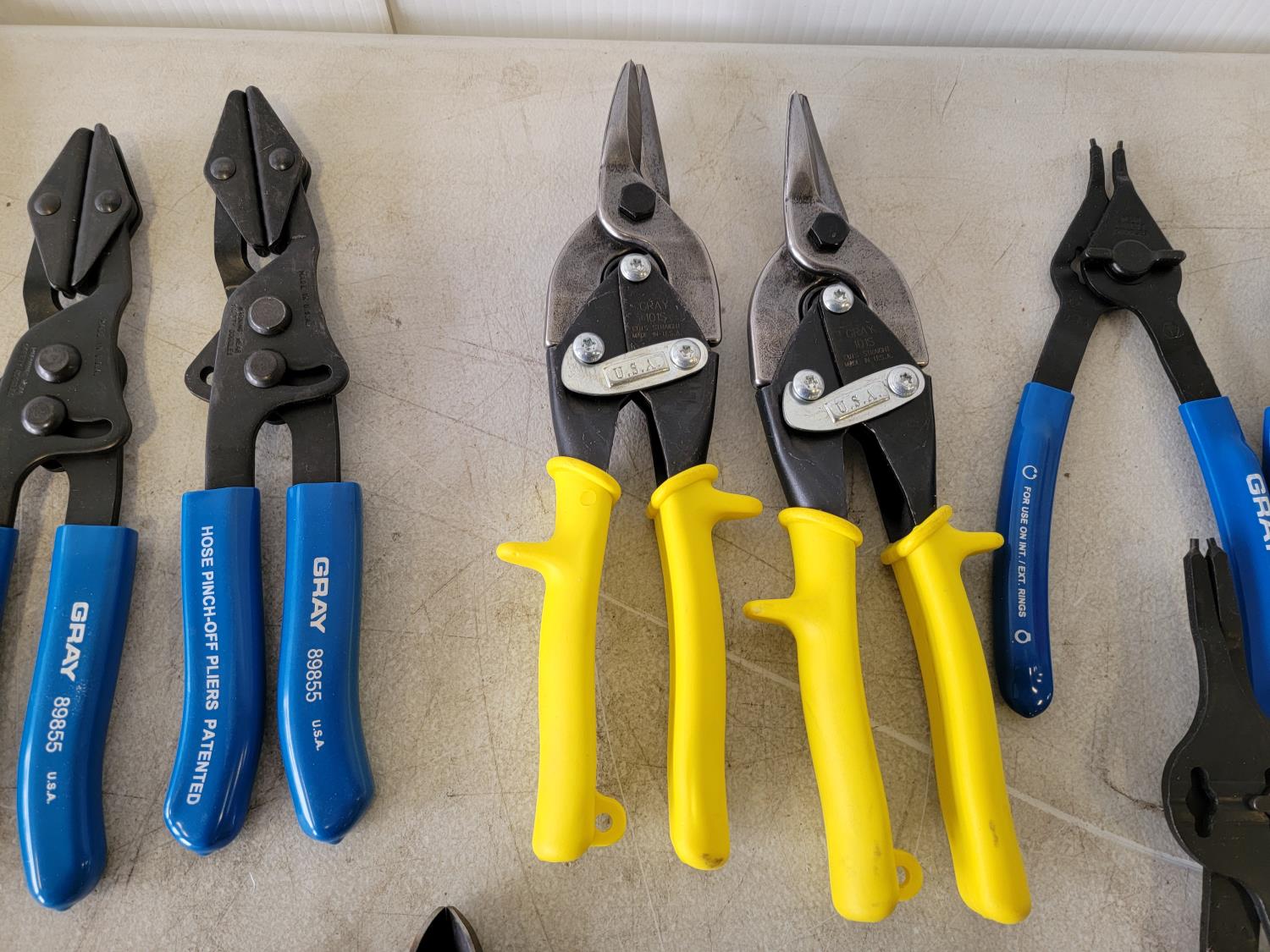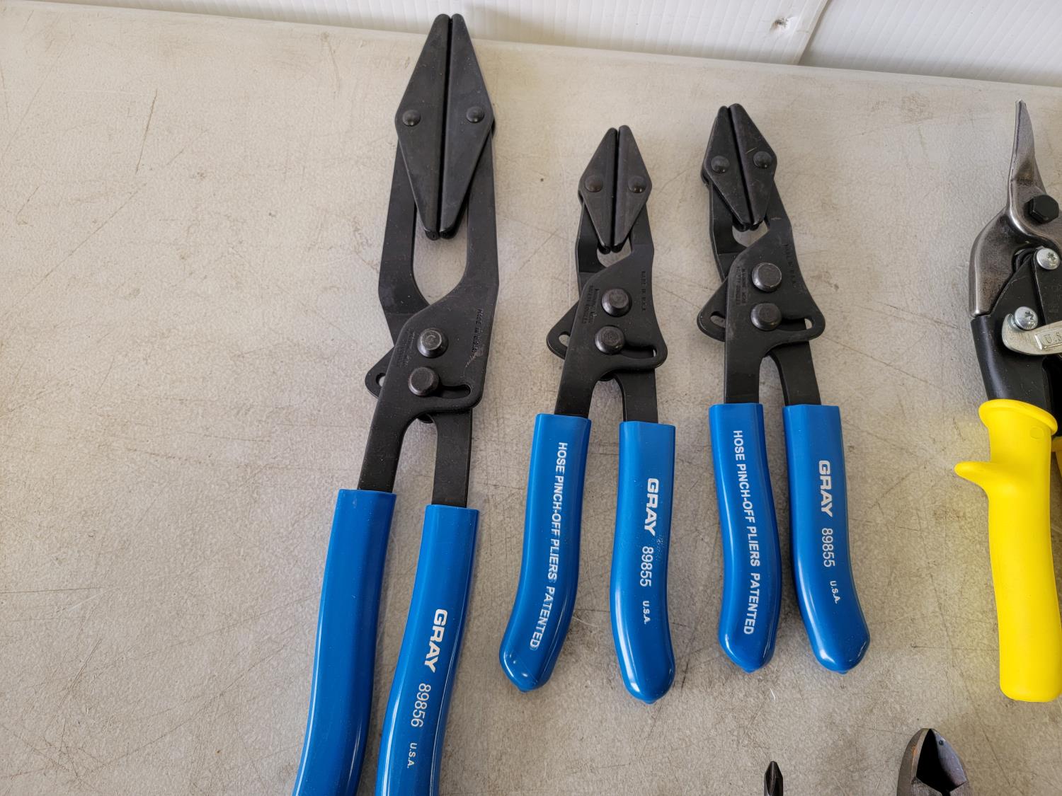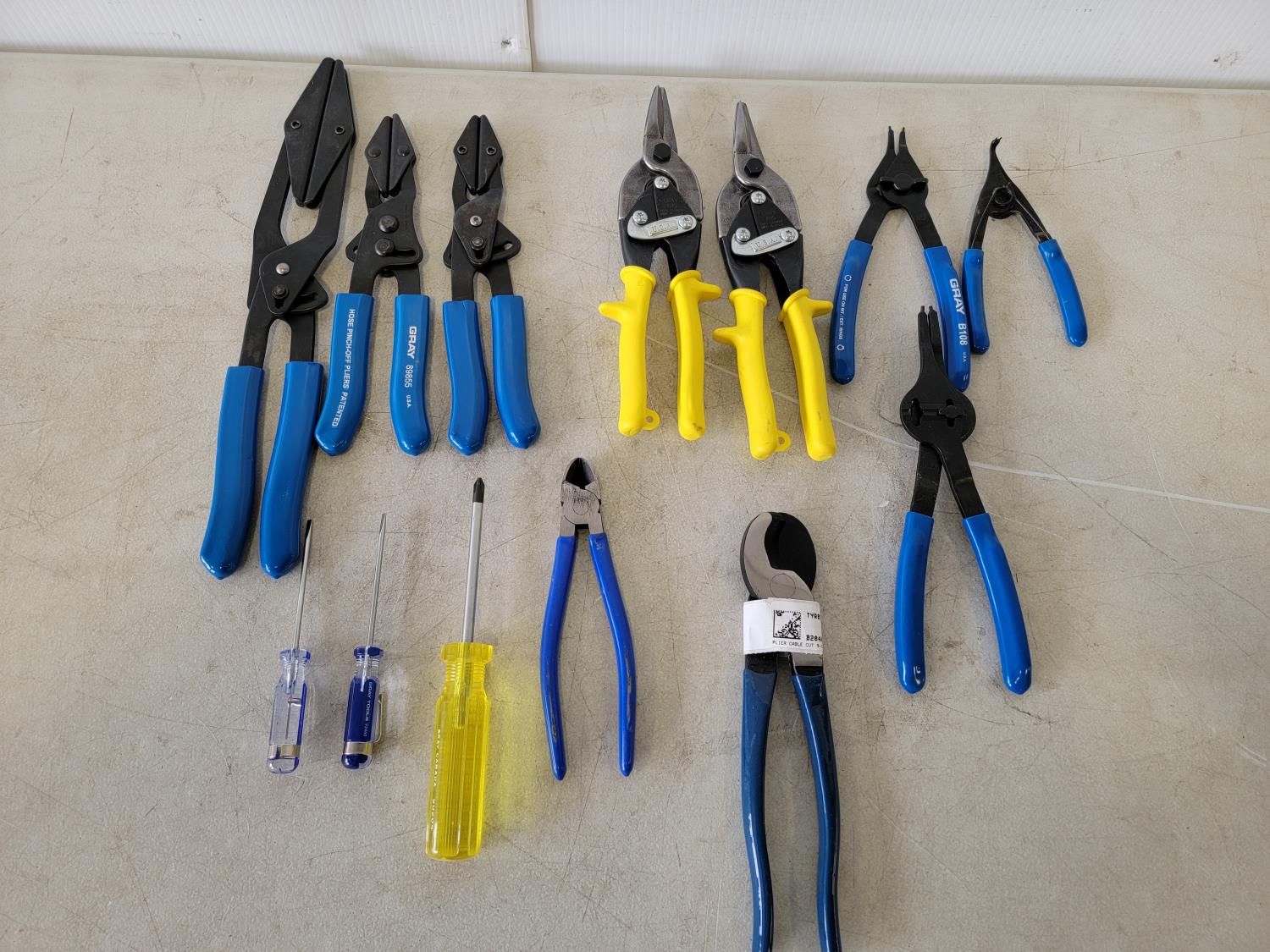 (3) hose pinch pliers, cable cut pliers, side cutter pliers, (2) tin snips, (3) screwdrivers, (3) snap ring pliers