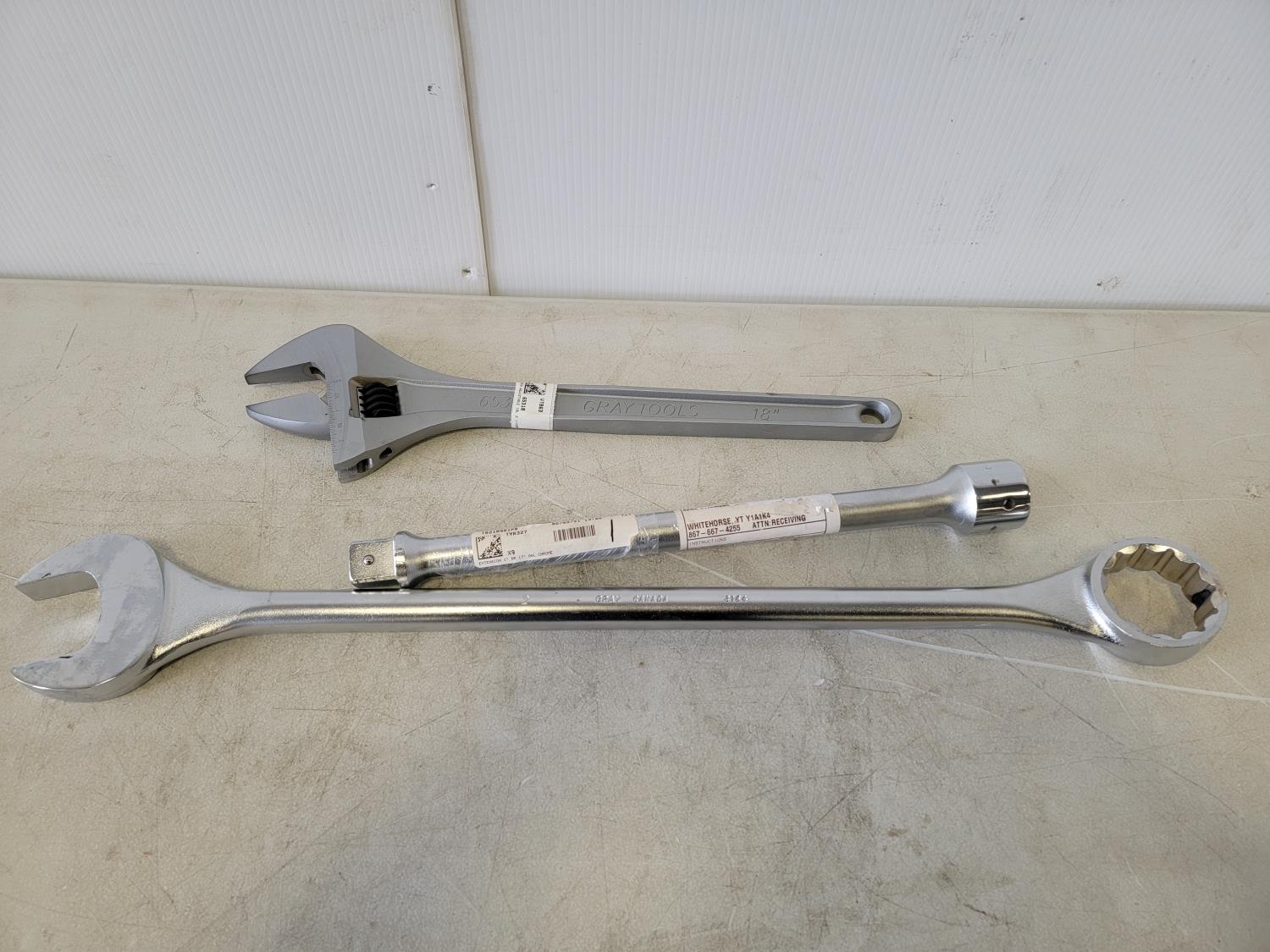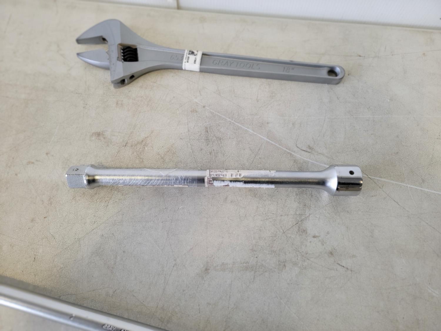 2 inch combination wrench 27-1/2 inch long, 1 inch drive 17 inch long extension bar, 18 inch adjustable wrench