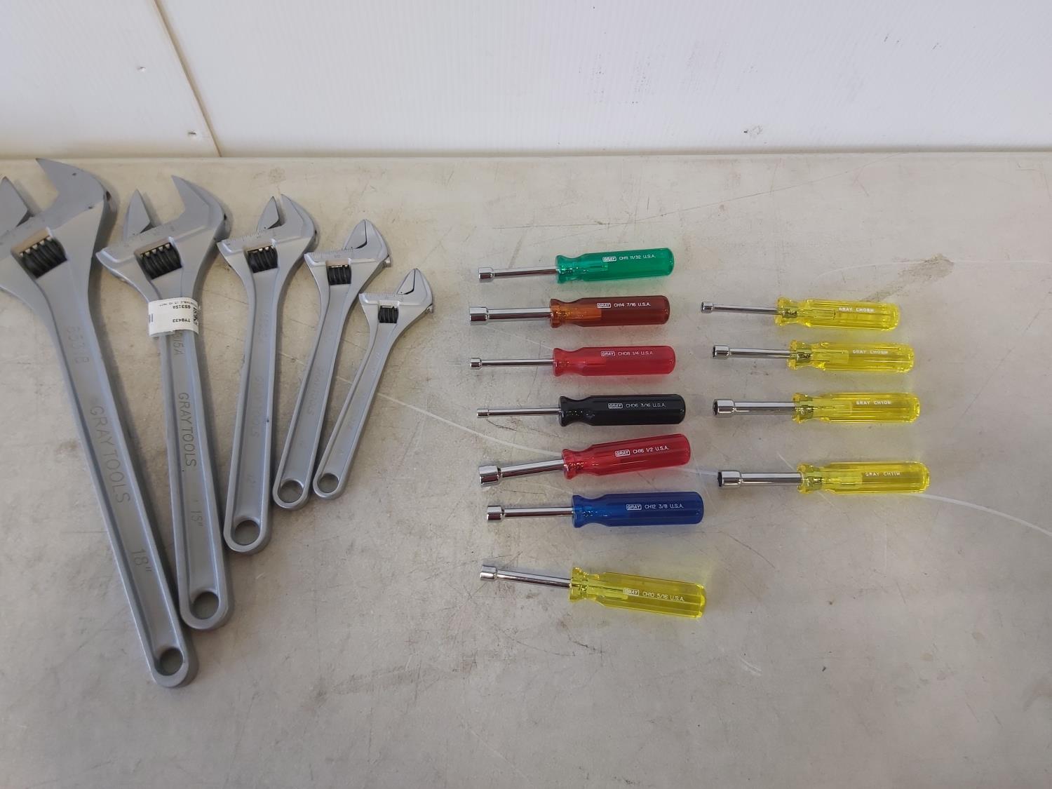 (7) SAE nut drivers 11/32, 7/16, 1/4, 3/16, 1/2, 3/8, 5/16, (4) metric nut drivers 6 mm, 8 mm, 10 mm, 11 mm, (5) adjustable wrenches 8 inch, 10 inch, 12 inch, 15 inch, 18 inch