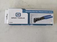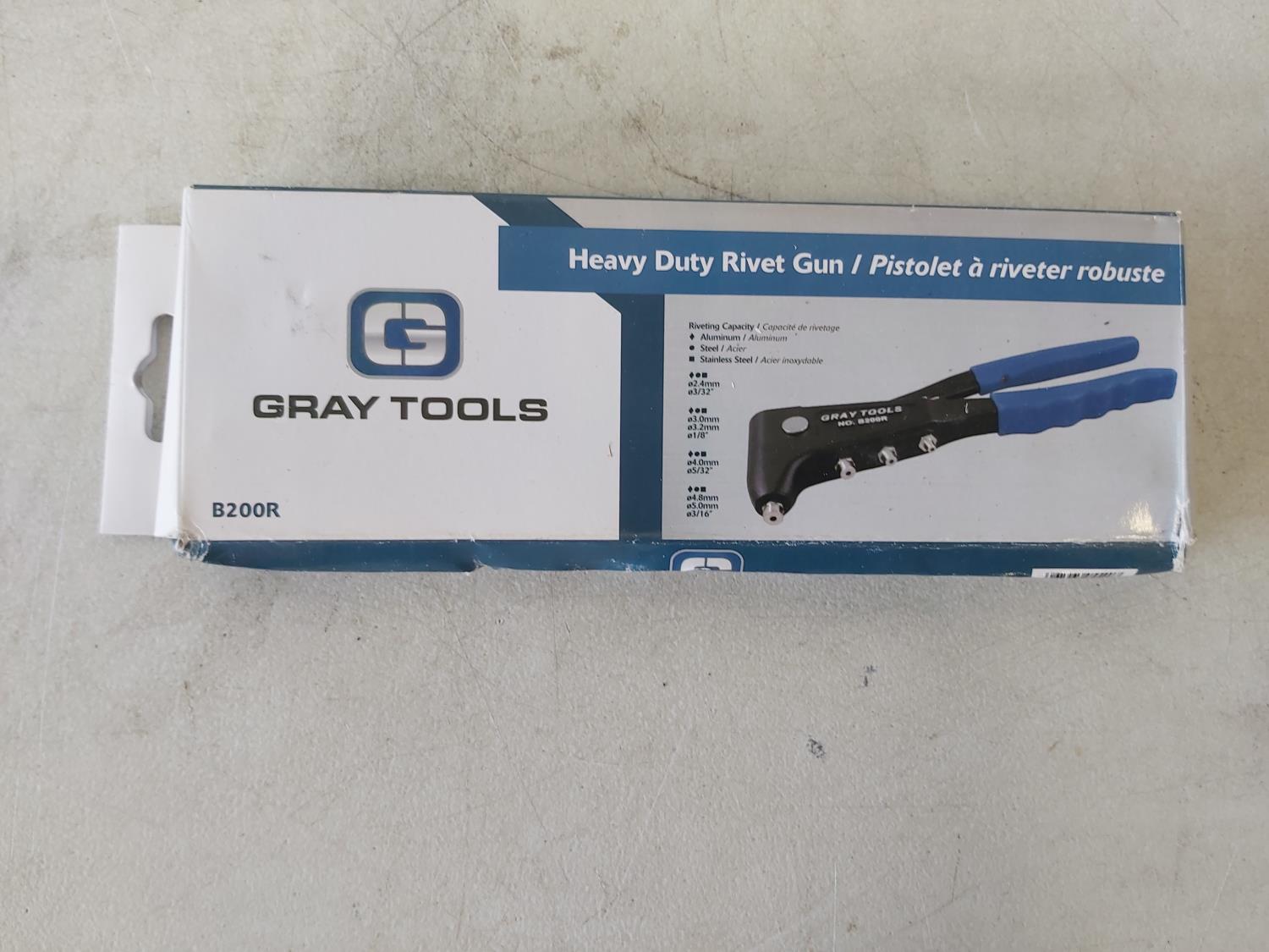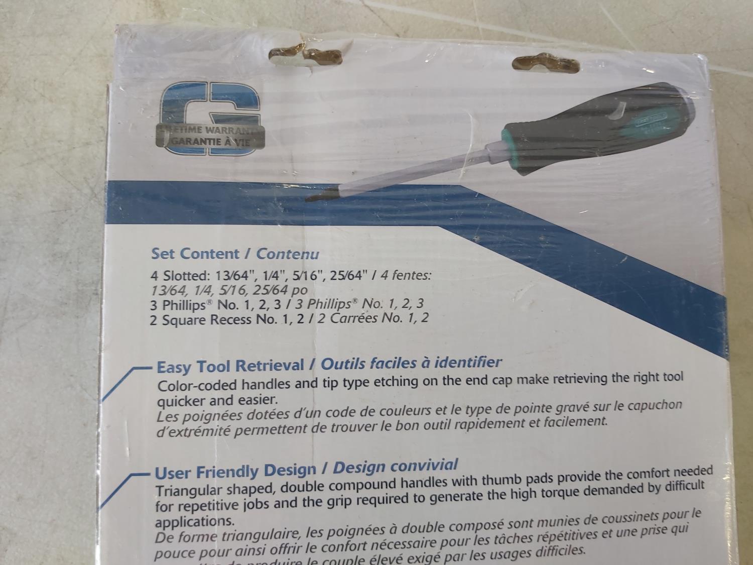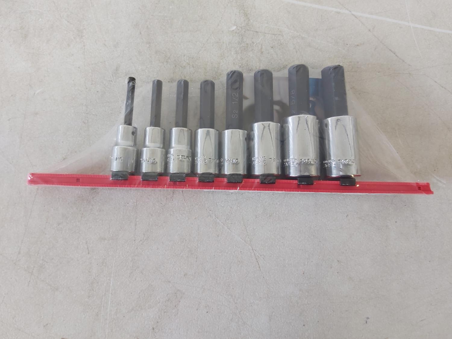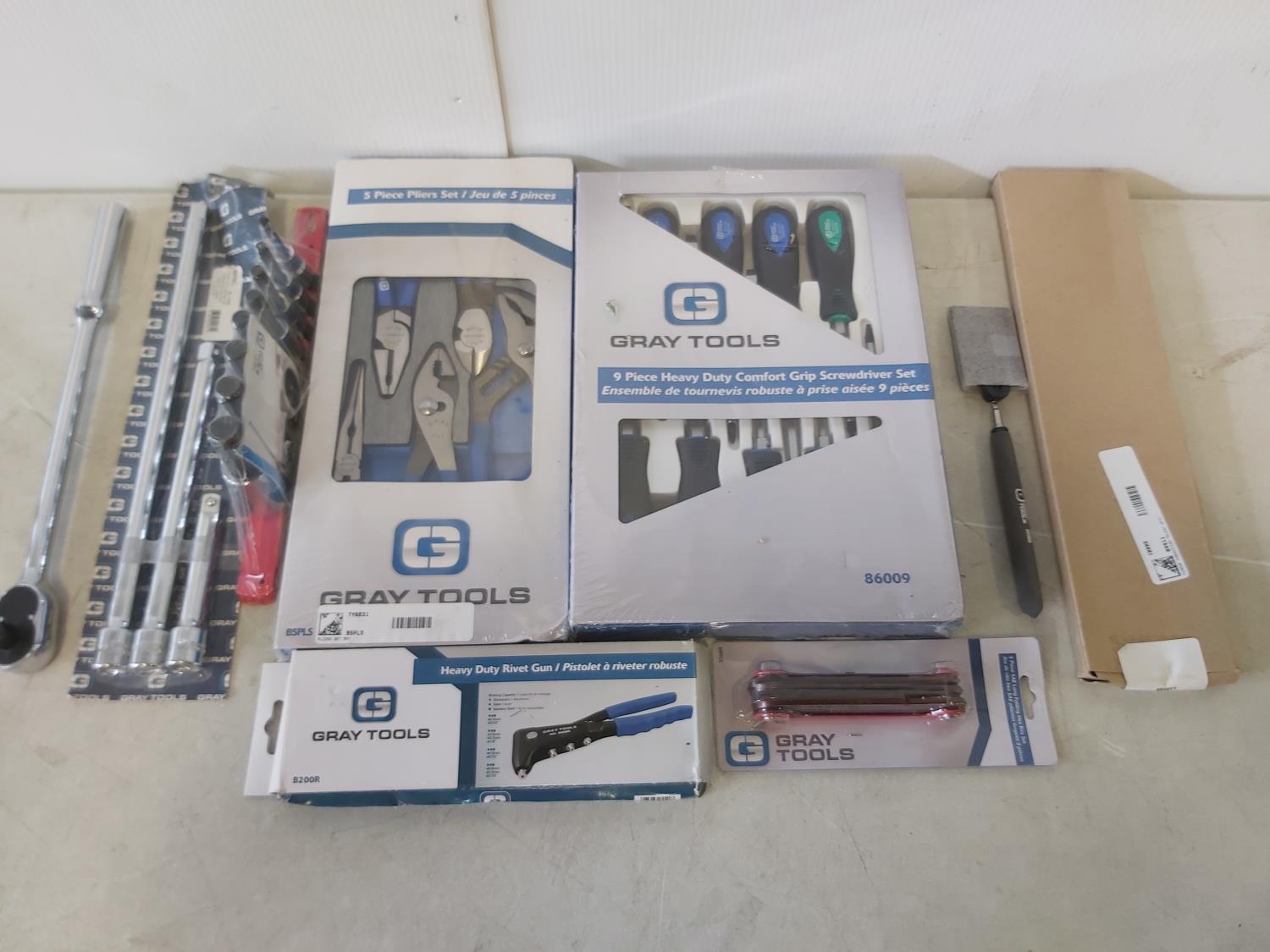 9 piece heavy duty screwdriver set, 5 piece plier set, heavy duty rivet gun, 5 piece SAE hex set, (2) extendable telescopic mirrors, 8 piece 1/2 inch drive sockets (hex head), 1/2 inch drive ratchet, (3) extension bars