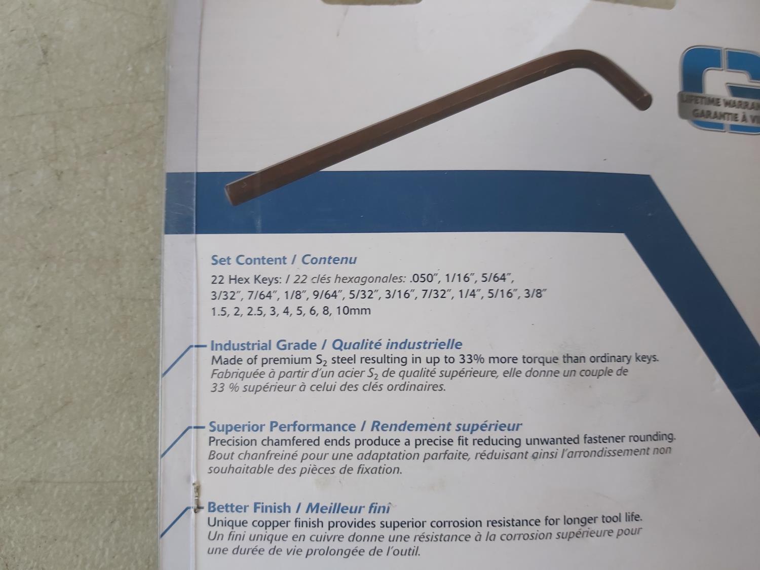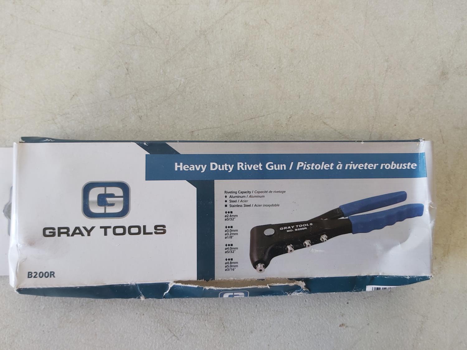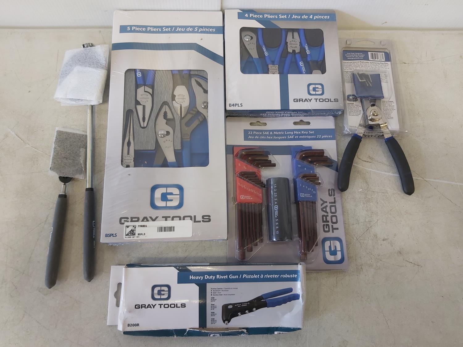 Heavy duty rivet gun, 22 piece SAE and metric hex key set, snap ring pliers, 4 piece plier set, 5 piece plier set, (2) extendable inspection mirrors