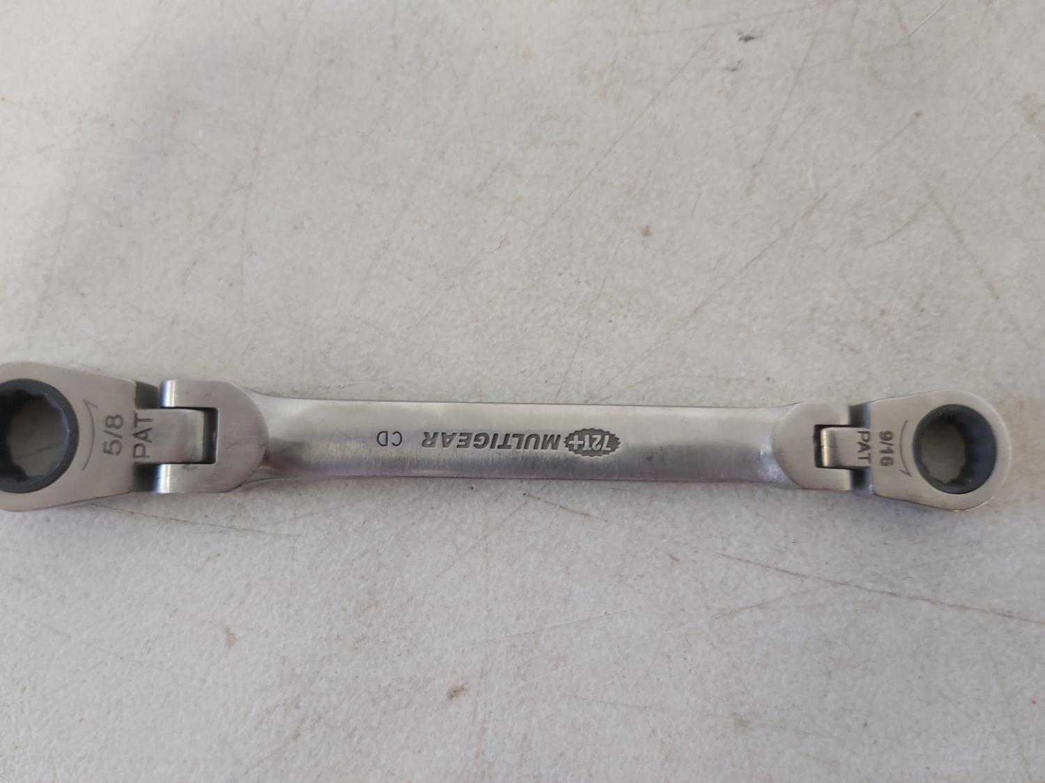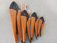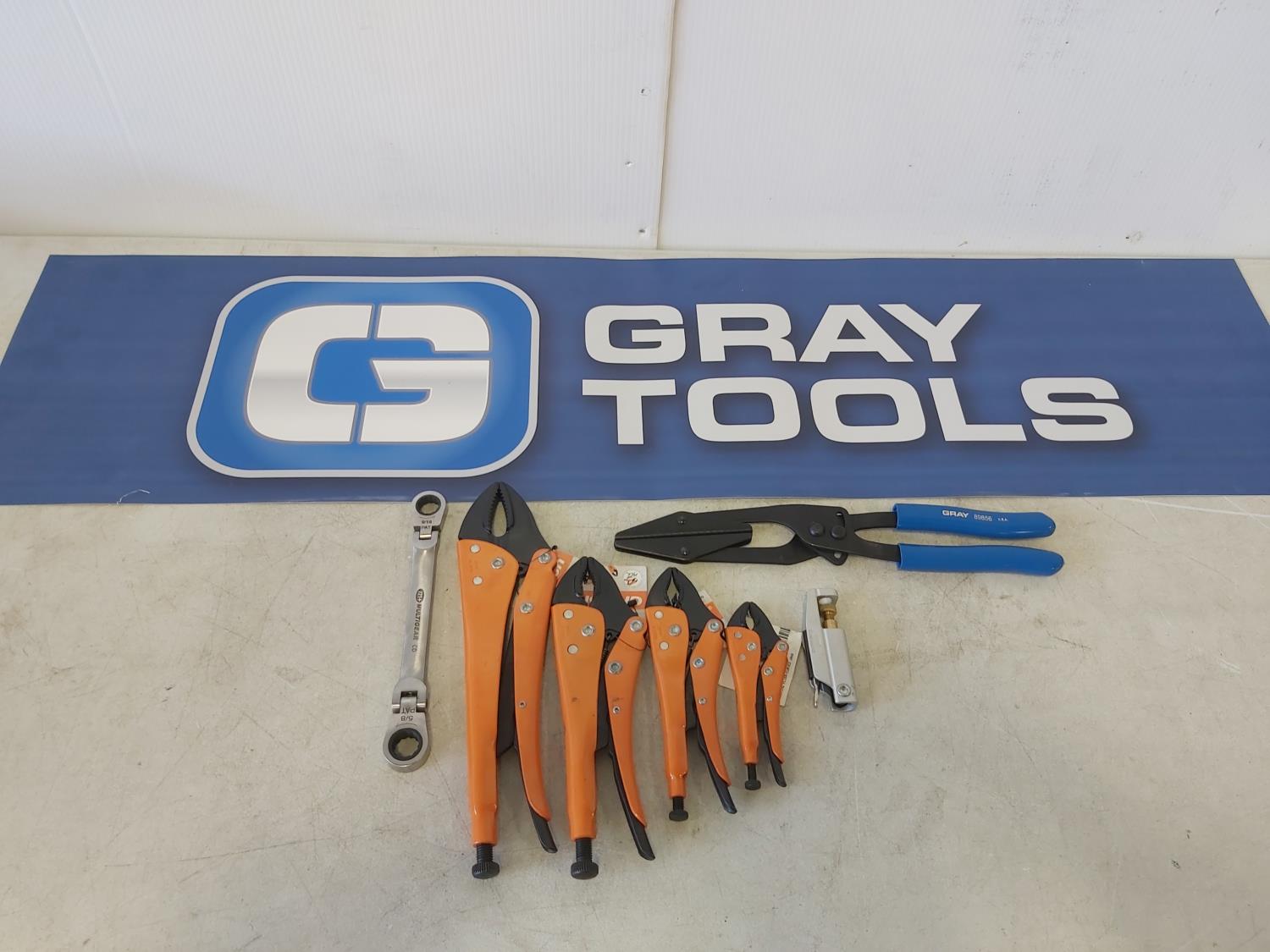 (4) Grip-on vise grip pliers, micro grip 2000 clamp, 14 inch hose pliers, 9/16 / 5/8 ratchet wrench, Gray Tools sign