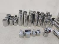 (30) 1/2 inch drive metric sockets sized from 13 mm to 21 mm, (23) SAE 1/2 inch drive sockets sized from 3/8 inch to 1-1/2 inch, 1/2 inch drive ratchet, (3) various length 1/2 inch drive extensions, (5) attachments