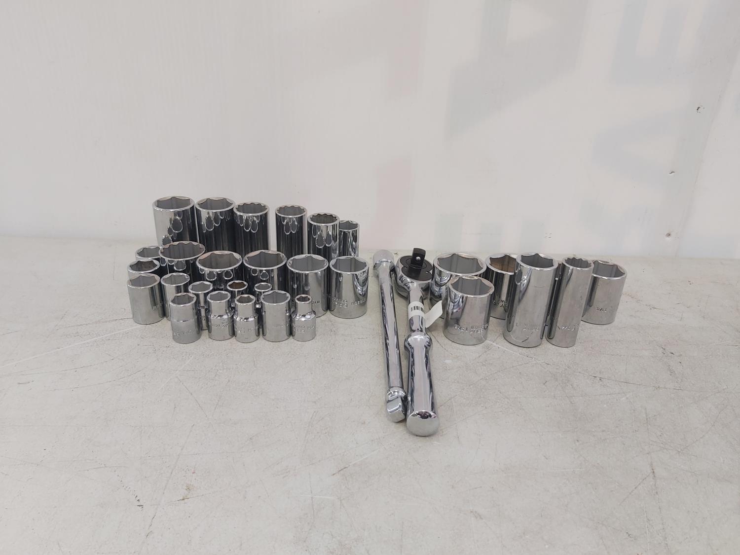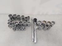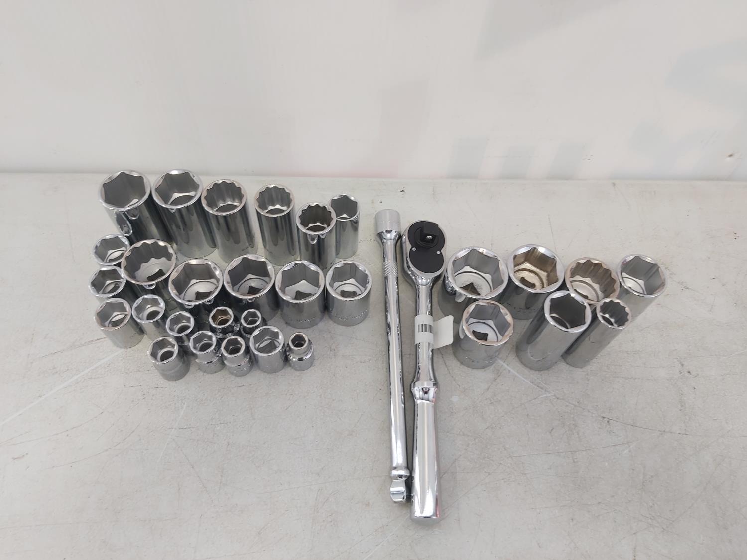 (23) 1/2 inch drive metric sockets sized from 10 mm to 32 mm, (7) 1/2 drive SAE sockets sized from 3/4 inch to 1-1/2 inch, 1/2 inch ratchet, 1/2 inch drive 10 inch extension