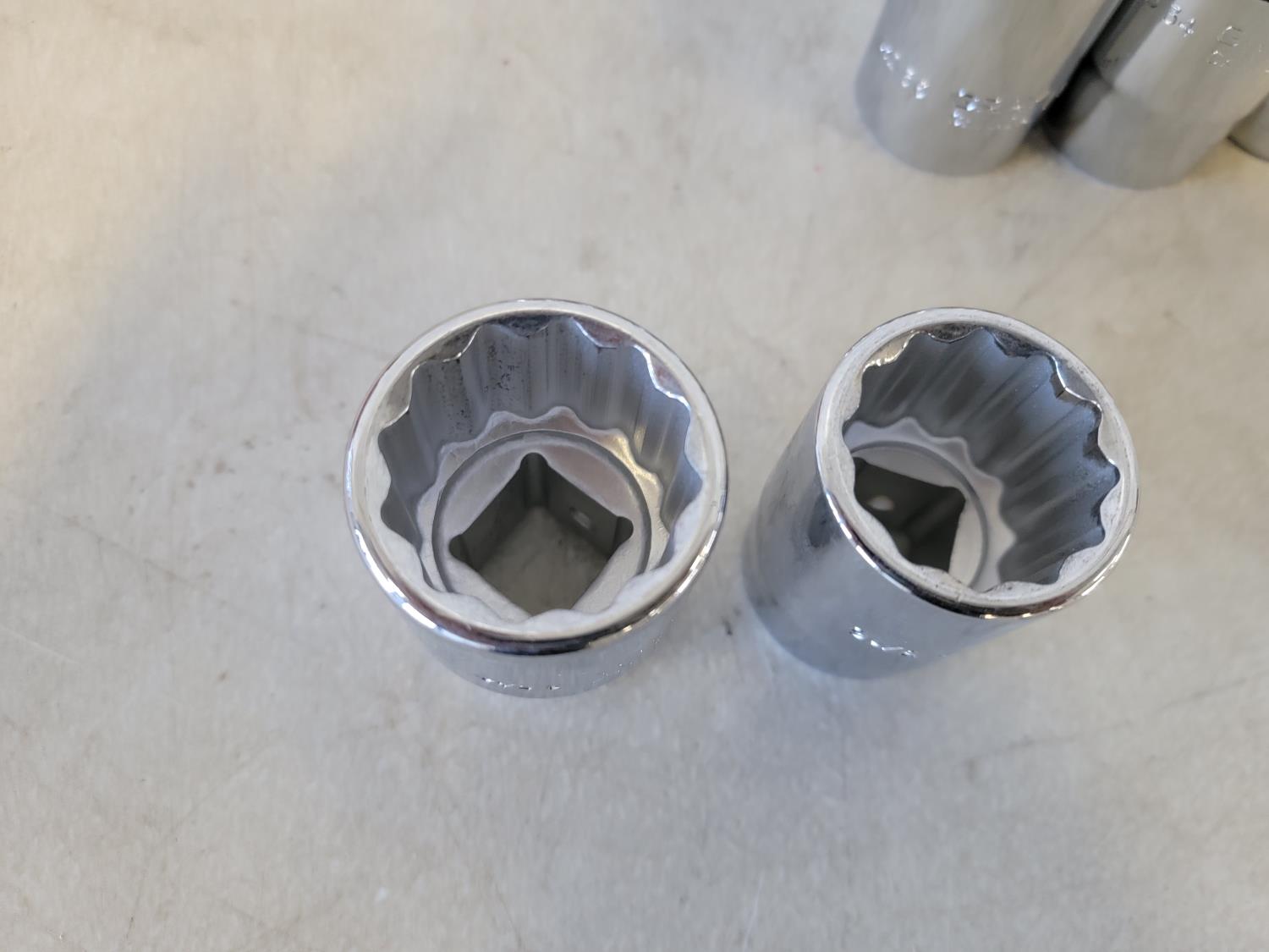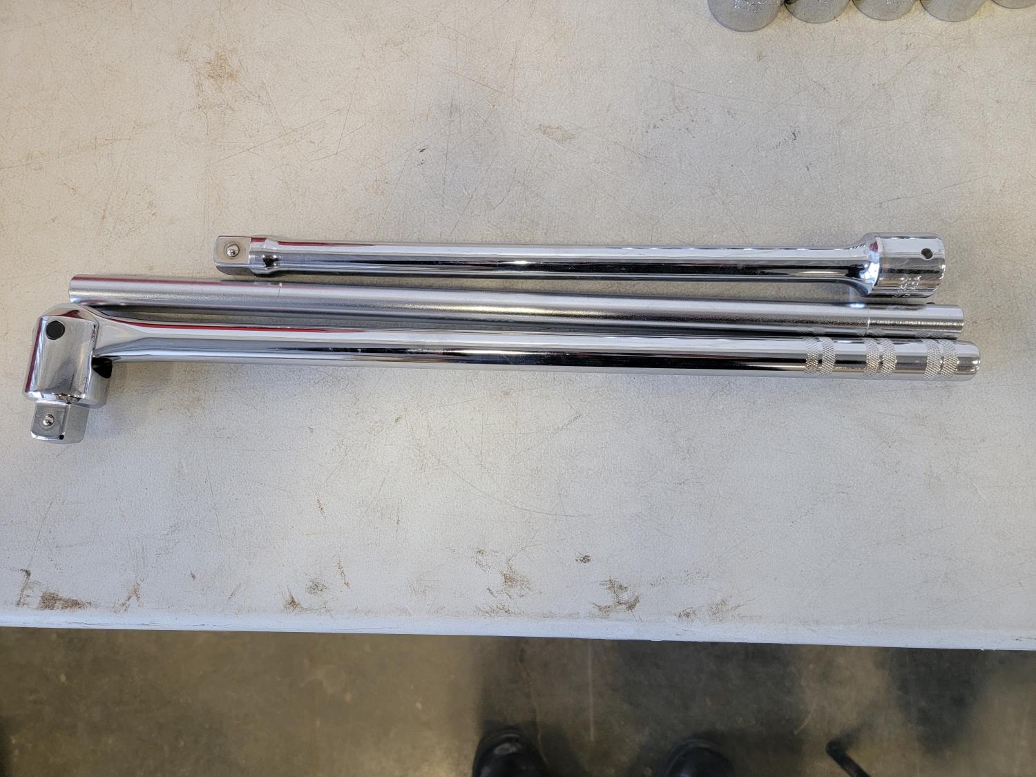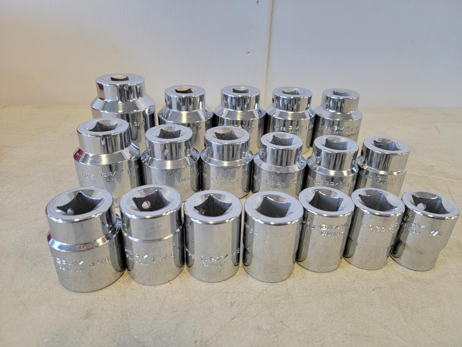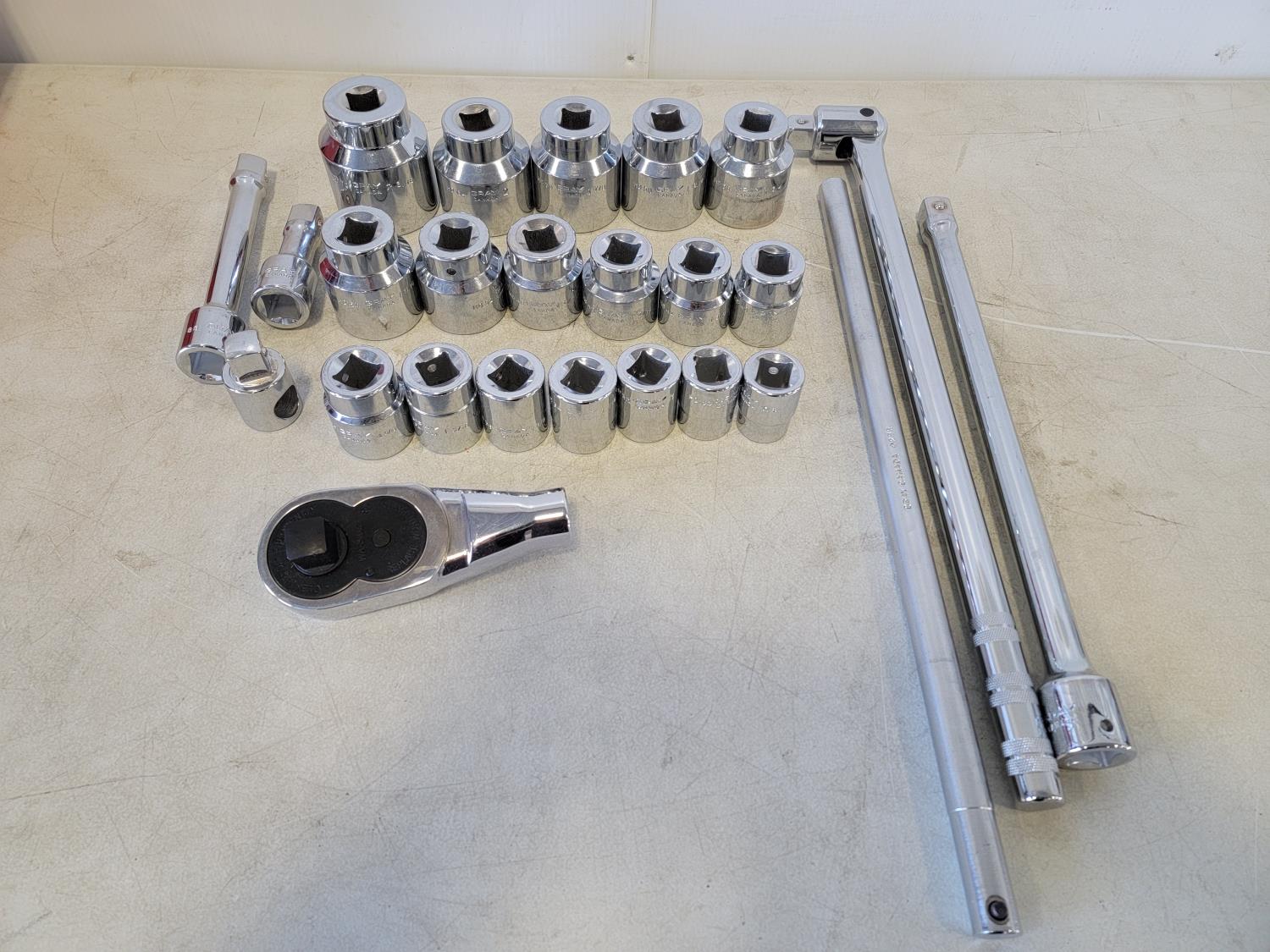 Toolbox 21 inch x 8-1/2 inch x 8-1/2 inch, 3/4 inch drive SAE ratchet, (18) sockets 7/8 inch - 2-3/16, extensions