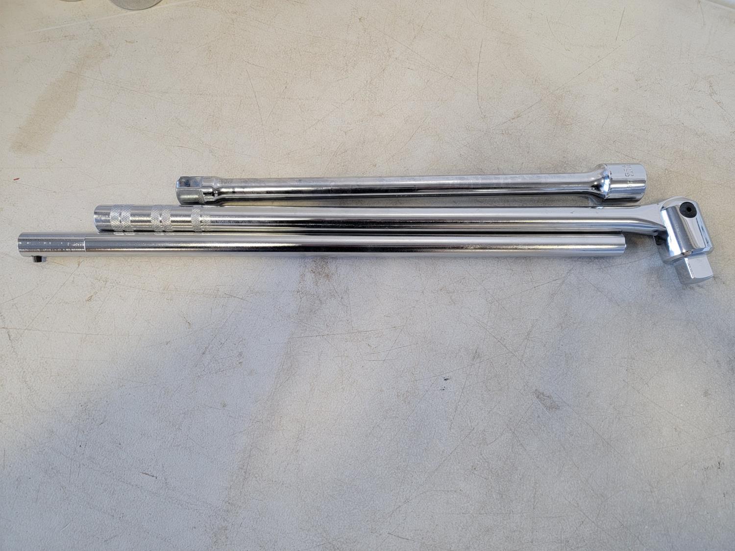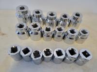 Toolbox 21 inch x 8-1/2 inch x 8-1/2 inch, 3/4 inch drive SAE ratchet, (18) sockets 7/8 inch - 2-3/16, extensions