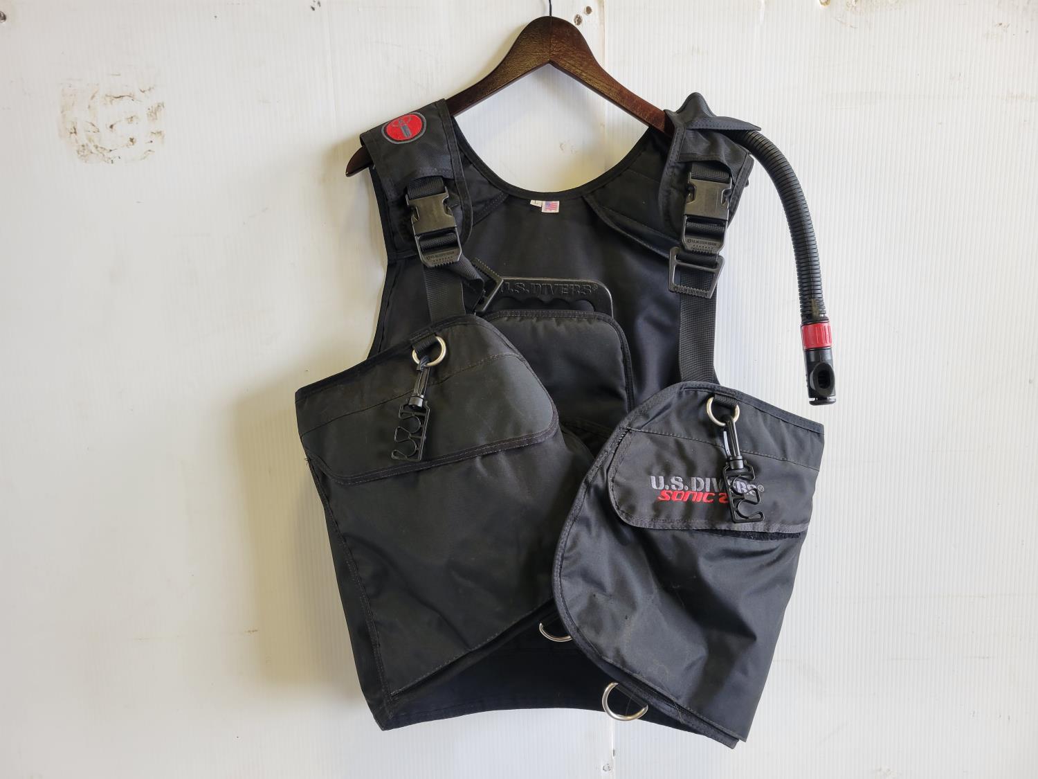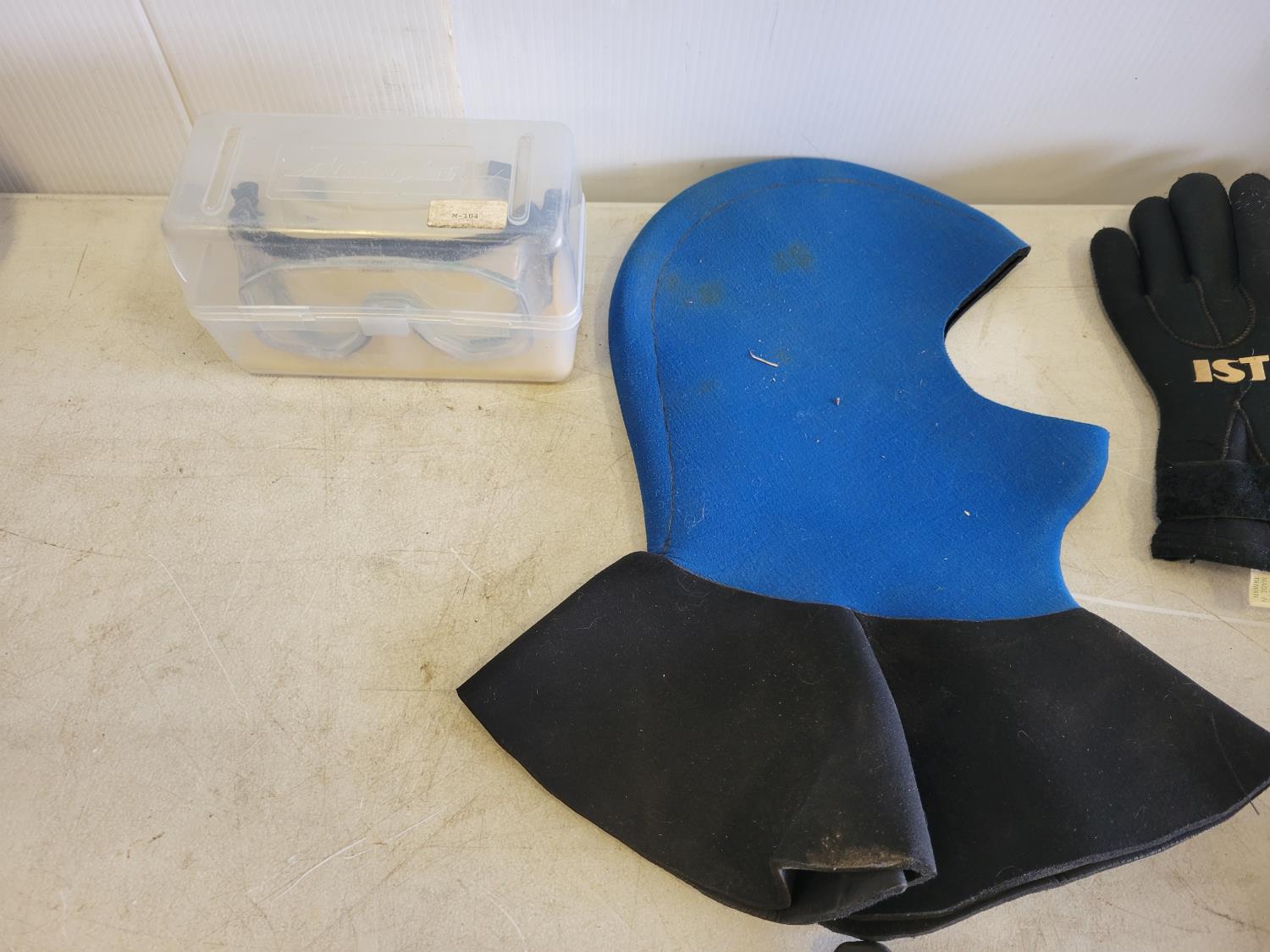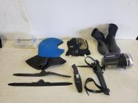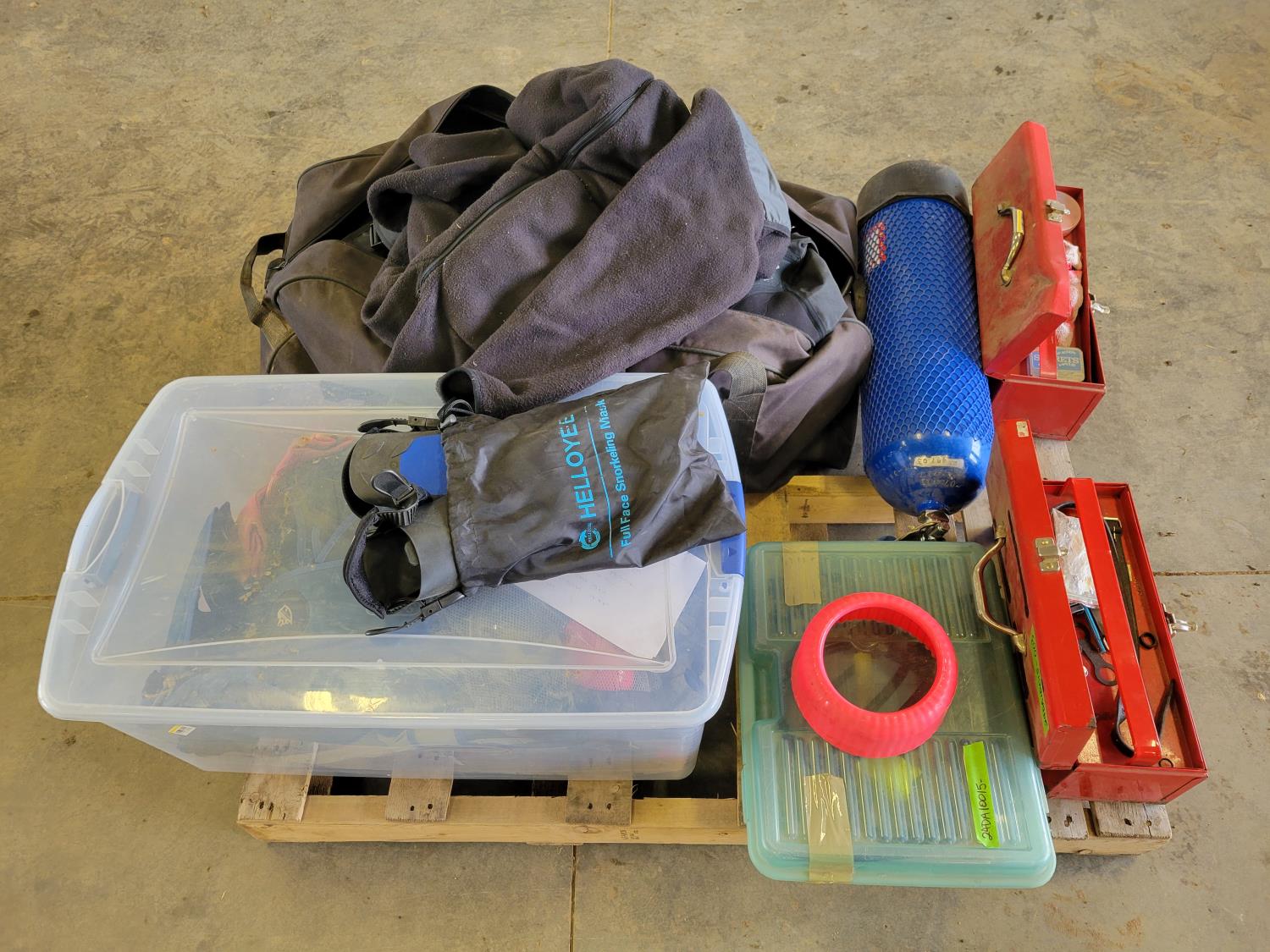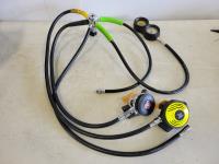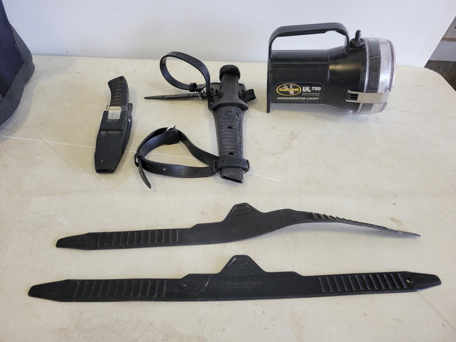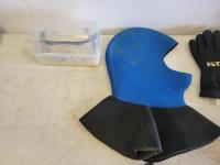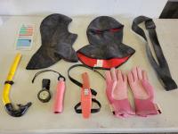 Wetsuits, men's dry scuba suit, (2) buoyancy compensators, 80 cu ft aluminum tank, assorted diving gear, diving mask, knives, flashlight, weights