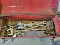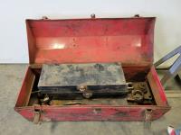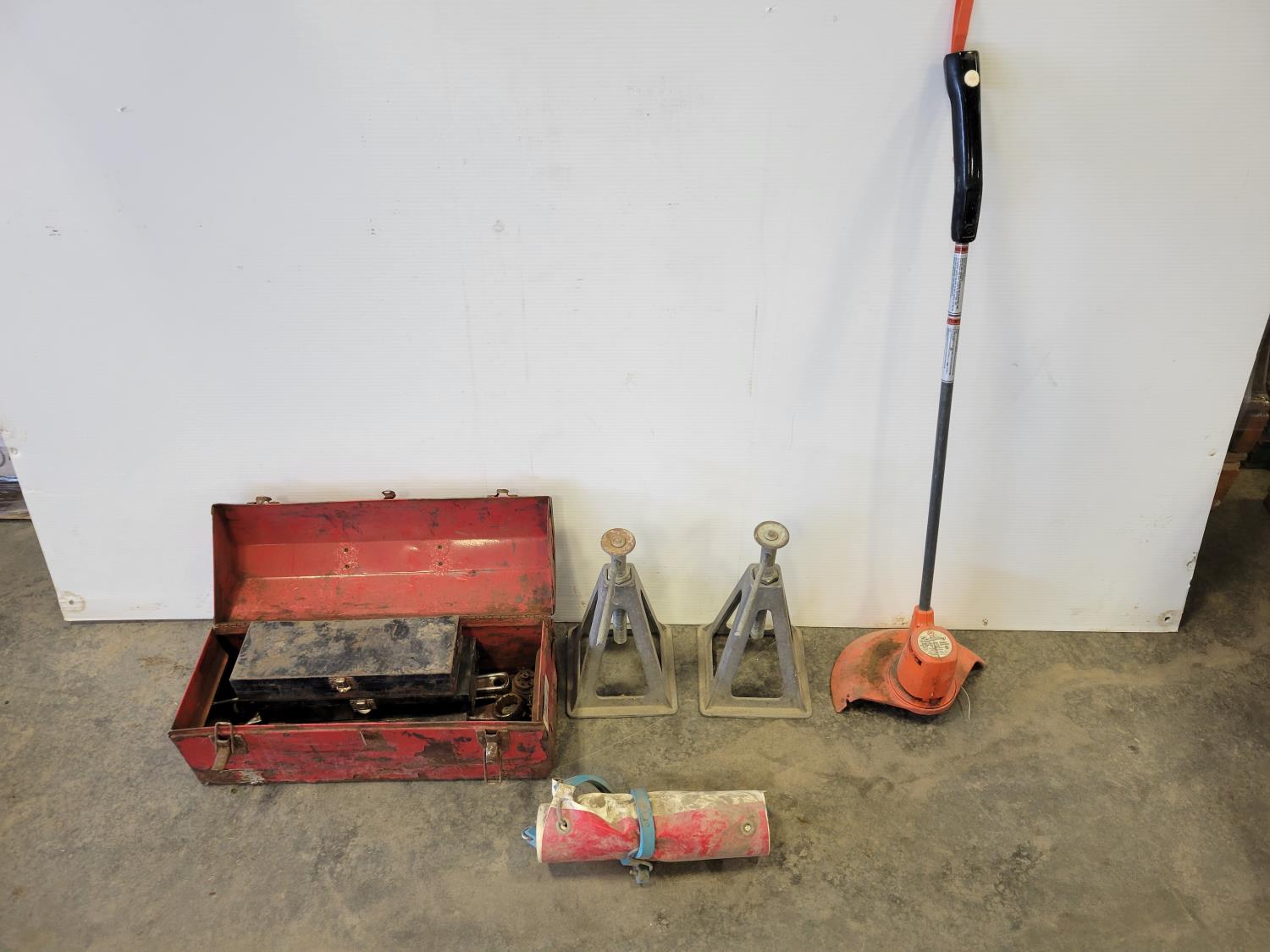 (2) camper jacks, toolbox with contents, 120V Black & Decker Whipper Snipper weed trimmer,