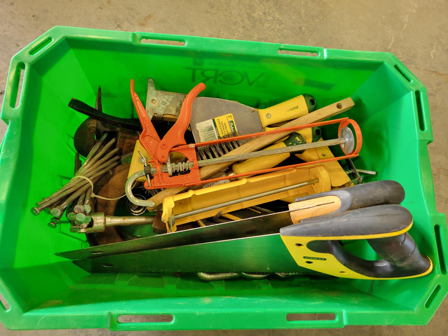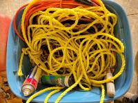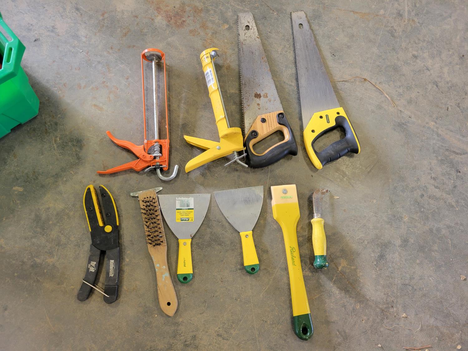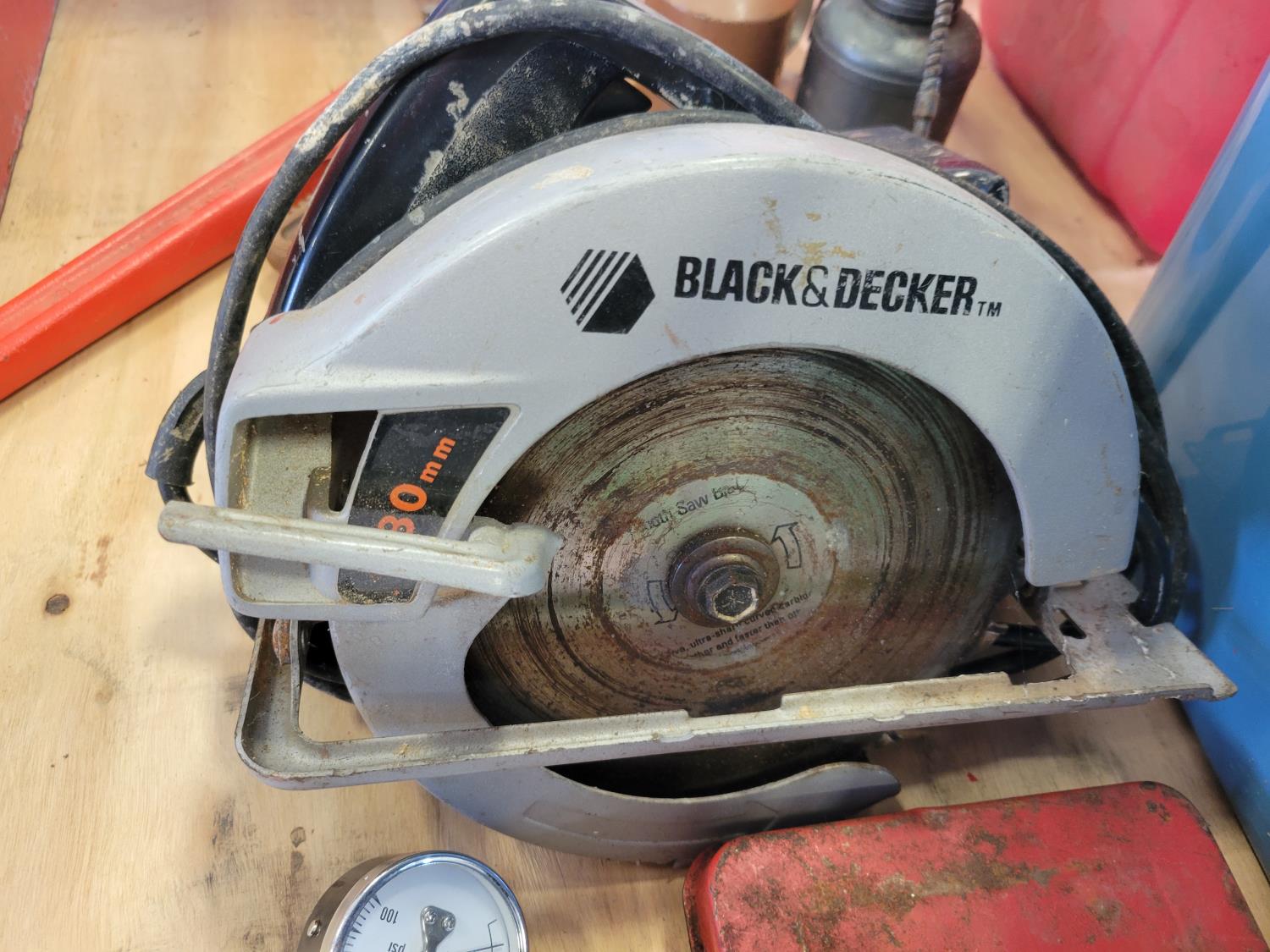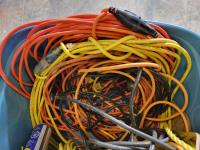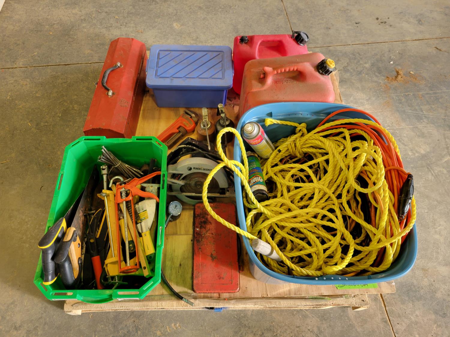 (2) jerry cans, hand tools, extension cords, Black & Decker circular saw, socket set, extension cords