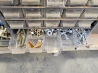 Toolbox with contents, 38 slot small bolt bin, various sockets and wrenches, crowbars, Lincoln grease gun, utility tire