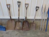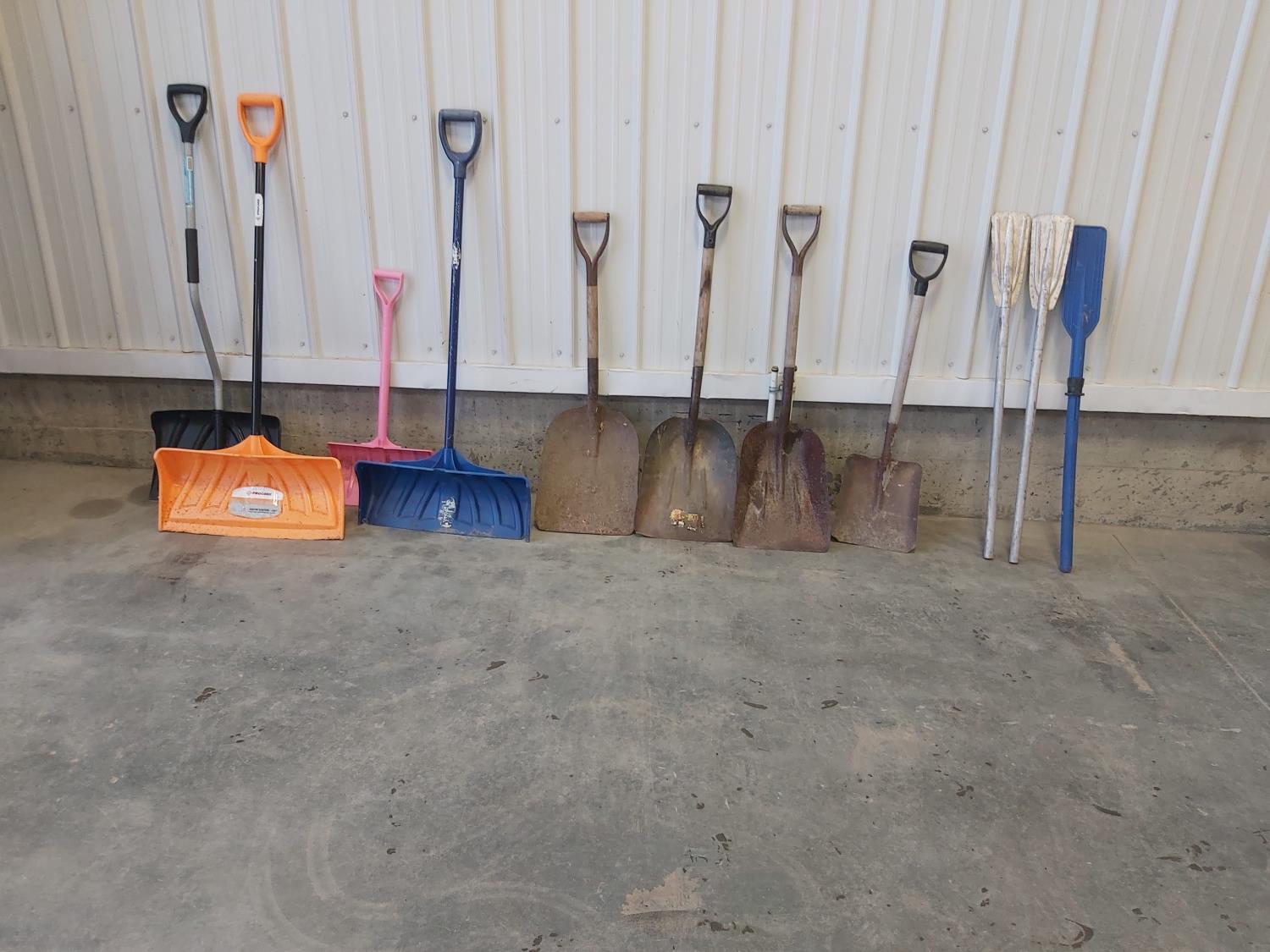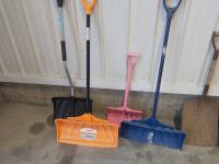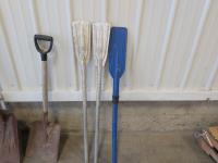 (3) oars, (4) shovels, (3) snow shovels, children's snow shovel