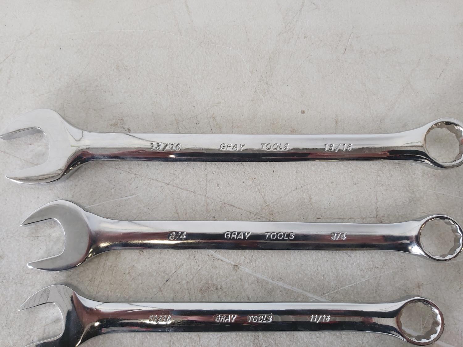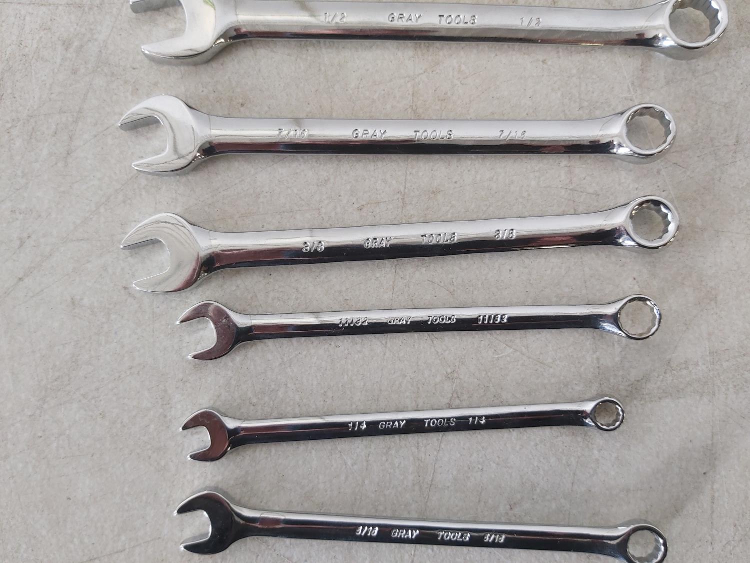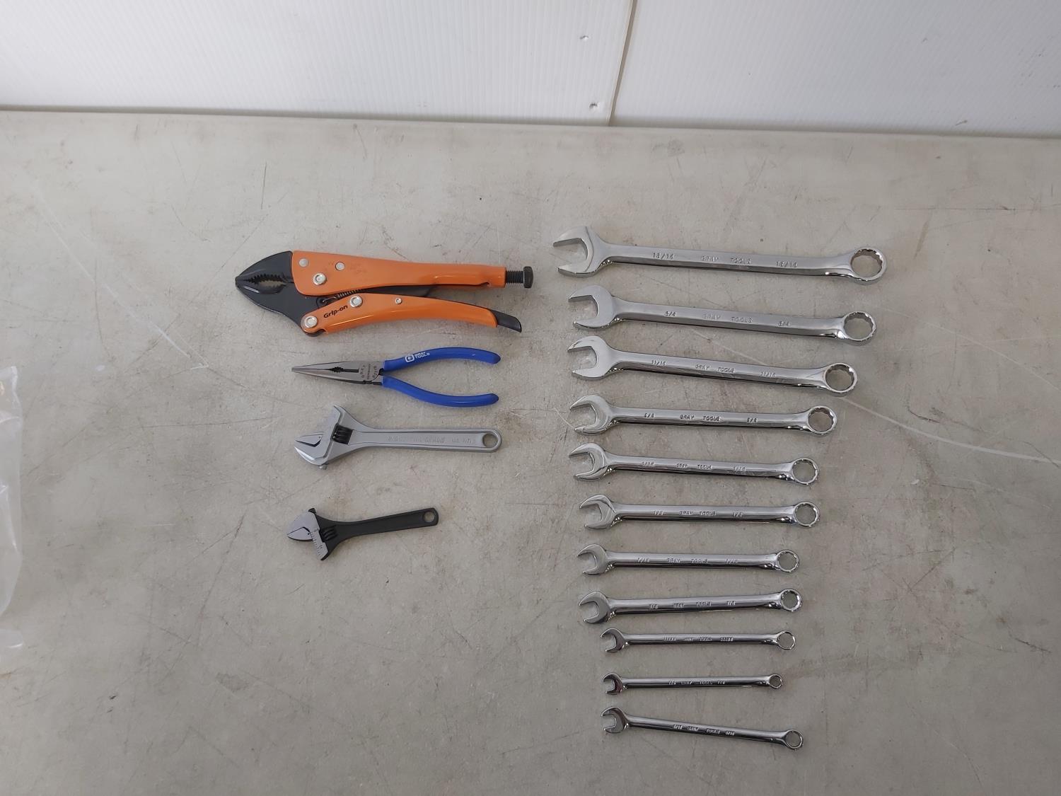 9 inch Grip-on vise grip pliers, (2) small adjustable wrench, small needle nose pliers, (11) various SAE combination wrenches