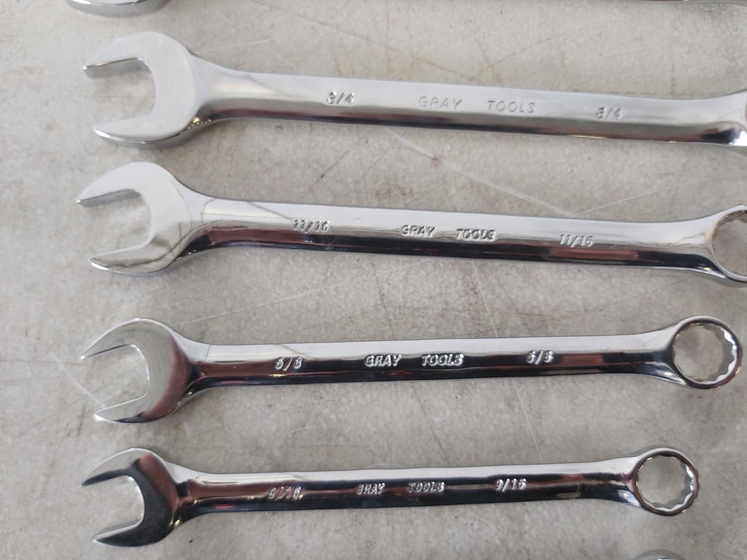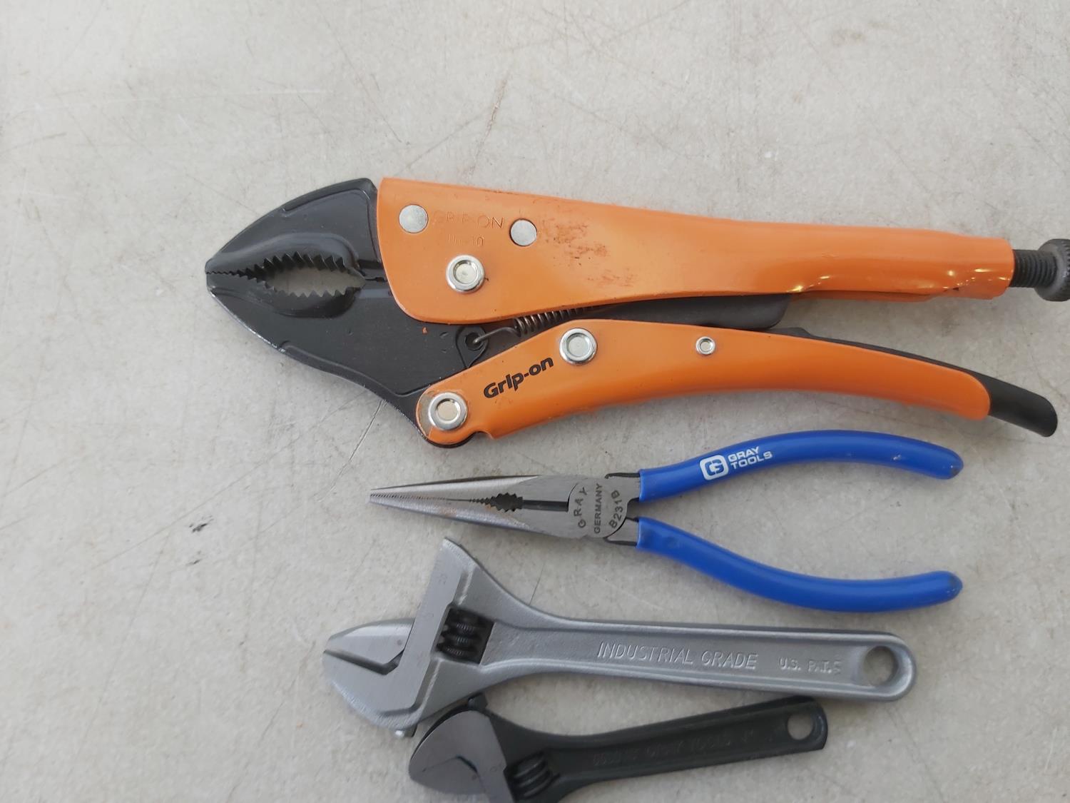 9 inch Grip-on vise grip pliers, (2) small adjustable wrench, small needle nose pliers, (11) various SAE combination wrenches