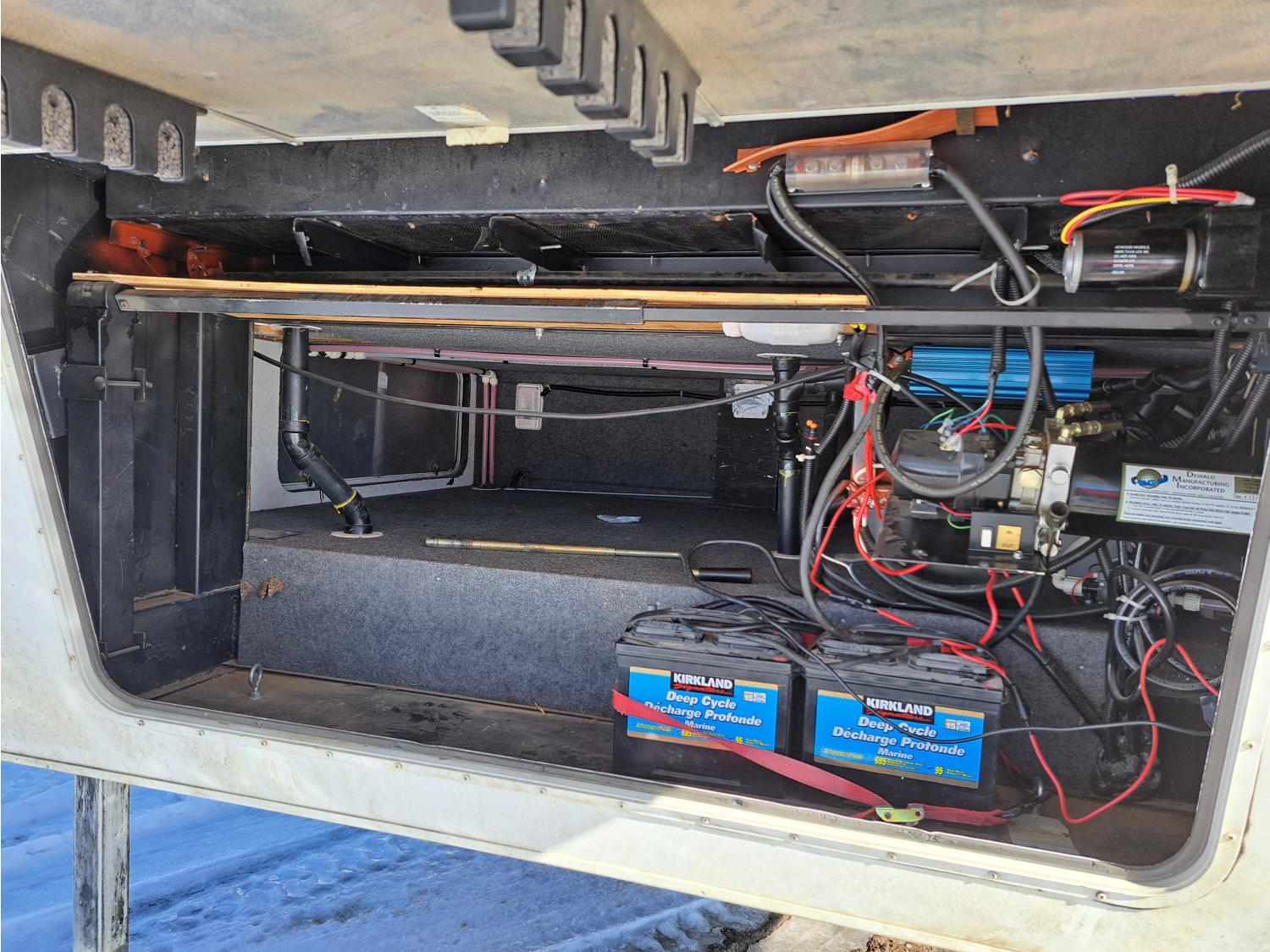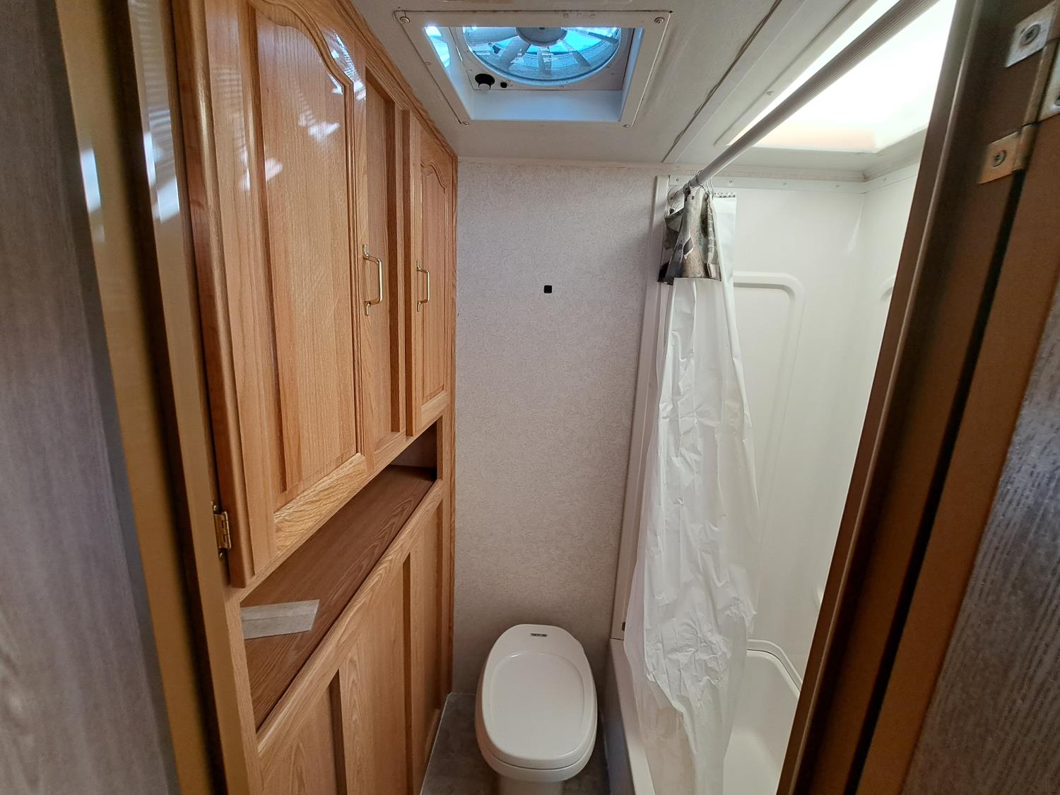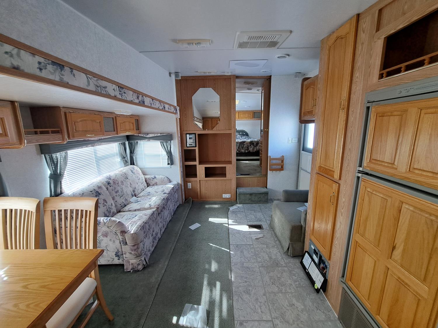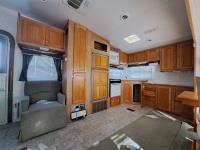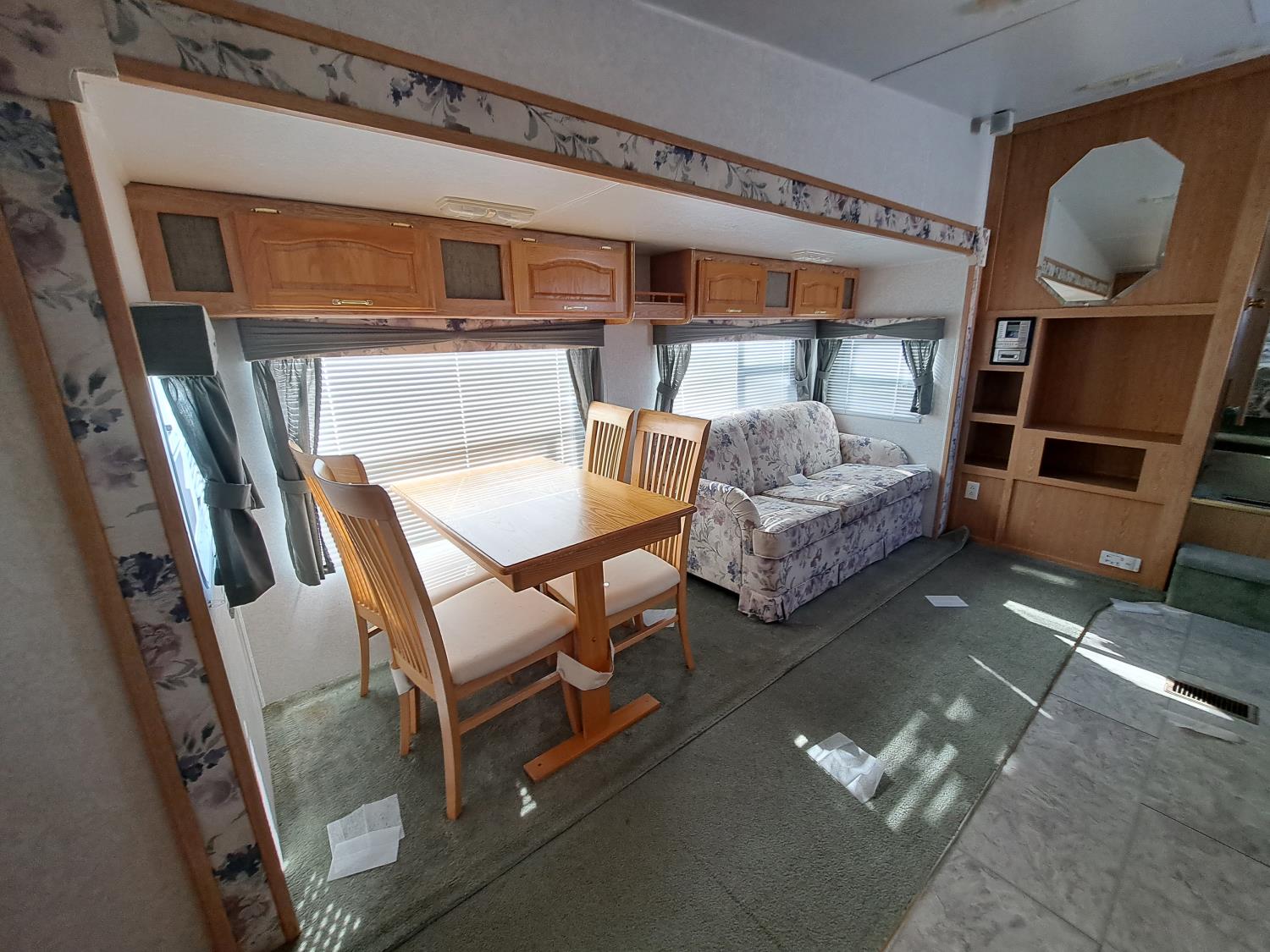 large slide out, 6 inch frame lift, winterized, large bottle tie in, new spare tire, ST225/75R15 tires, 100 watt solar panel, 3000 inverter, upgraded flooring, fridge, stove, microwave, kitchen sink, shower/tub, separate bathroom sink, queen master bed, CD/tape stereo