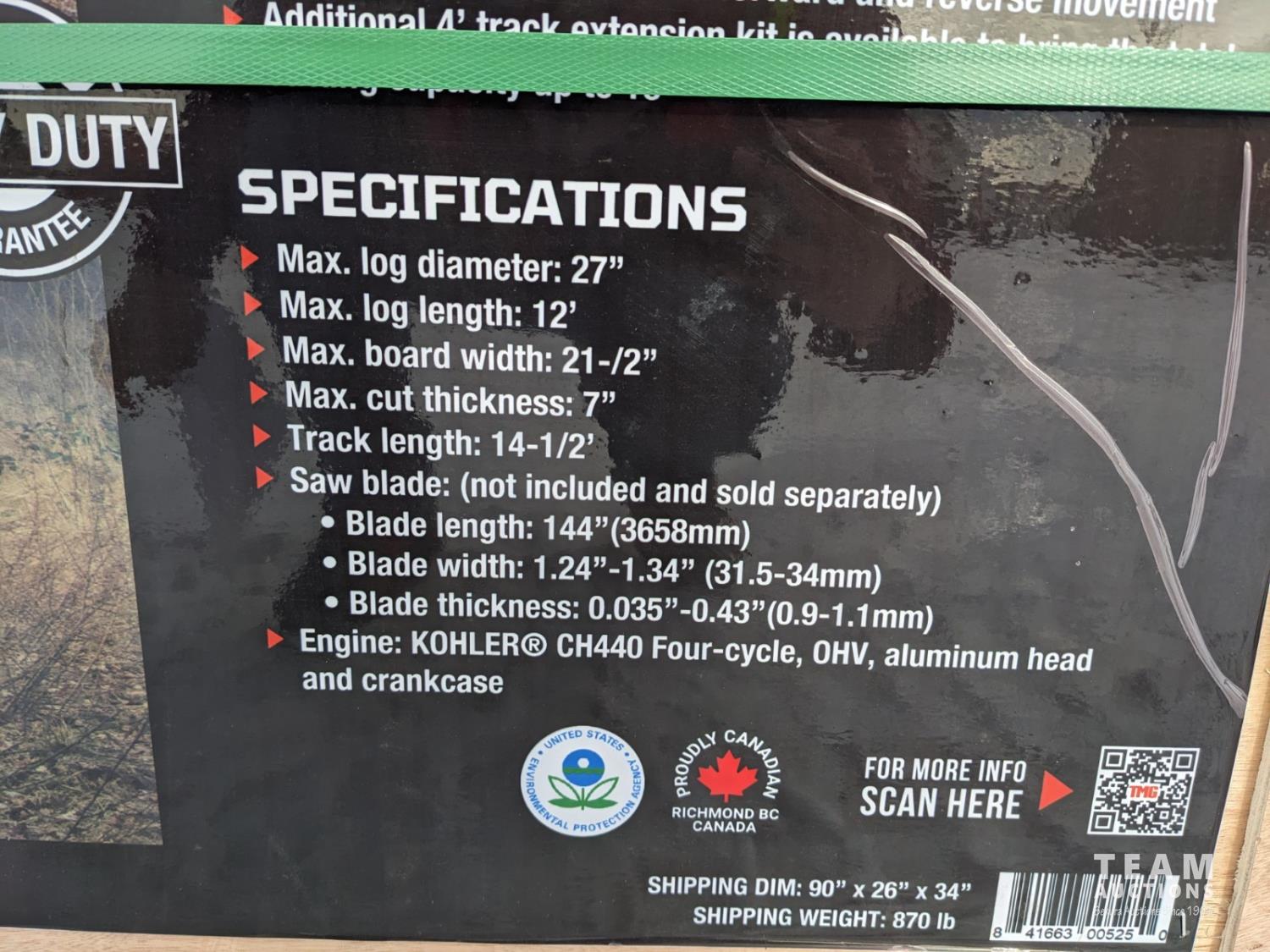 14 HP Kohler Gas Engine, 21 inch Board Width, 12 ft Log Length, 14-1/2 ft Track Bed