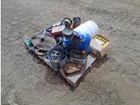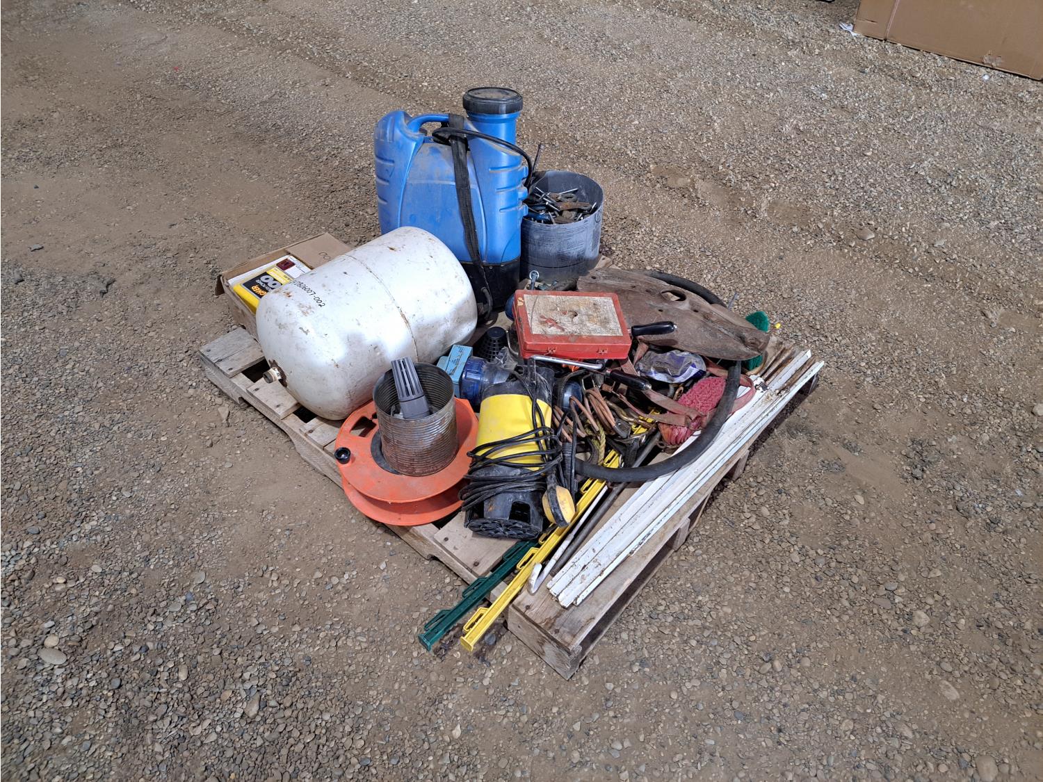battery operated back sprayer, small sump pump, hydraulic hose, parts for electric fence, bucket of 5/16 screws