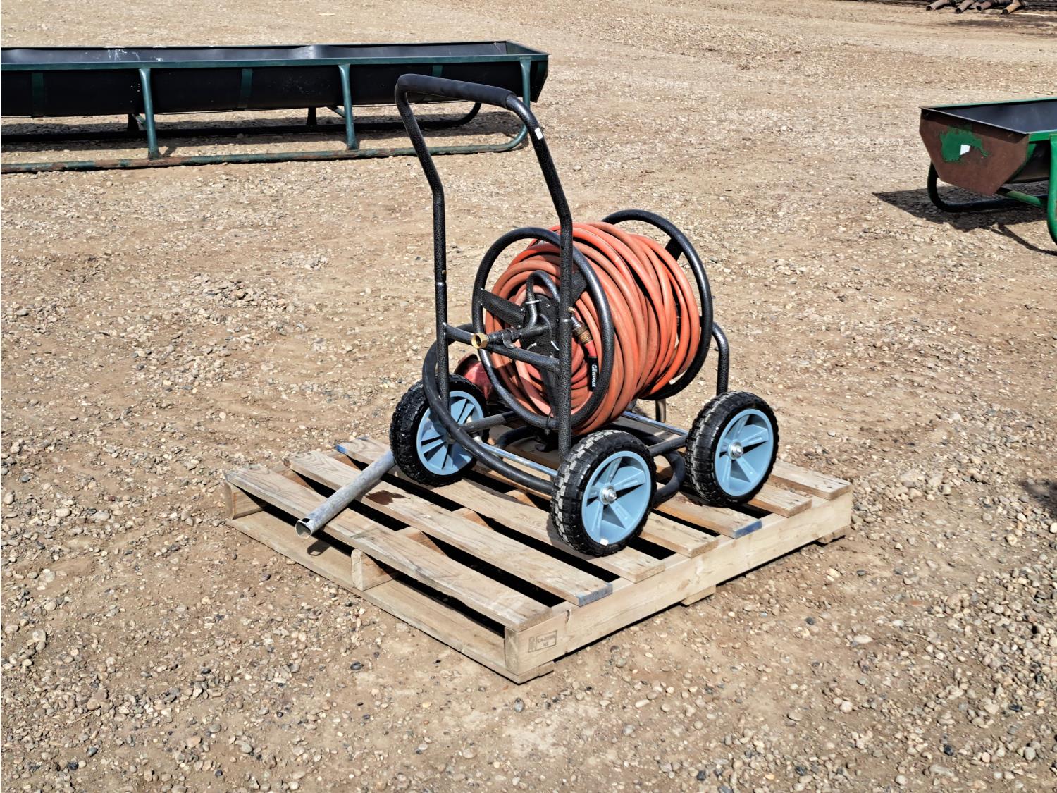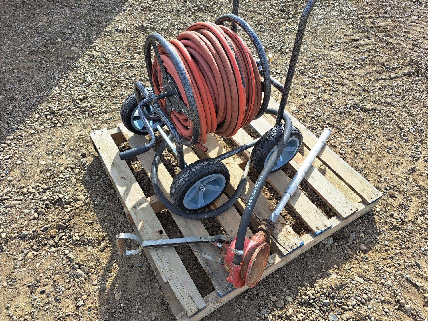 676 High Capacity Hand Fuel Pump and Garden Hose Caddy with Approximately 100 Ft of Hose