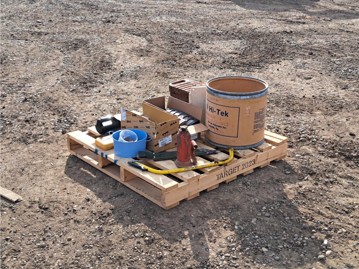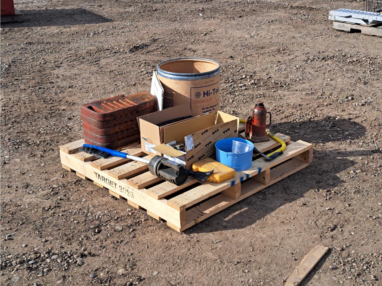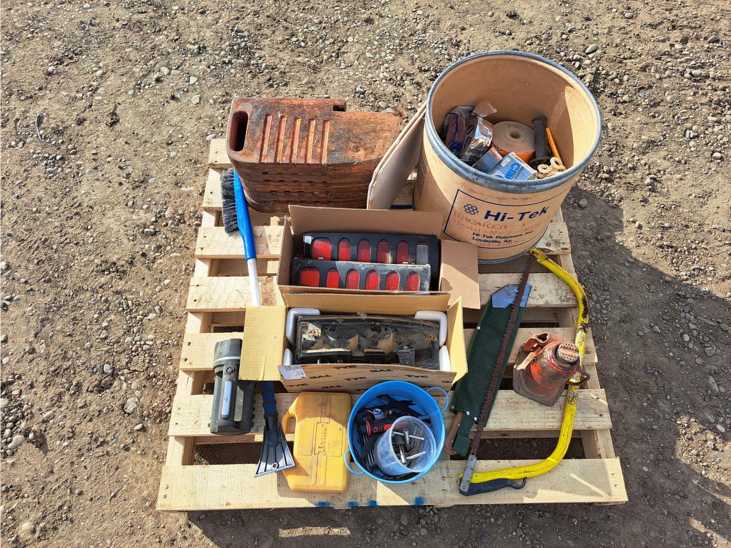 hydraulic jack, 1998 GMC tail lights, saw, tractor weights and miscellaneous