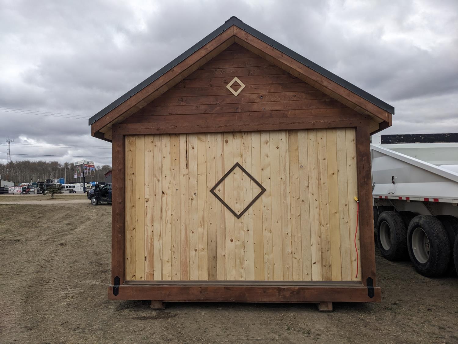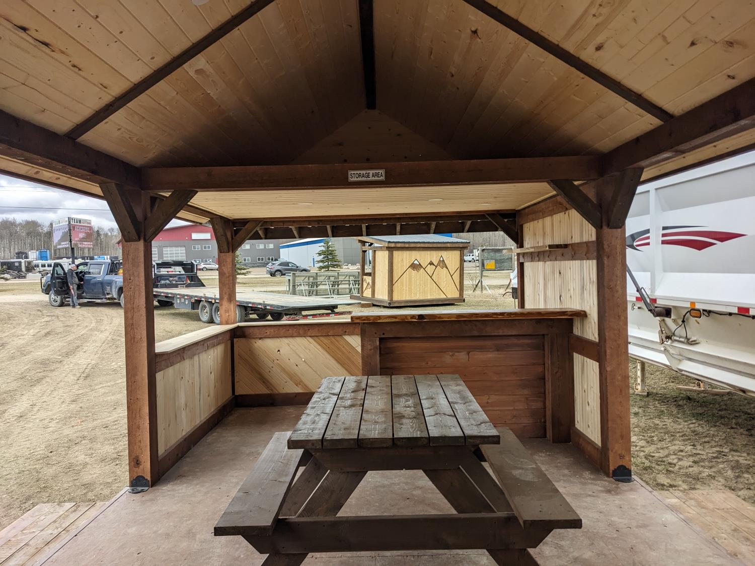 timber structure, metal roof, loft storage, pot lights and outlets wired for generator hookup, kitchen sink, comes with picnic table (2) chairs, and propane firepit