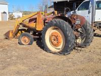 Ezee-On loader, 60 inch bucket, Buda 4 cylinder gas engine, 43 PTO HP, 6 speed manual transmission, 540 PTO, 2 rear hydraulic outlets, rear wheel weights, 7.50-16 front tires, 14.9-38 rear tires