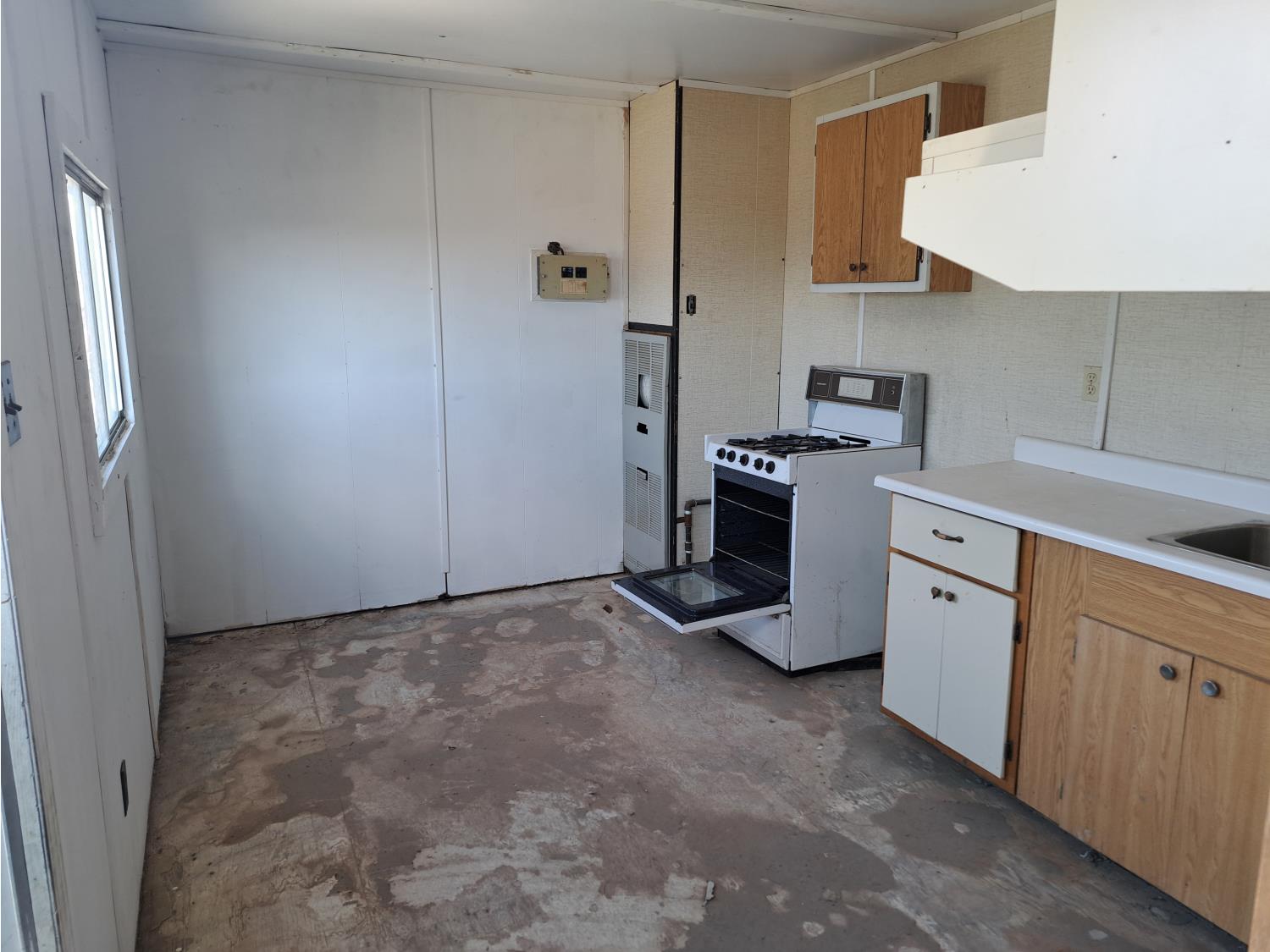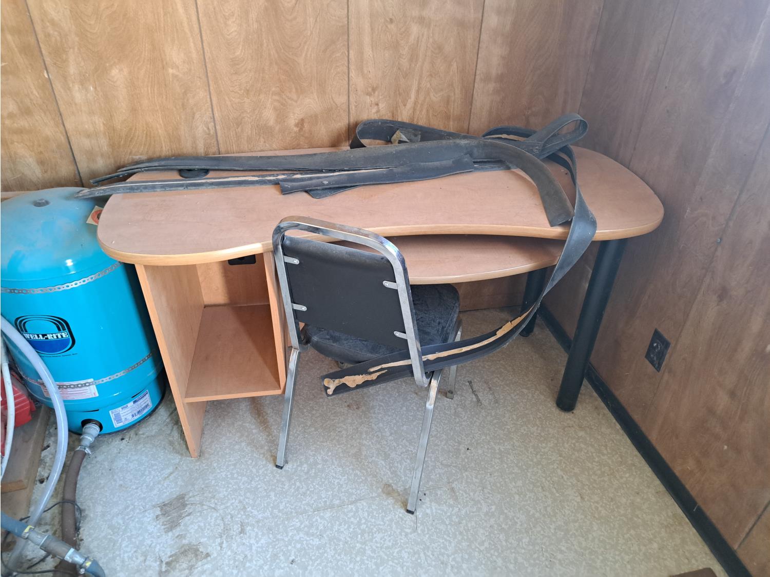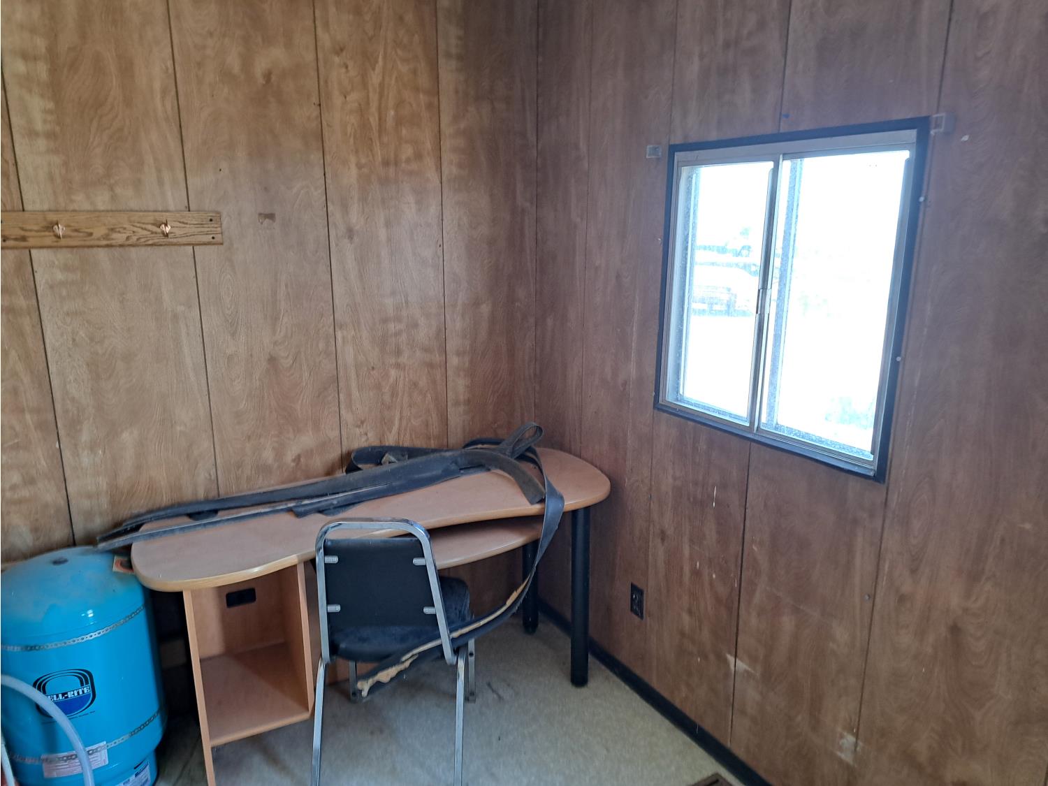 9 Ft 10 inches wide x 24 Ft long, 235/80 R16 tires, spare tire, pintle hitch, spring suspension, water tank, pressure pump, bathroom with toilet and shower, desk, furnace, sink, oven