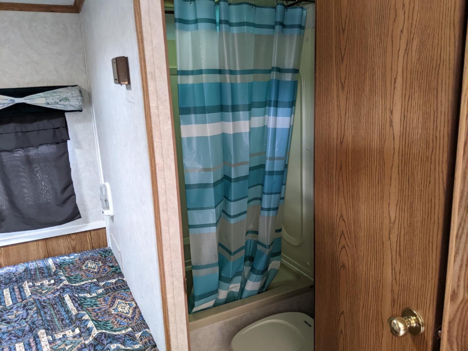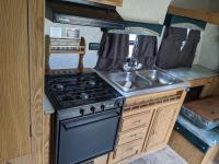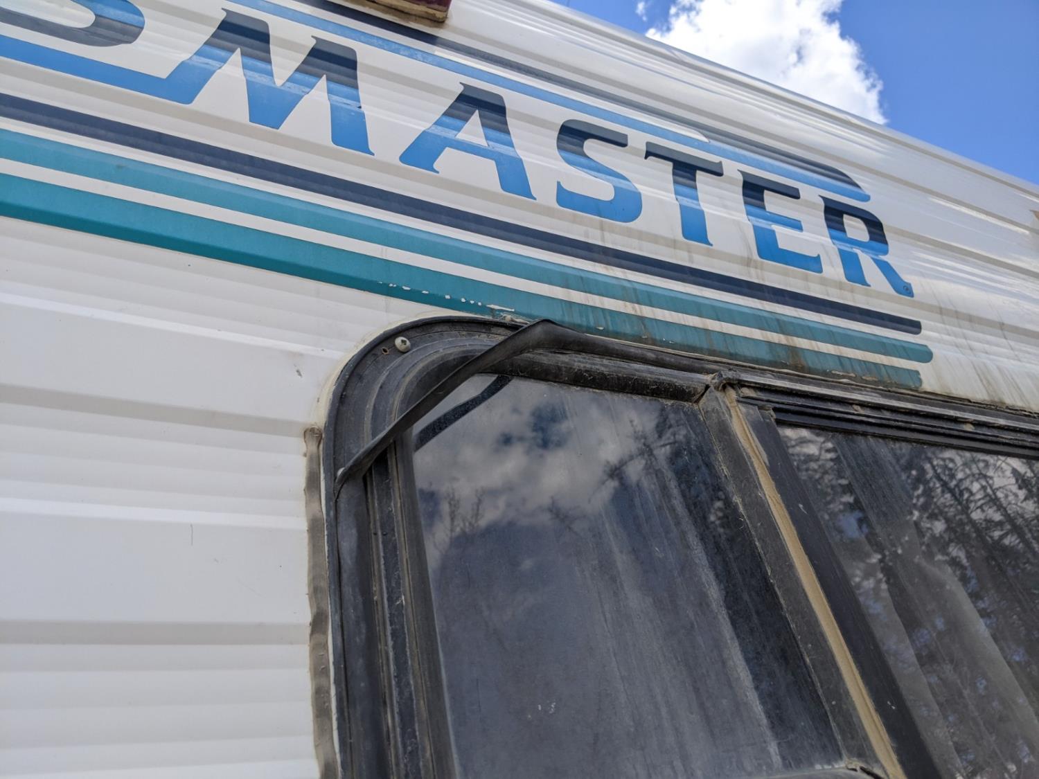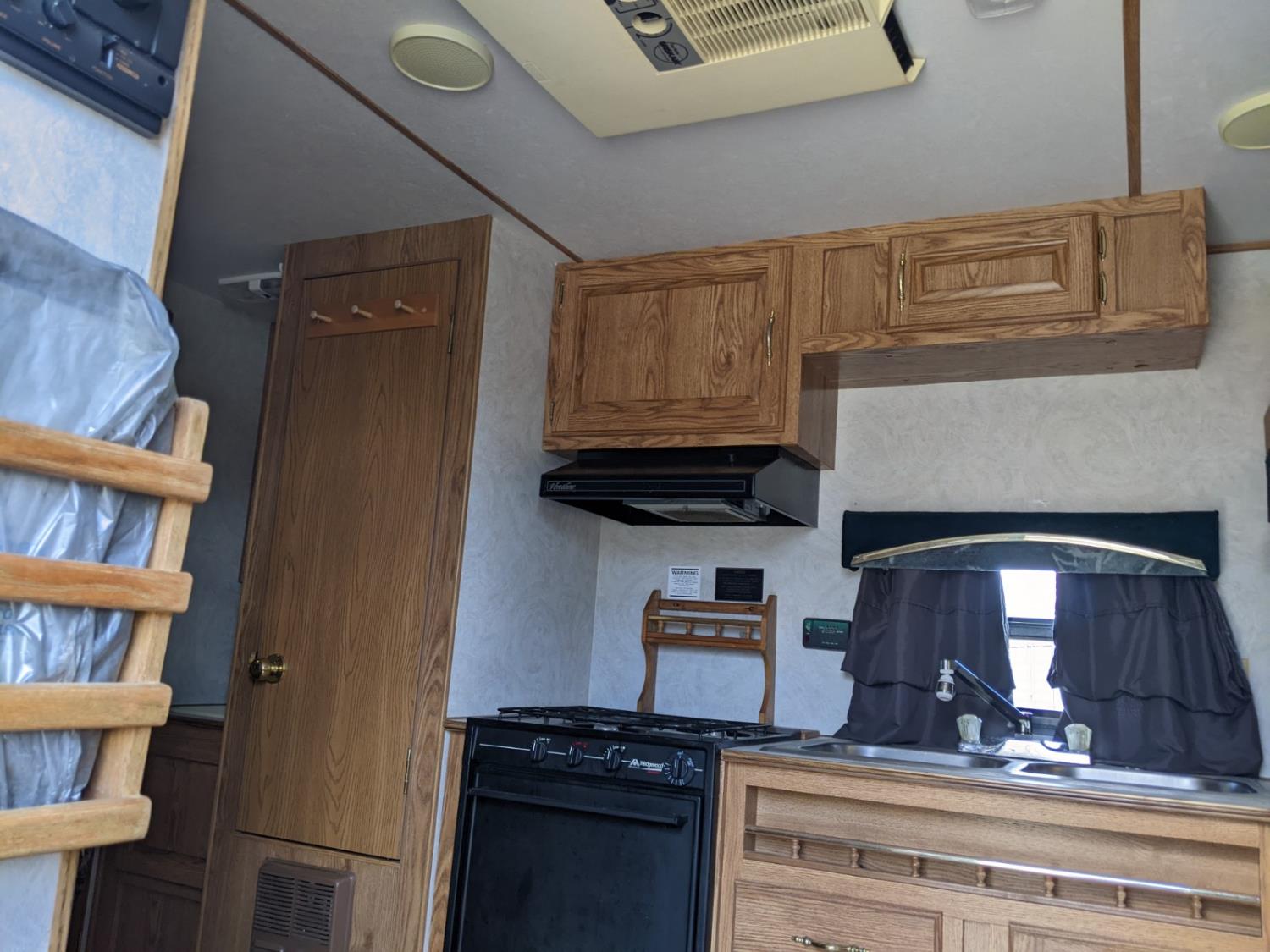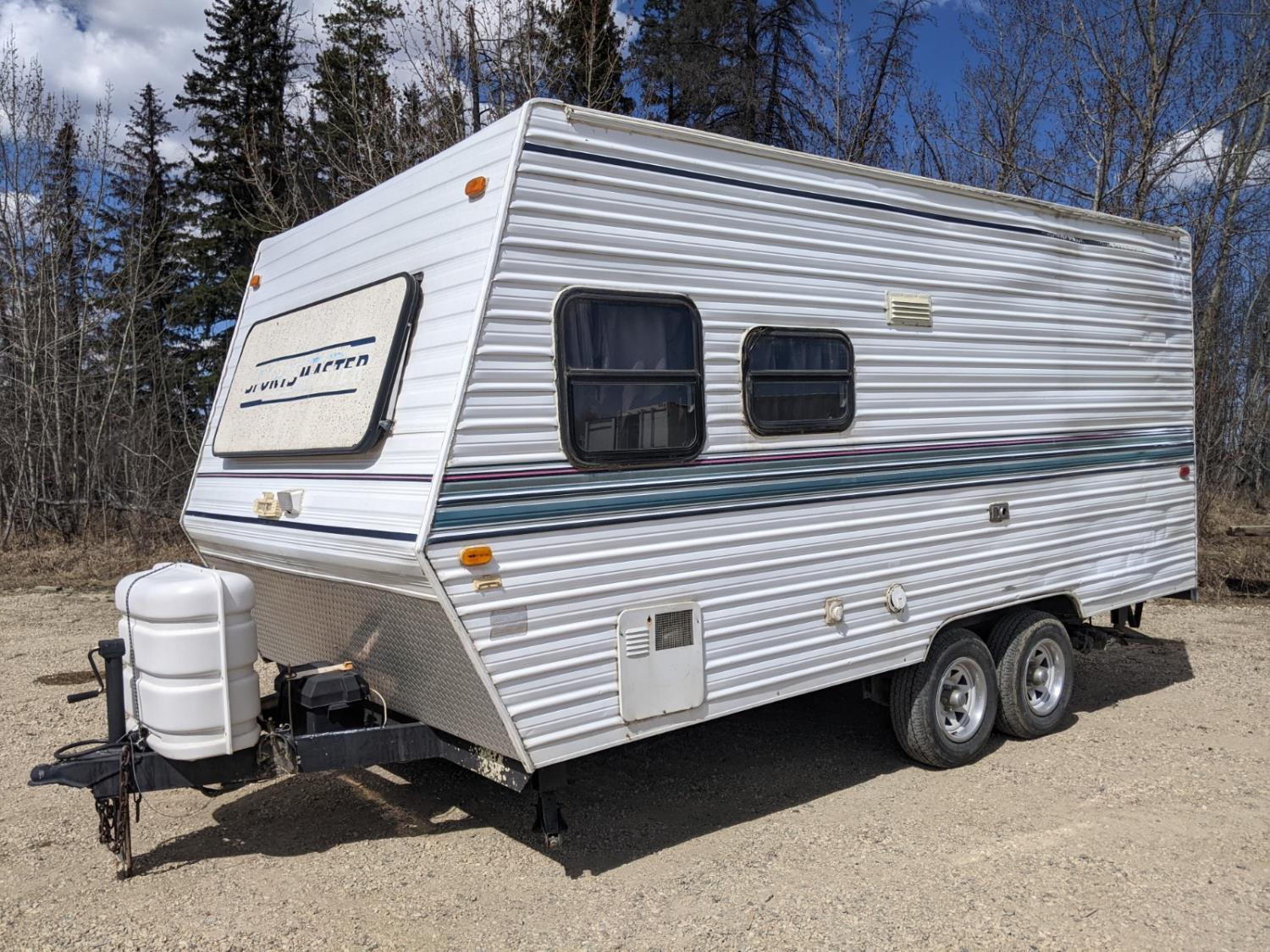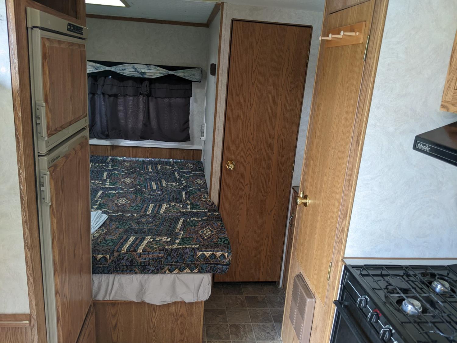Sleeps 4, stove, fridge, microwave, full bath, master bedroom, manual awning, spring suspension, AC not working, 205/75R14 tires