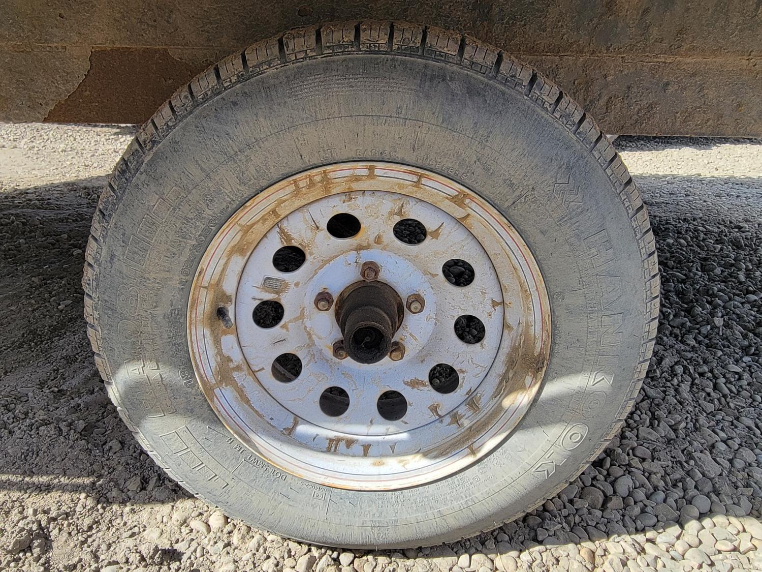 8 inch wide deck, wood deck, ball hitch, stake pockets, 8' l x 4' w slide in ramp, 185R14C tires