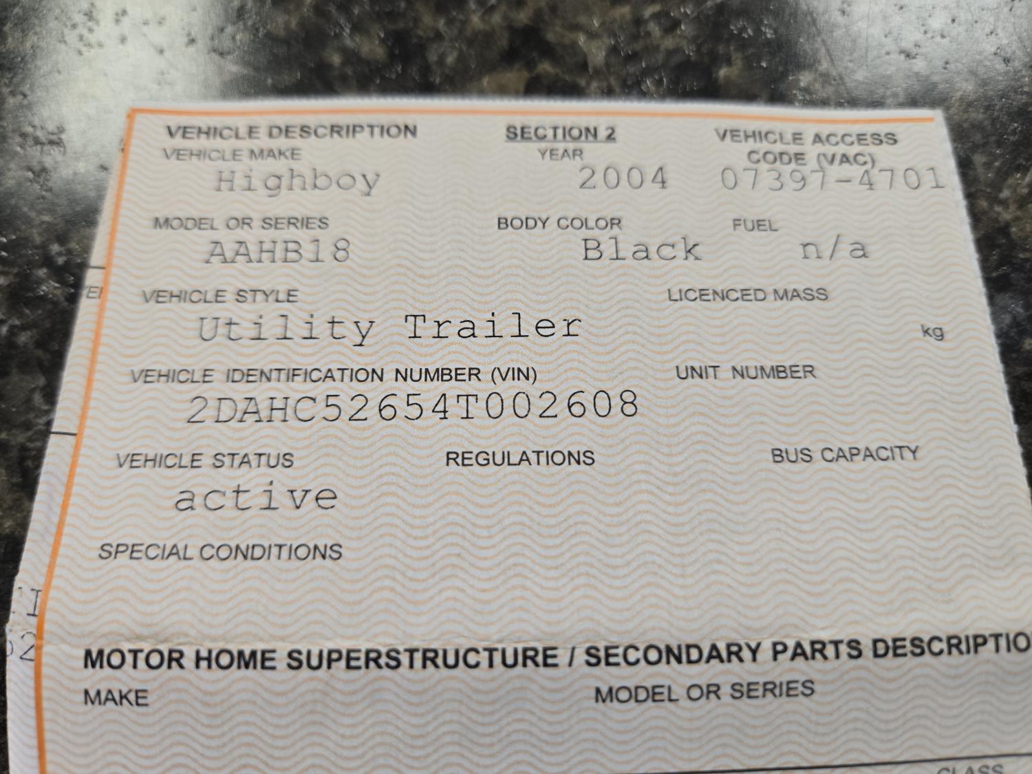 No visible serial number on trailer, sticker missing.