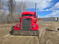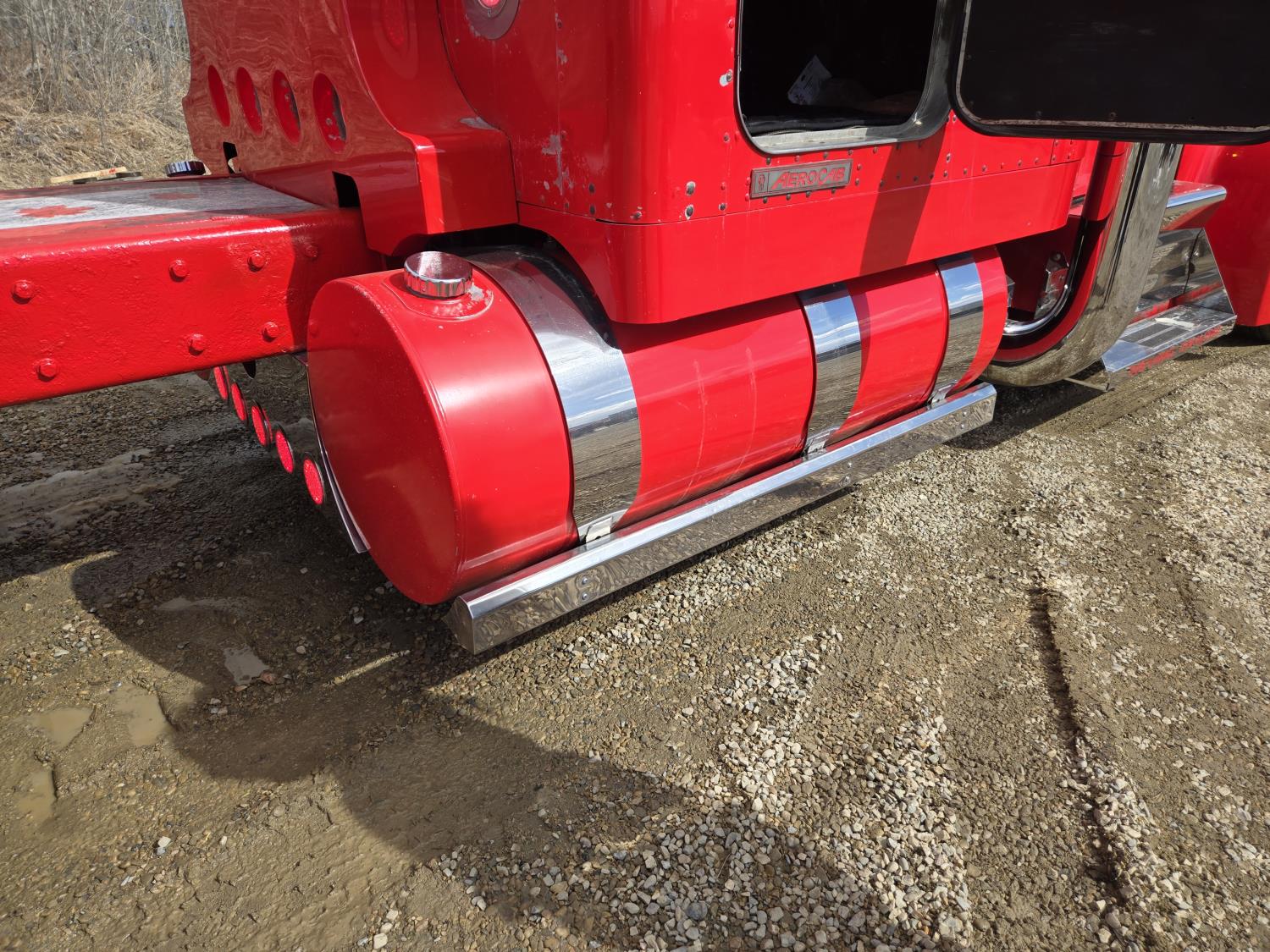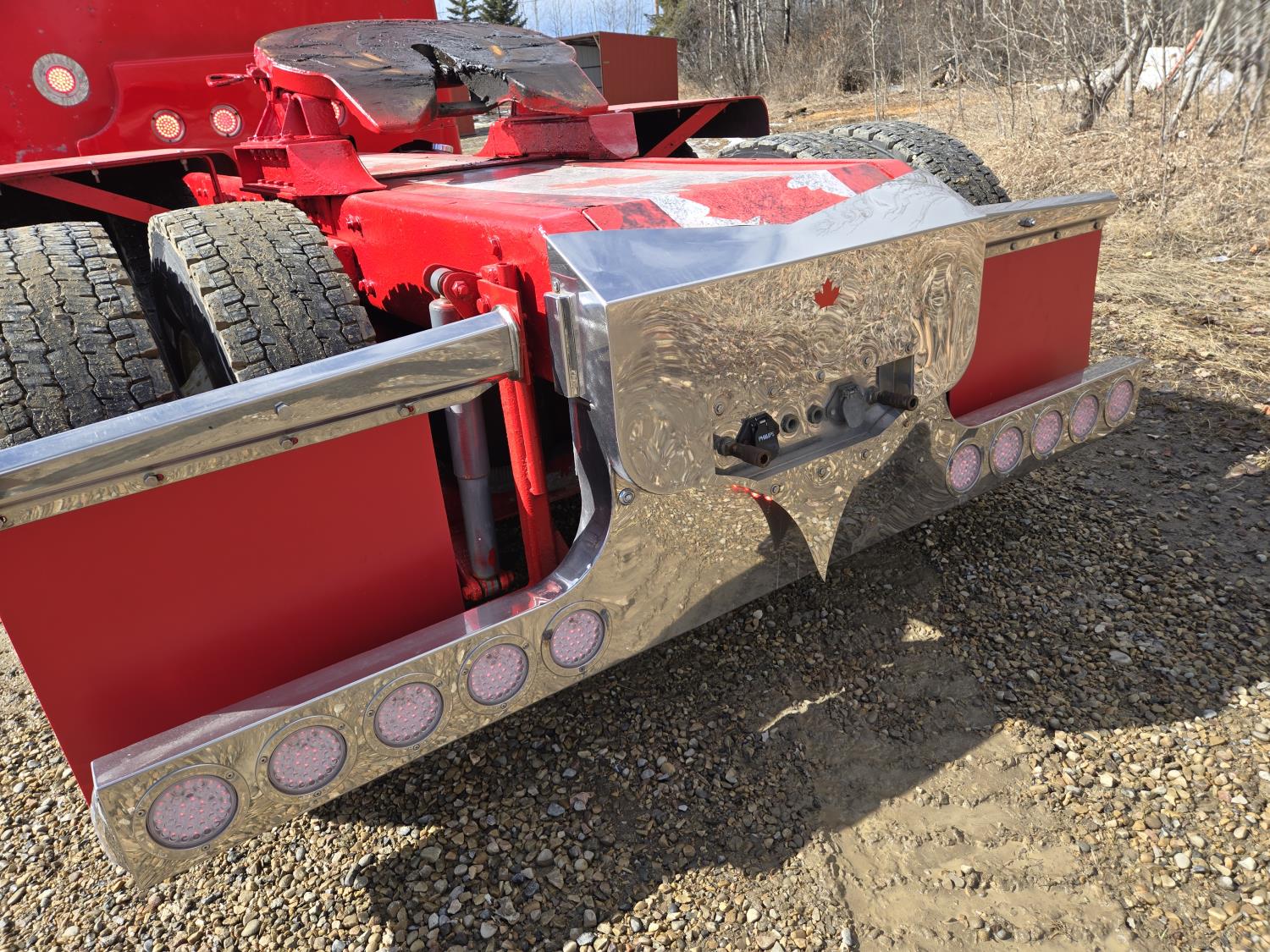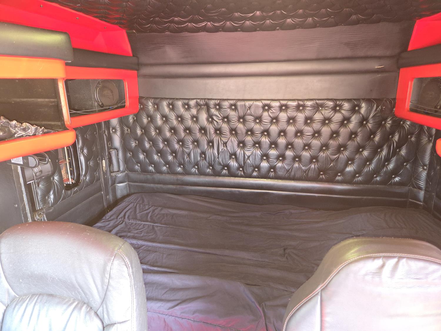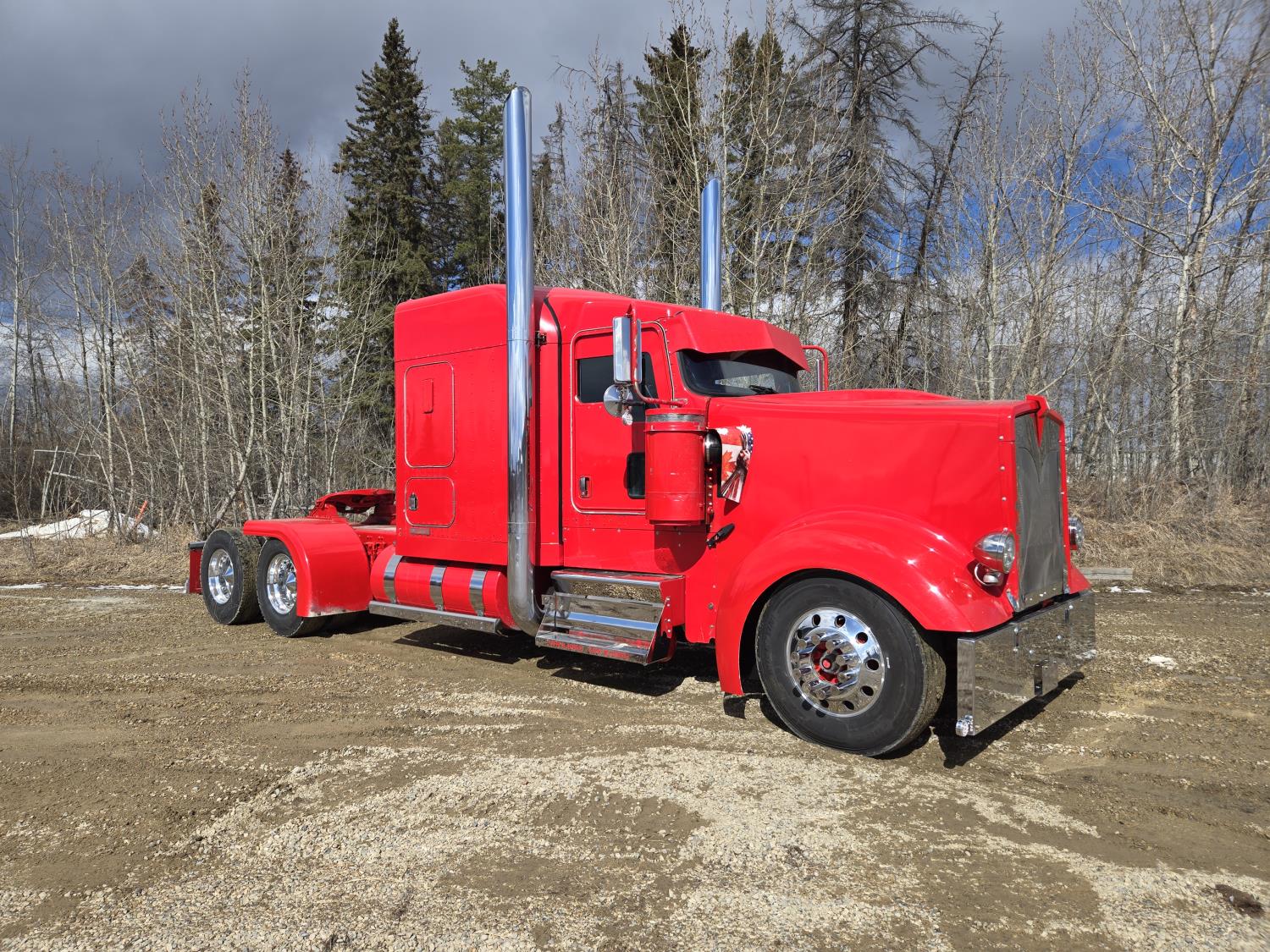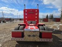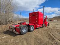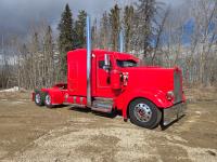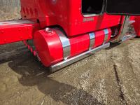 Caterpillar C15 6 cylinder twin turbo 550 HP engine, engine brake, Eaton Fuller 18 speed manual transmission, Webasto heater for cab only, 74 inch Aero Cab mid rise, sleeper, 12 Gauge Custom front air assist suspension, air ride suspension, 12,000 lb front axle, 40,000 lb rear axles, diff lock, 3.70 ratio, 258 inch WB, back up camera, 12 Gauge Custom exterior and interior, half fiber glass rear fenders, T-bar rear tail lights, split left fuel tank fuel/hydraulic oil, fuel tank filler panel, strobe beacon lights, aluminum outer wheels, 11R22.5 tires