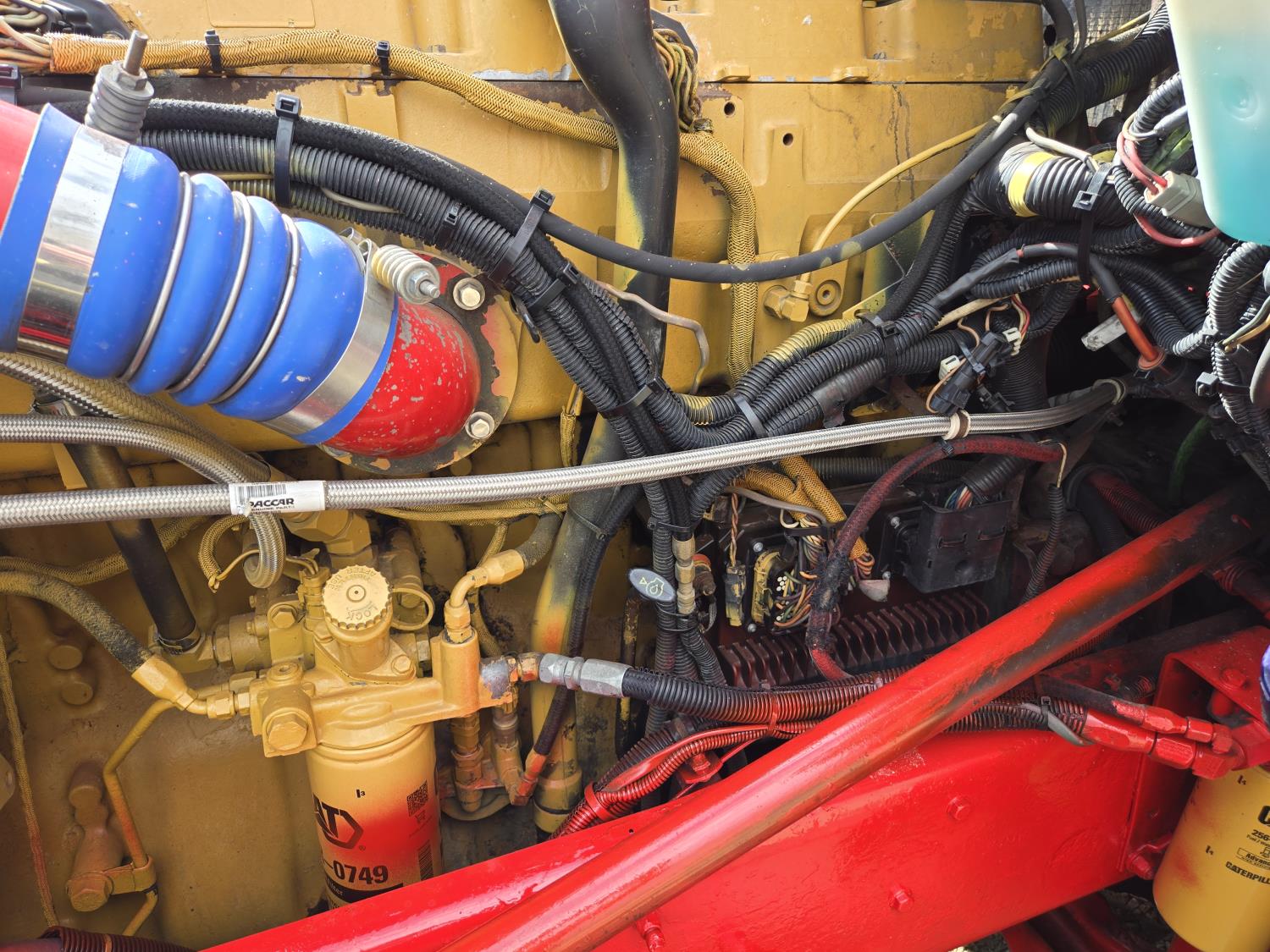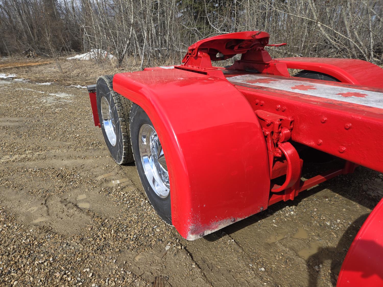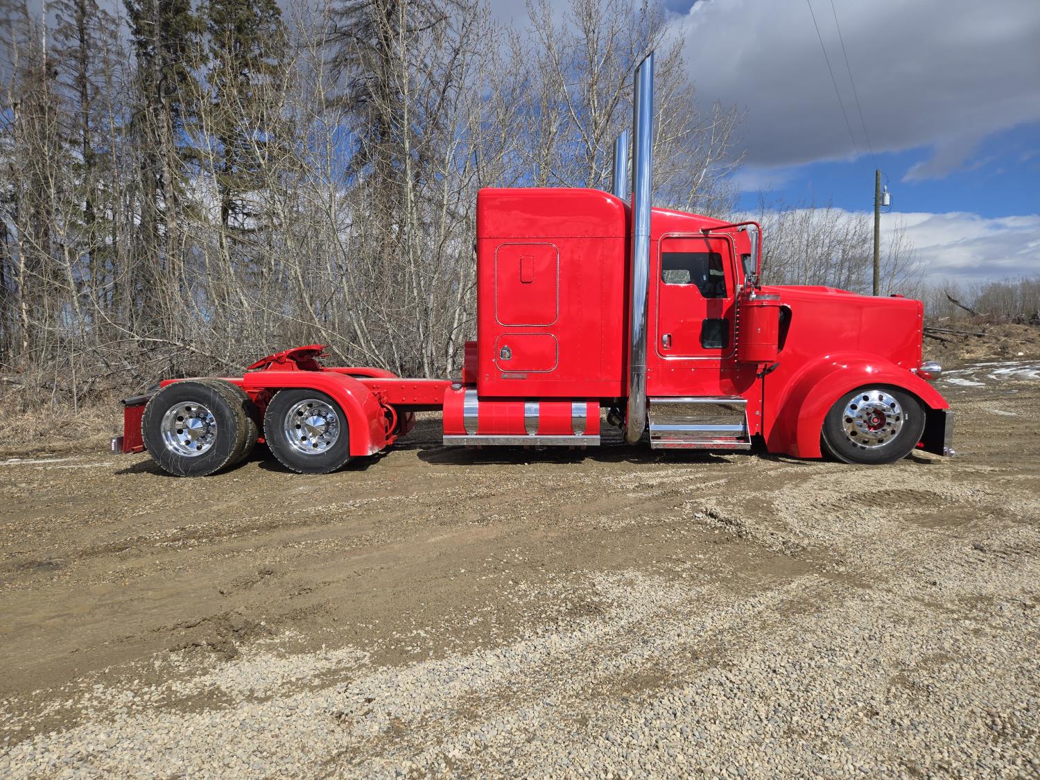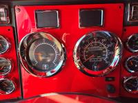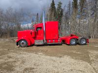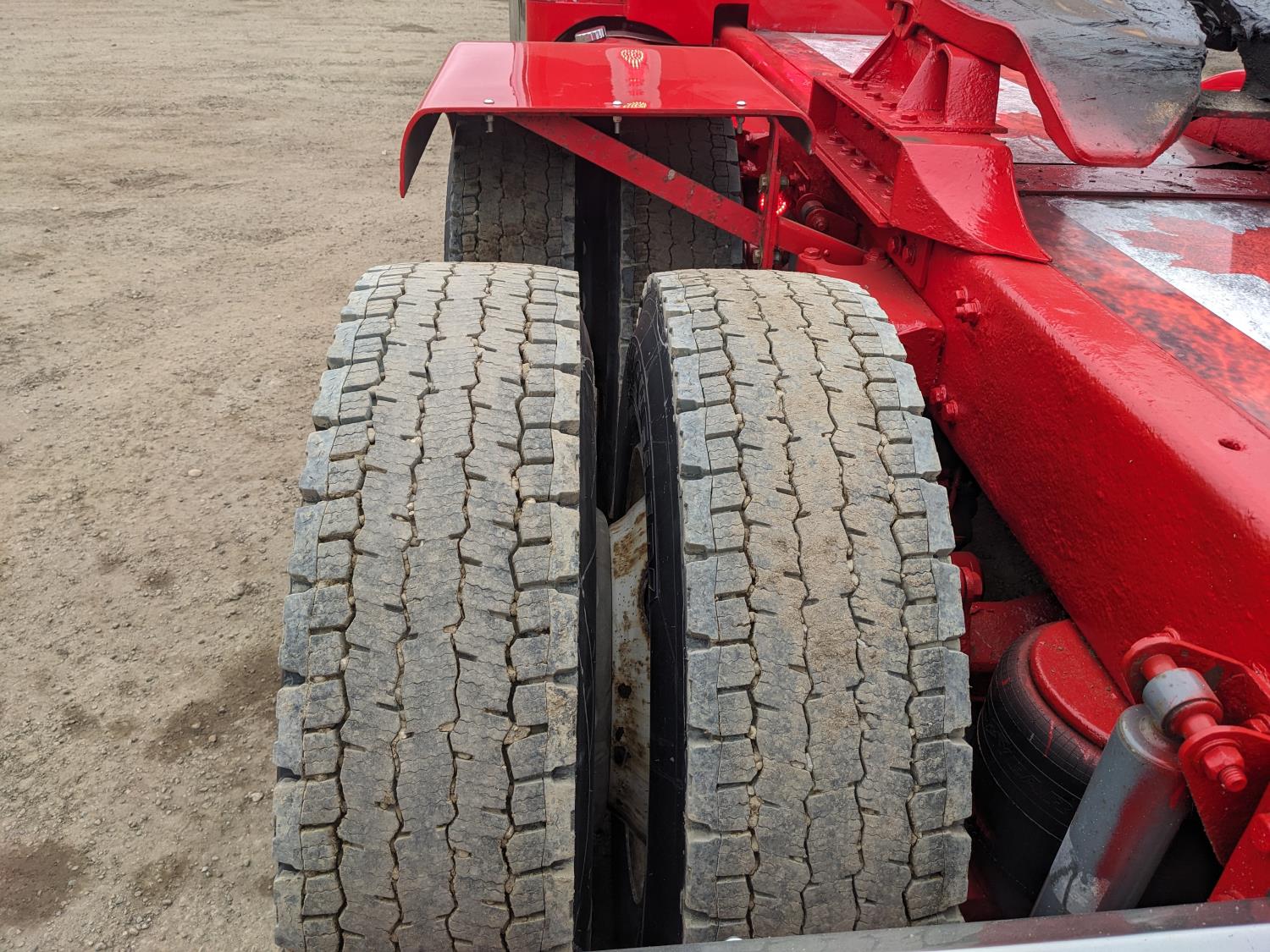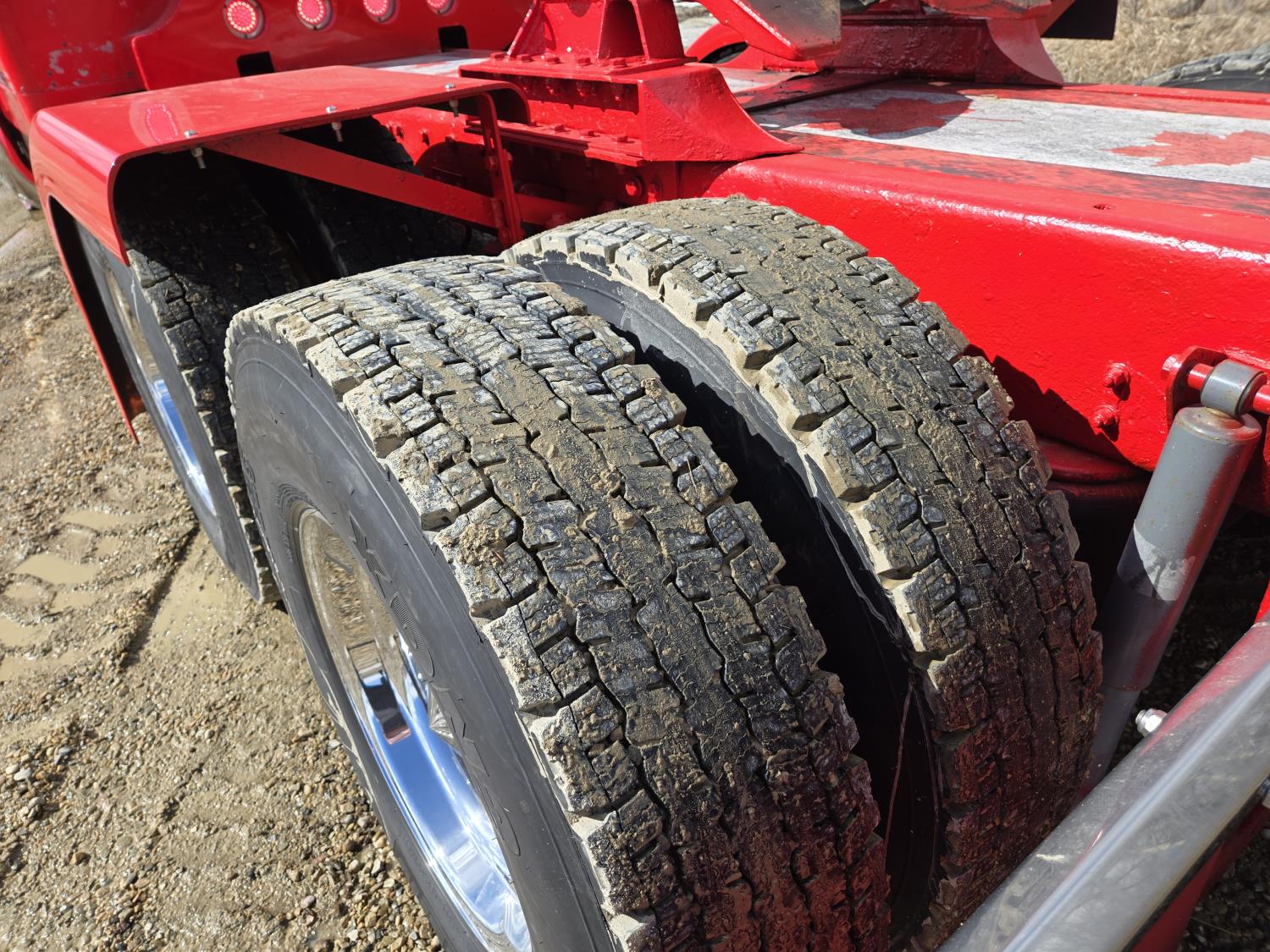 Caterpillar C15 6 cylinder twin turbo 550 HP engine, engine brake, Eaton Fuller 18 speed manual transmission, Webasto heater for cab only, 74 inch Aero Cab mid rise, sleeper, 12 Gauge Custom front air assist suspension, air ride suspension, 12,000 lb front axle, 40,000 lb rear axles, diff lock, 3.70 ratio, 258 inch WB, back up camera, 12 Gauge Custom exterior and interior, half fiber glass rear fenders, T-bar rear tail lights, split left fuel tank fuel/hydraulic oil, fuel tank filler panel, strobe beacon lights, aluminum outer wheels, 11R22.5 tires