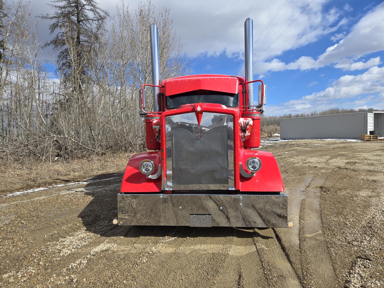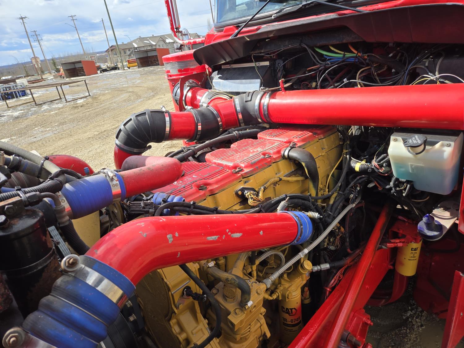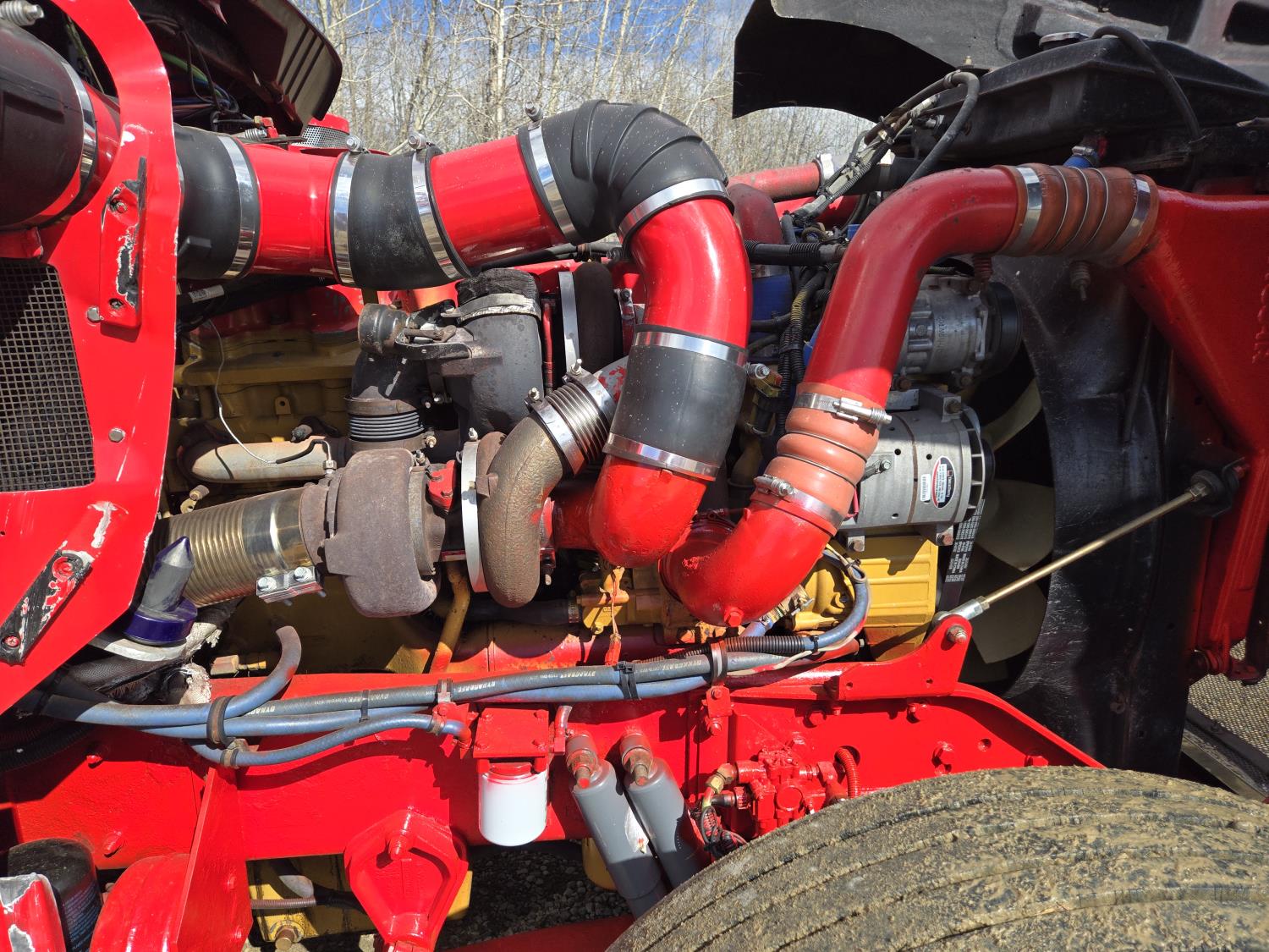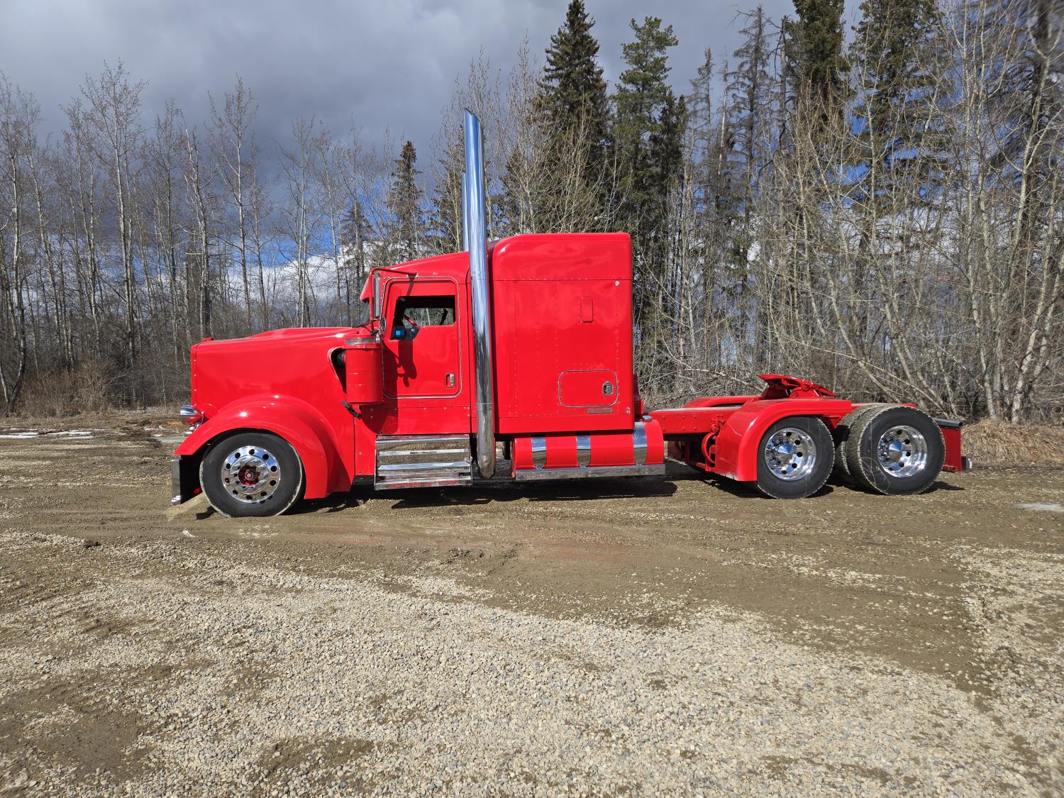 Caterpillar C15 6 cylinder twin turbo 550 HP engine, engine brake, Eaton Fuller 18 speed manual transmission, Webasto heater for cab only, 74 inch Aero Cab mid rise, sleeper, 12 Gauge Custom front air assist suspension, air ride suspension, 12,000 lb front axle, 40,000 lb rear axles, diff lock, 3.70 ratio, 258 inch WB, back up camera, 12 Gauge Custom exterior and interior, half fiber glass rear fenders, T-bar rear tail lights, split left fuel tank fuel/hydraulic oil, fuel tank filler panel, strobe beacon lights, aluminum outer wheels, 11R22.5 tires