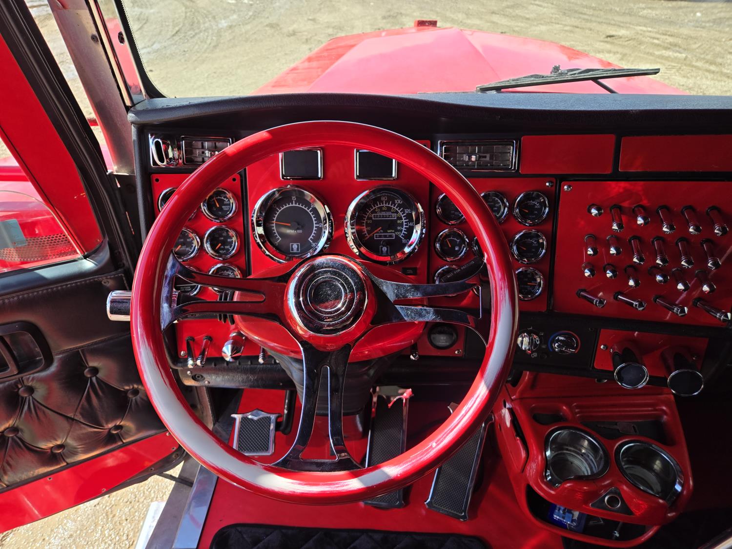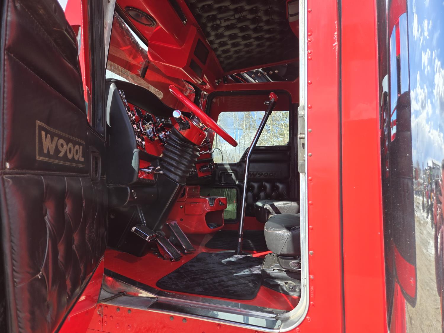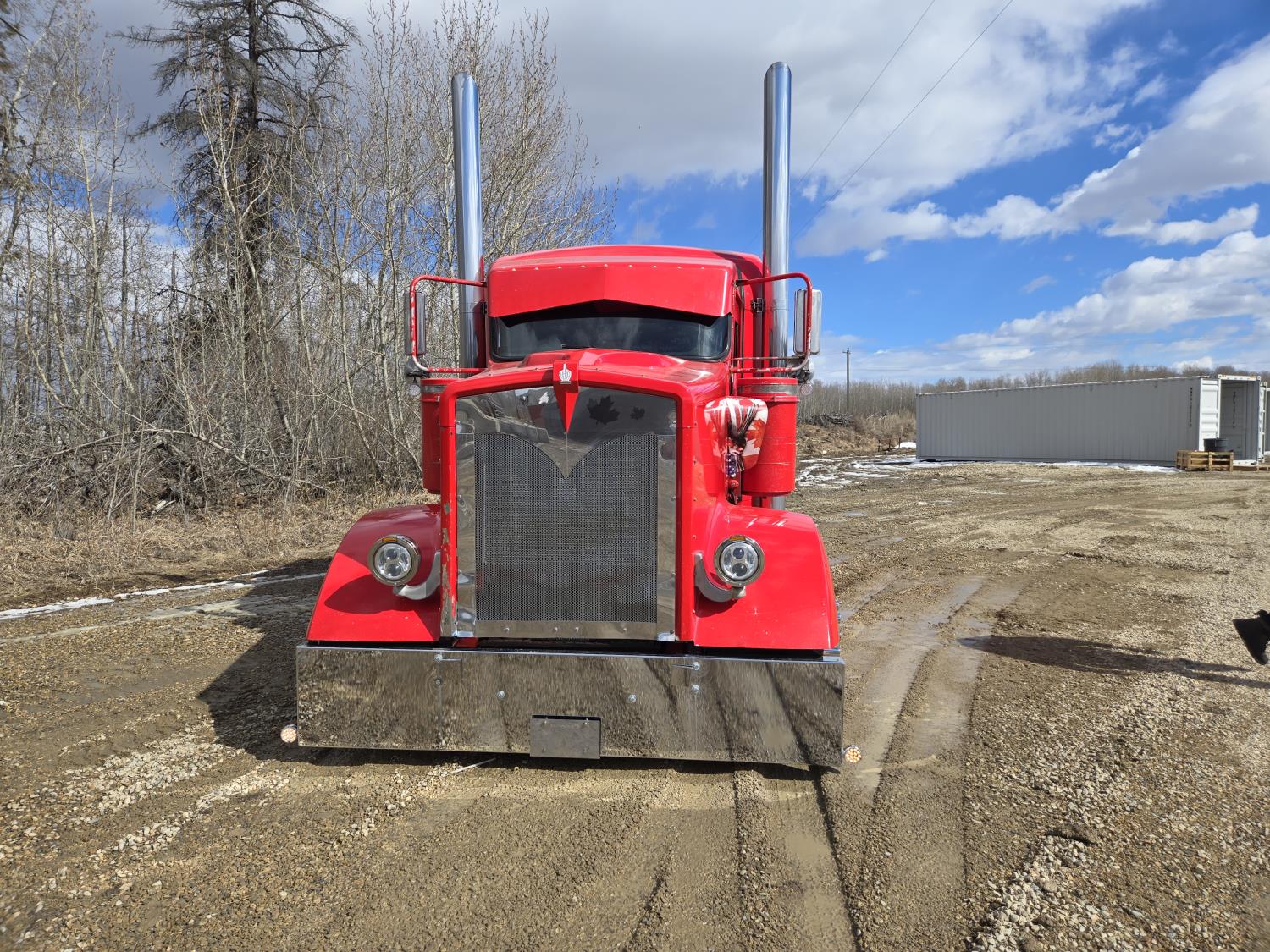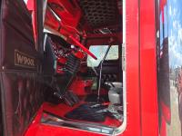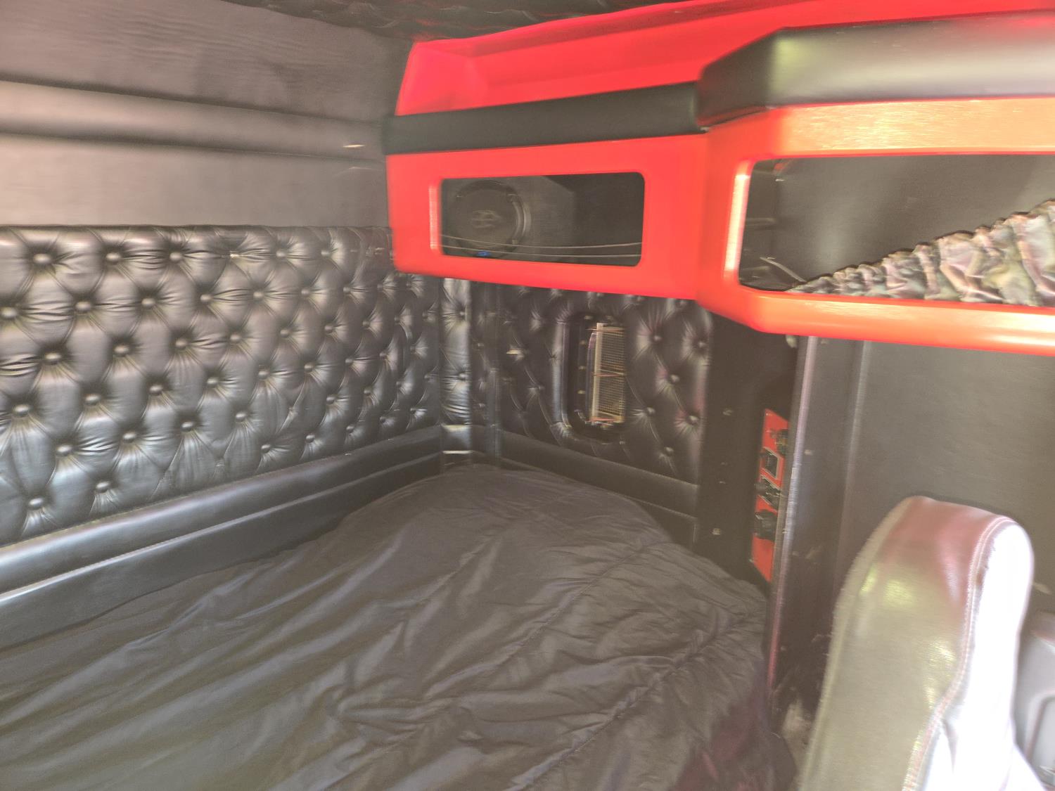 Caterpillar C15 6 cylinder twin turbo 550 HP engine, engine brake, Eaton Fuller 18 speed manual transmission, Webasto heater for cab only, 74 inch Aero Cab mid rise, sleeper, 12 Gauge Custom front air assist suspension, air ride suspension, 12,000 lb front axle, 40,000 lb rear axles, diff lock, 3.70 ratio, 258 inch WB, back up camera, 12 Gauge Custom exterior and interior, half fiber glass rear fenders, T-bar rear tail lights, split left fuel tank fuel/hydraulic oil, fuel tank filler panel, strobe beacon lights, aluminum outer wheels, 11R22.5 tires