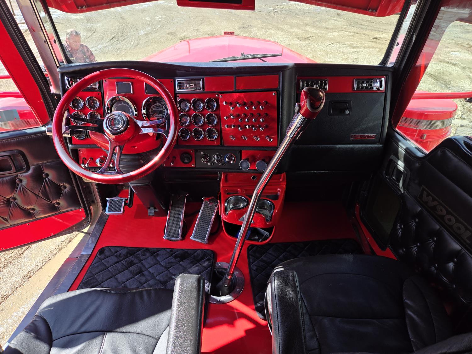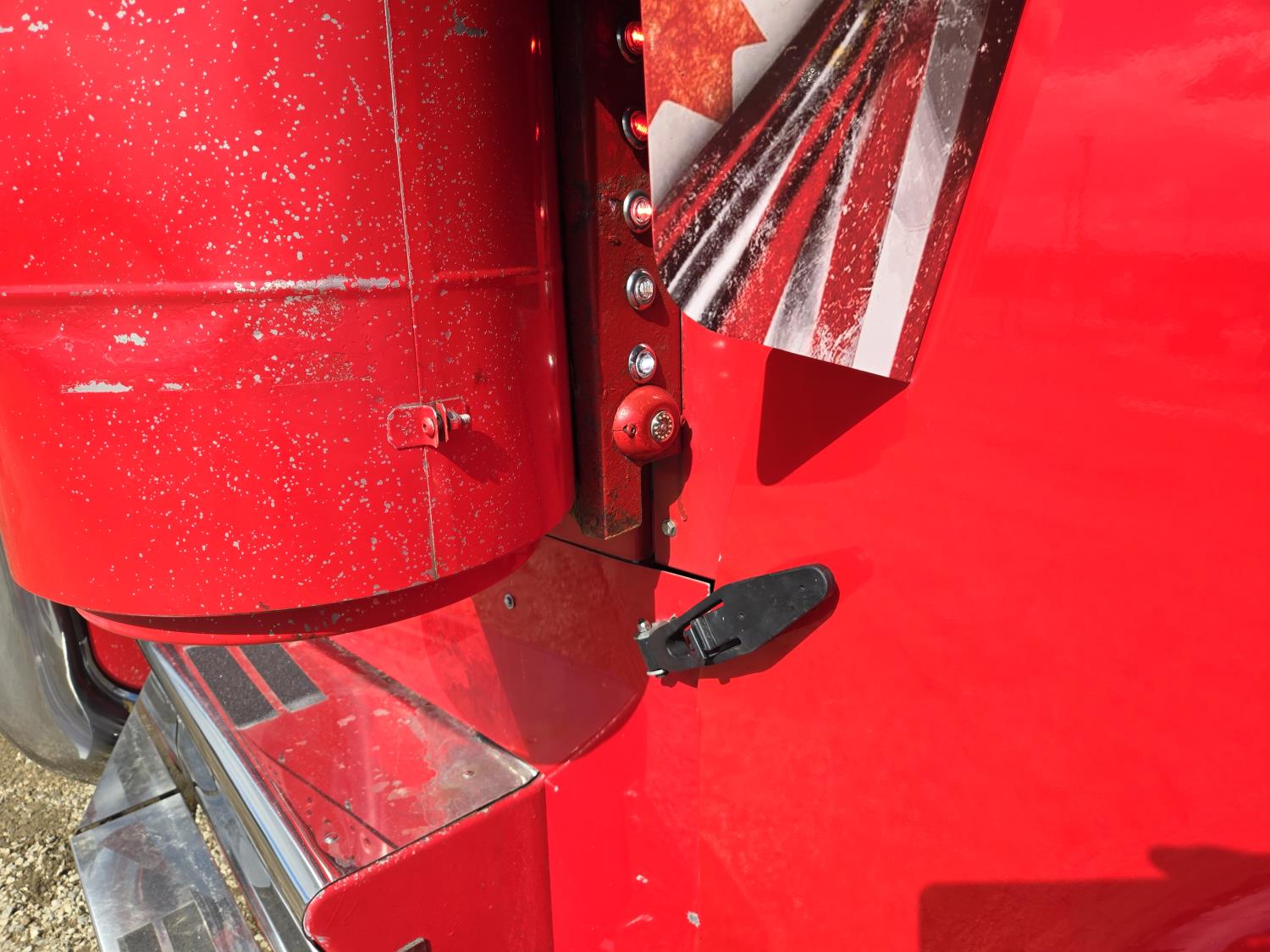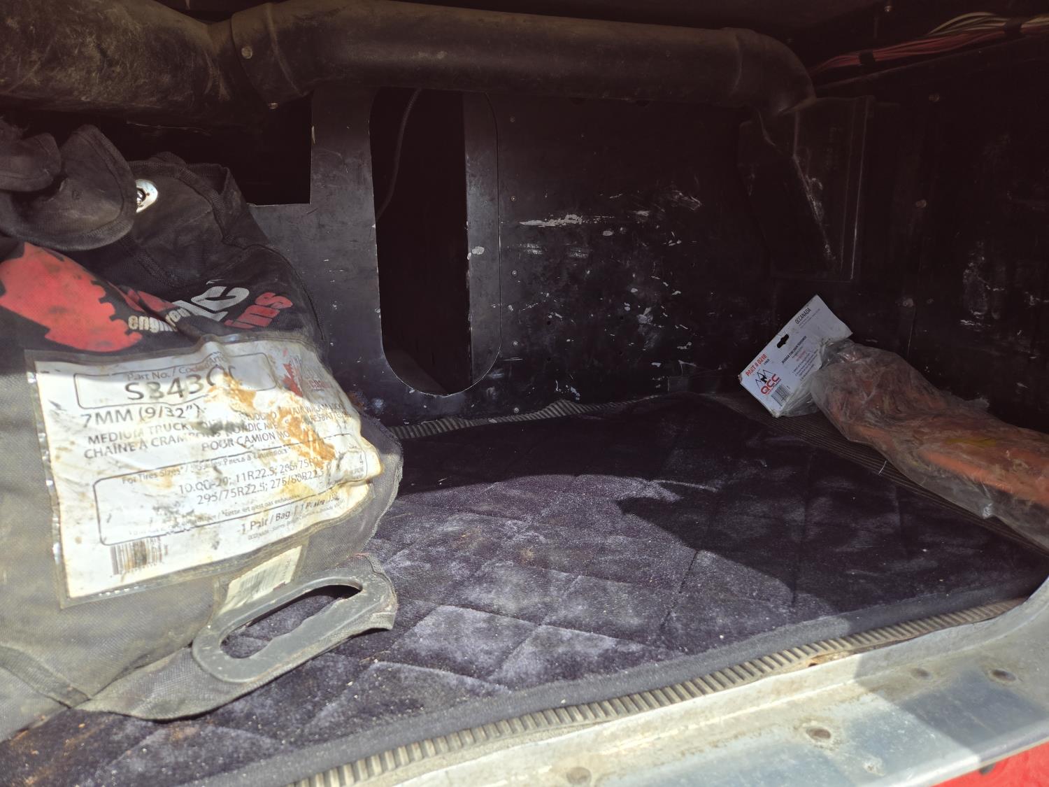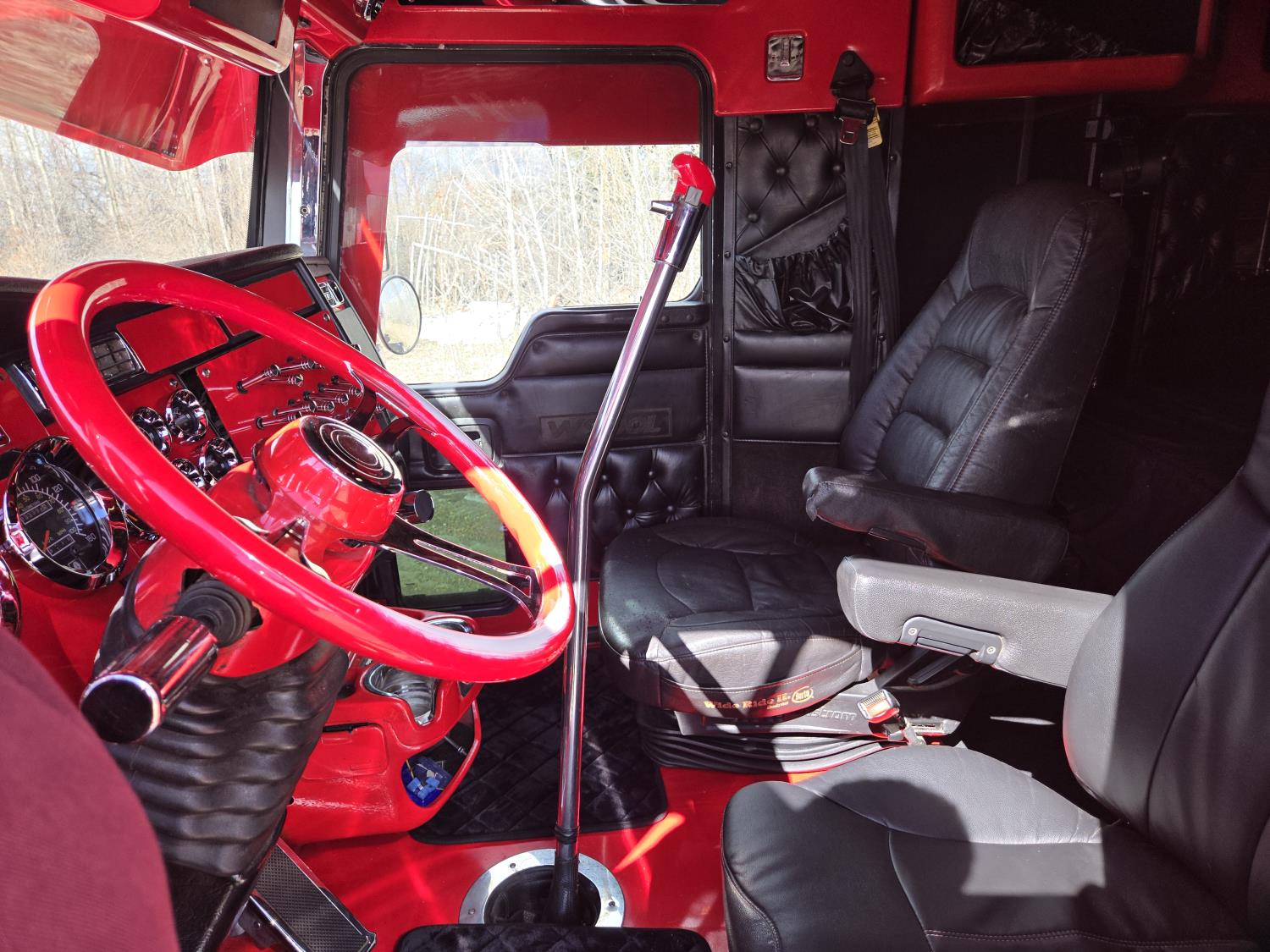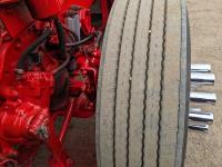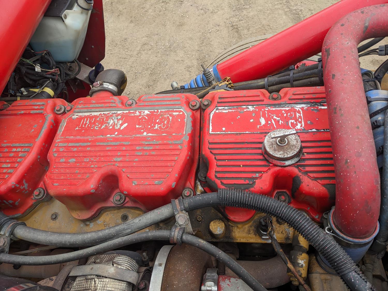 Caterpillar C15 6 cylinder twin turbo 550 HP engine, engine brake, Eaton Fuller 18 speed manual transmission, Webasto heater for cab only, 74 inch Aero Cab mid rise, sleeper, 12 Gauge Custom front air assist suspension, air ride suspension, 12,000 lb front axle, 40,000 lb rear axles, diff lock, 3.70 ratio, 258 inch WB, back up camera, 12 Gauge Custom exterior and interior, half fiber glass rear fenders, T-bar rear tail lights, split left fuel tank fuel/hydraulic oil, fuel tank filler panel, strobe beacon lights, aluminum outer wheels, 11R22.5 tires