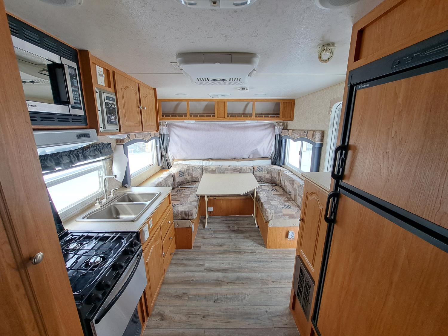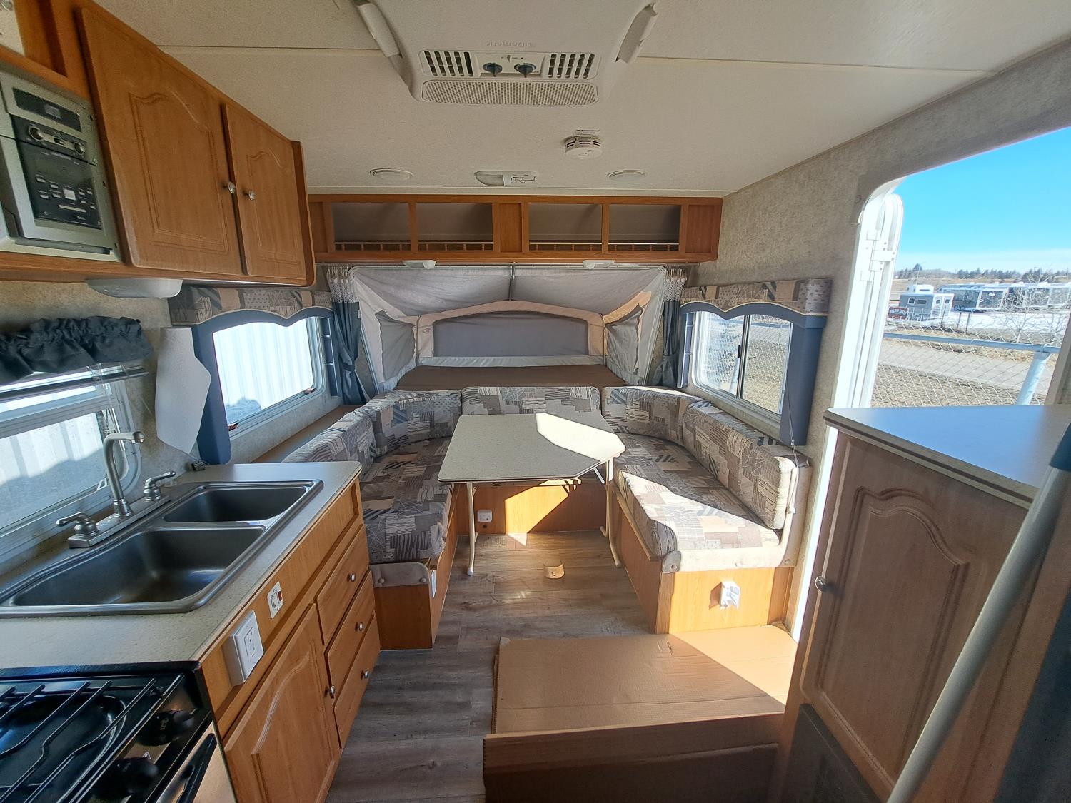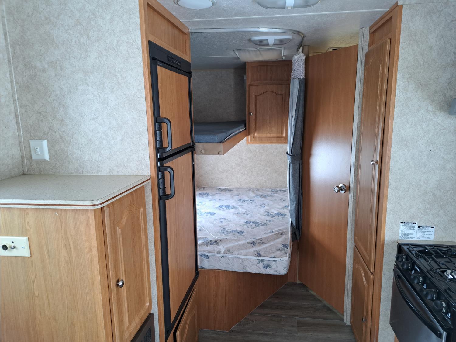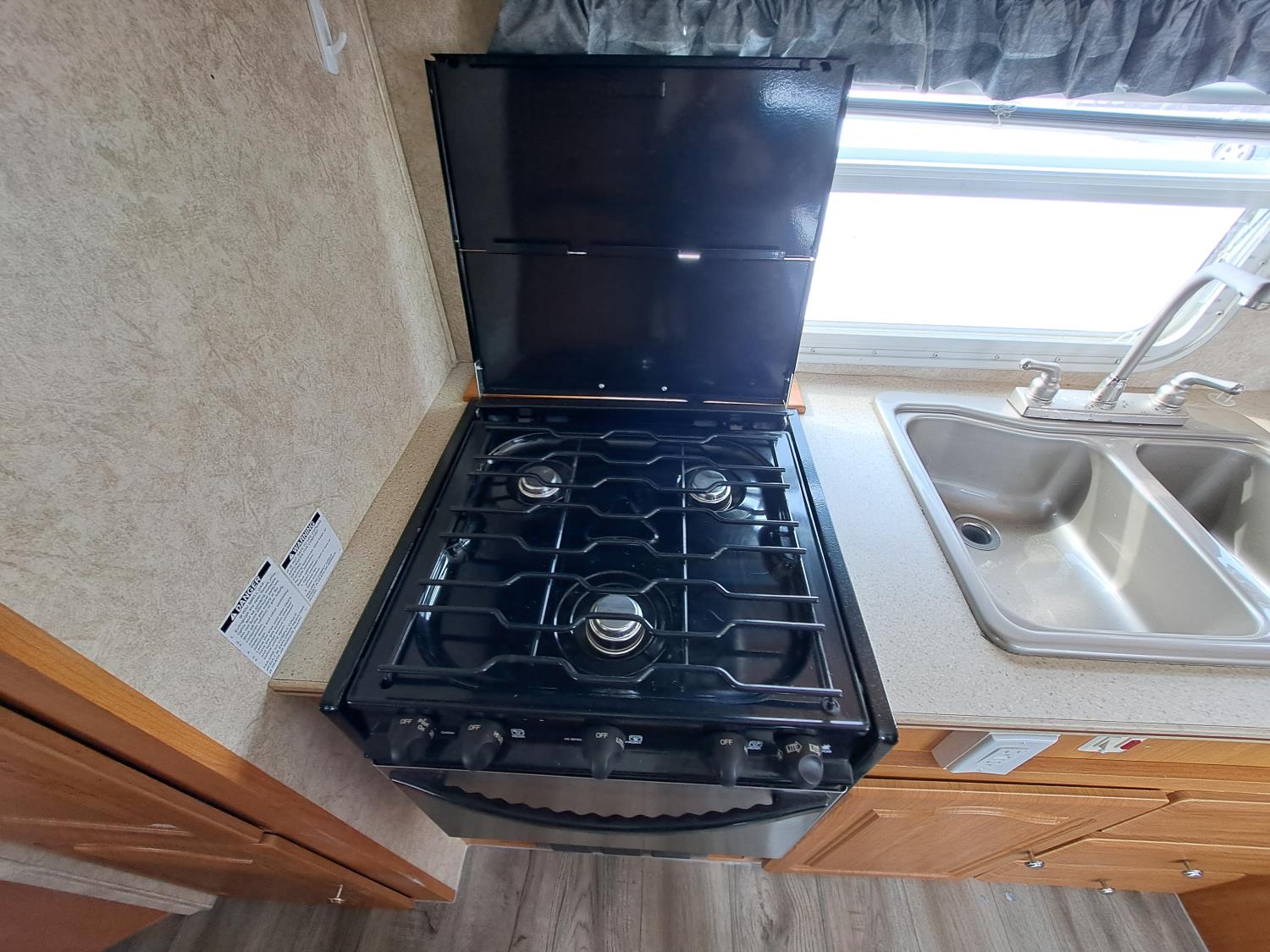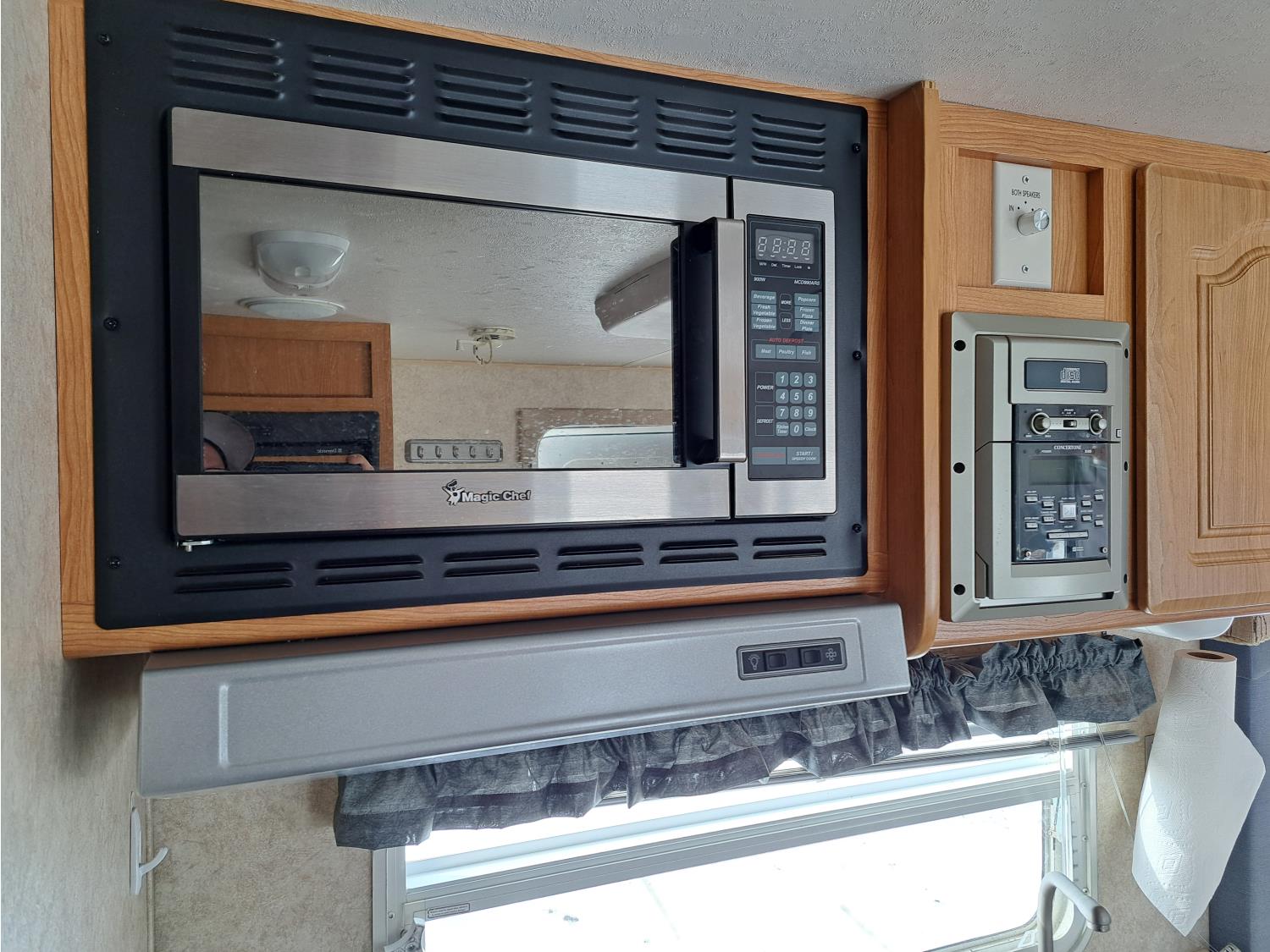 stove, fridge, microwave, full bath, bunk beds, A/C, outdoor shower, manual awning, spring suspension, electric brakes, (2) 30lb propane tanks, rear hitch, roof antenna, stereo, pop out tent, furnace, range fan, smoke detectors, Co2 detectors, 2 5/16 inch load distribution hitch assembly, window coverings, spare tire, 30 amp power cord with cross over to 120 volt., 205/75R14 tires