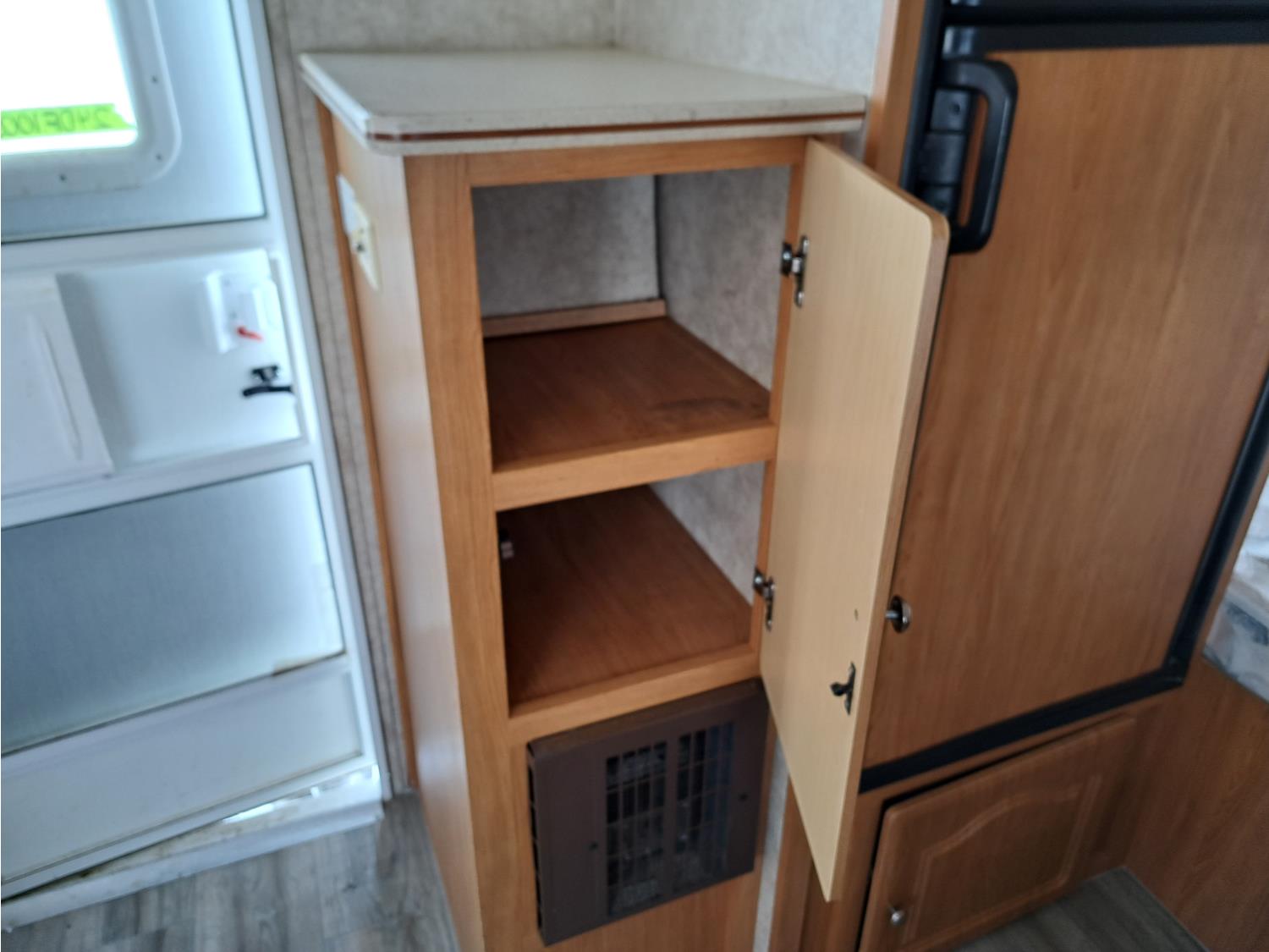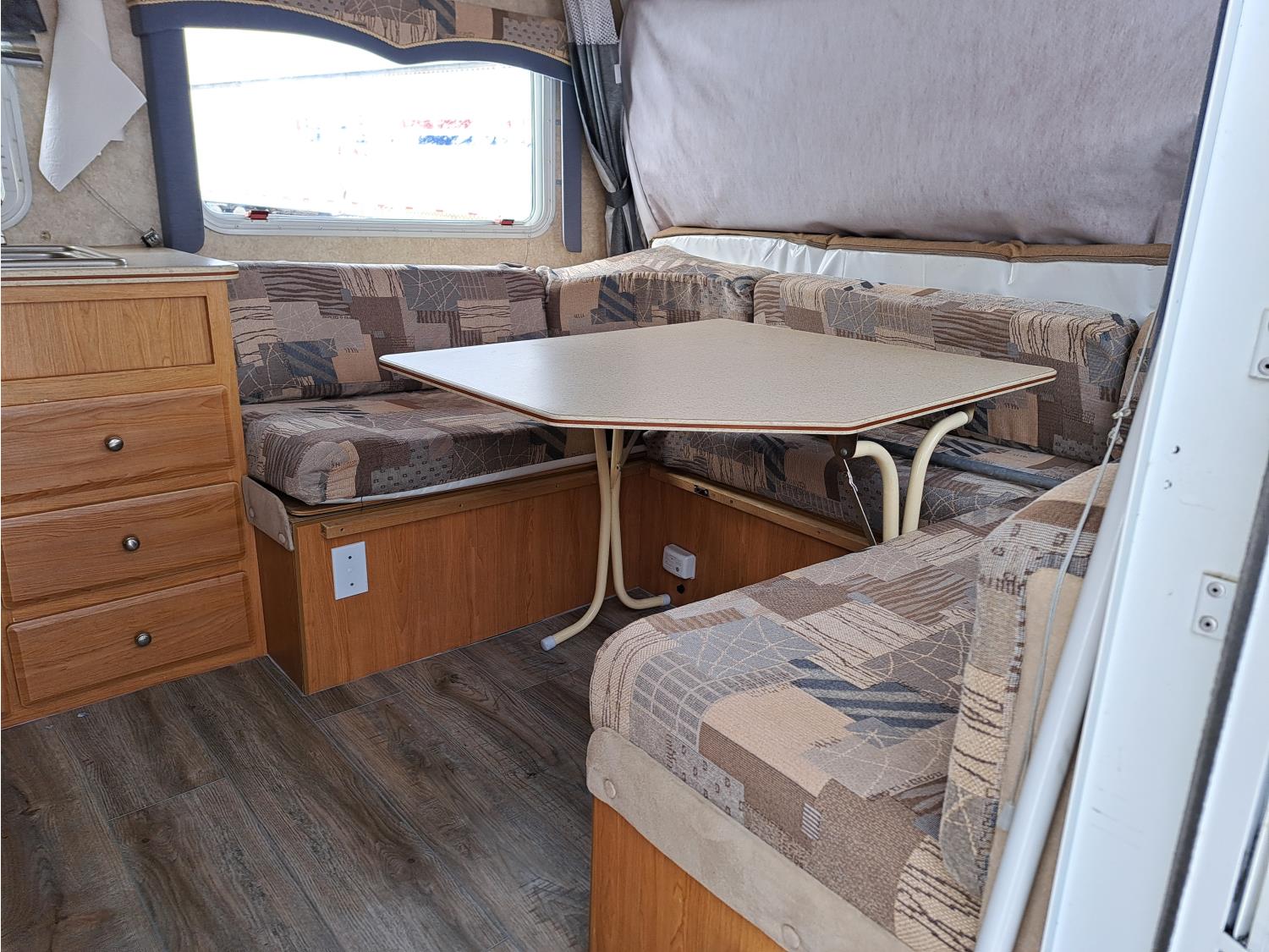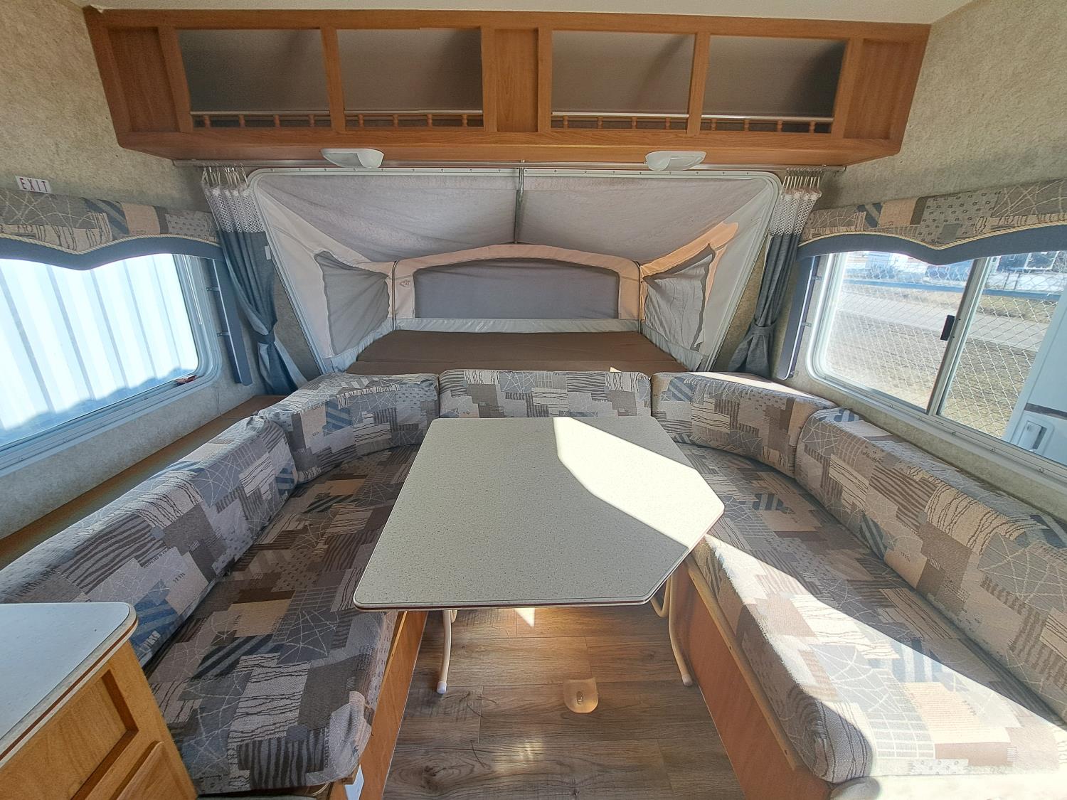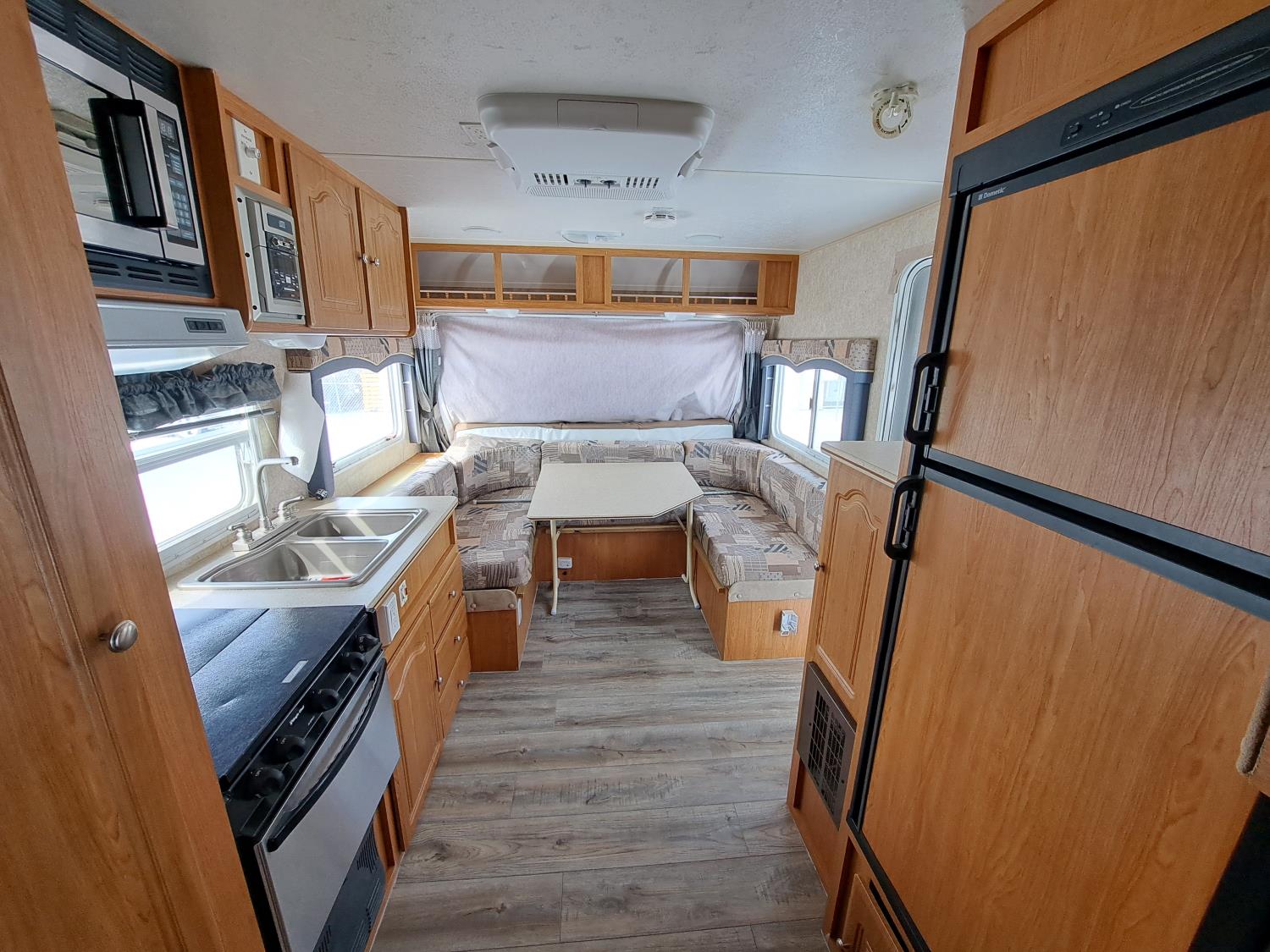stove, fridge, microwave, full bath, bunk beds, A/C, outdoor shower, manual awning, spring suspension, electric brakes, (2) 30lb propane tanks, rear hitch, roof antenna, stereo, pop out tent, furnace, range fan, smoke detectors, Co2 detectors, 2 5/16 inch load distribution hitch assembly, window coverings, spare tire, 30 amp power cord with cross over to 120 volt., 205/75R14 tires