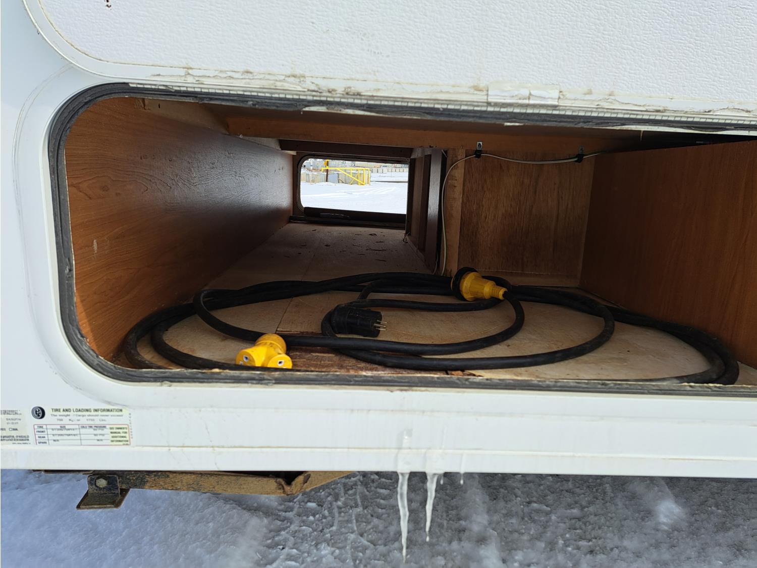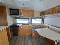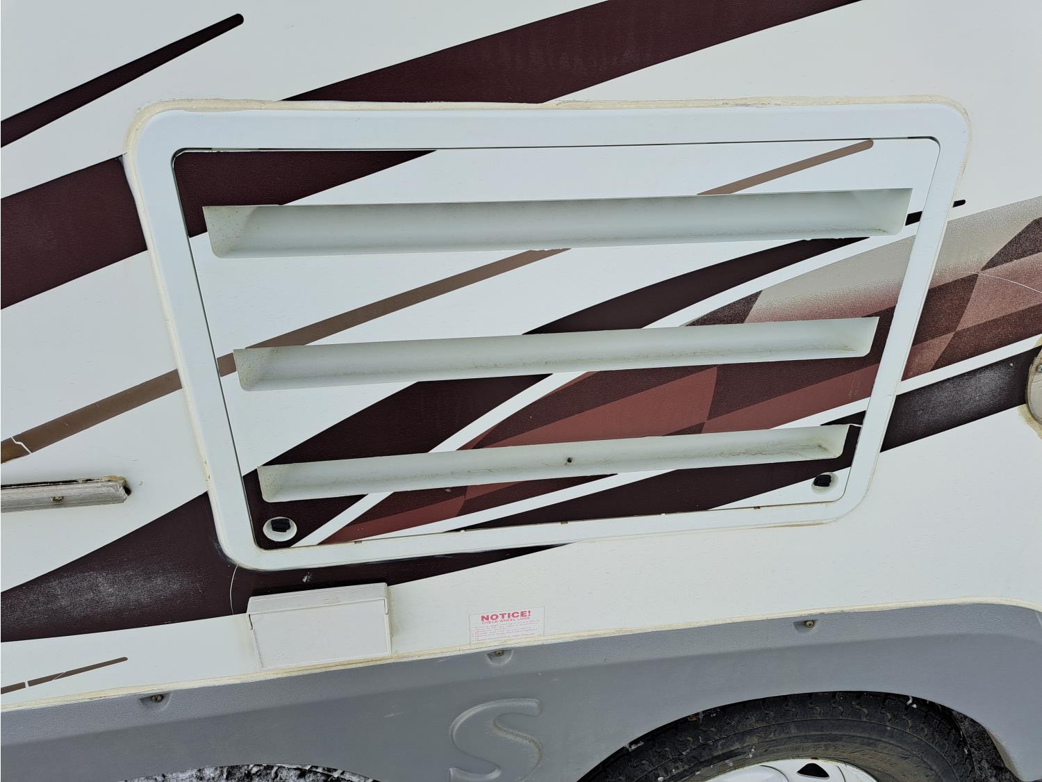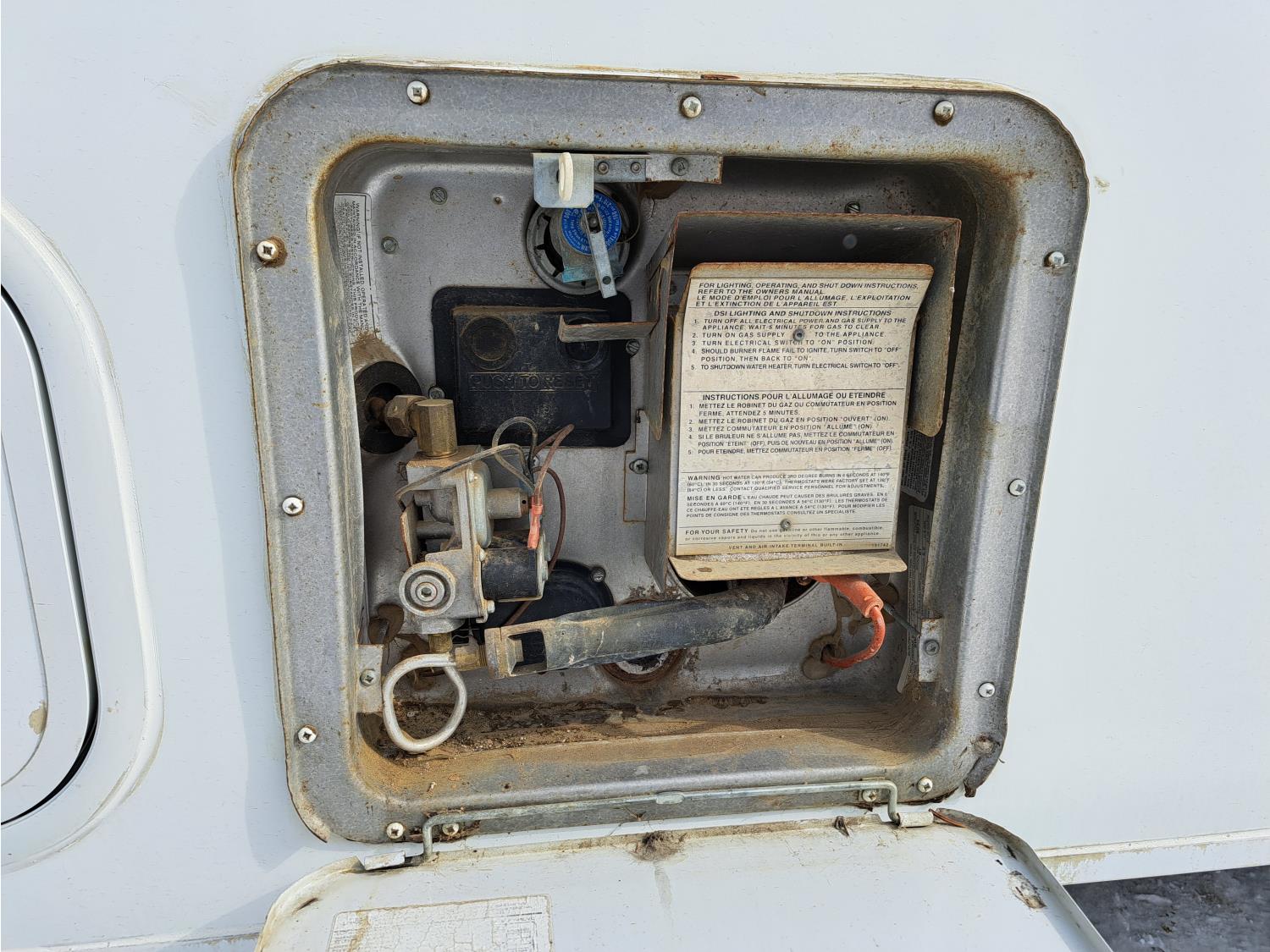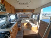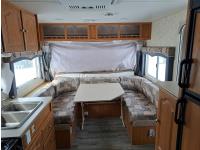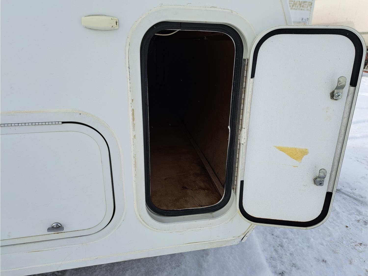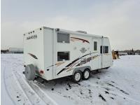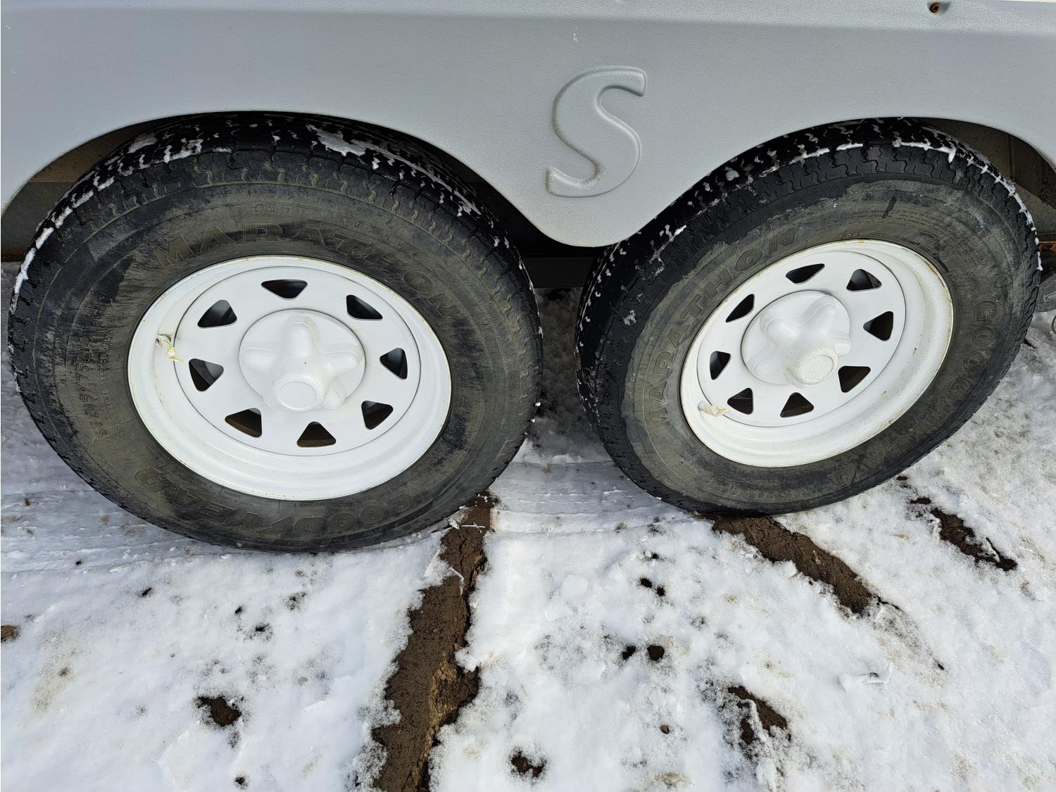 stove, fridge, microwave, full bath, bunk beds, A/C, outdoor shower, manual awning, spring suspension, electric brakes, (2) 30lb propane tanks, rear hitch, roof antenna, stereo, pop out tent, furnace, range fan, smoke detectors, Co2 detectors, 2 5/16 inch load distribution hitch assembly, window coverings, spare tire, 30 amp power cord with cross over to 120 volt., 205/75R14 tires