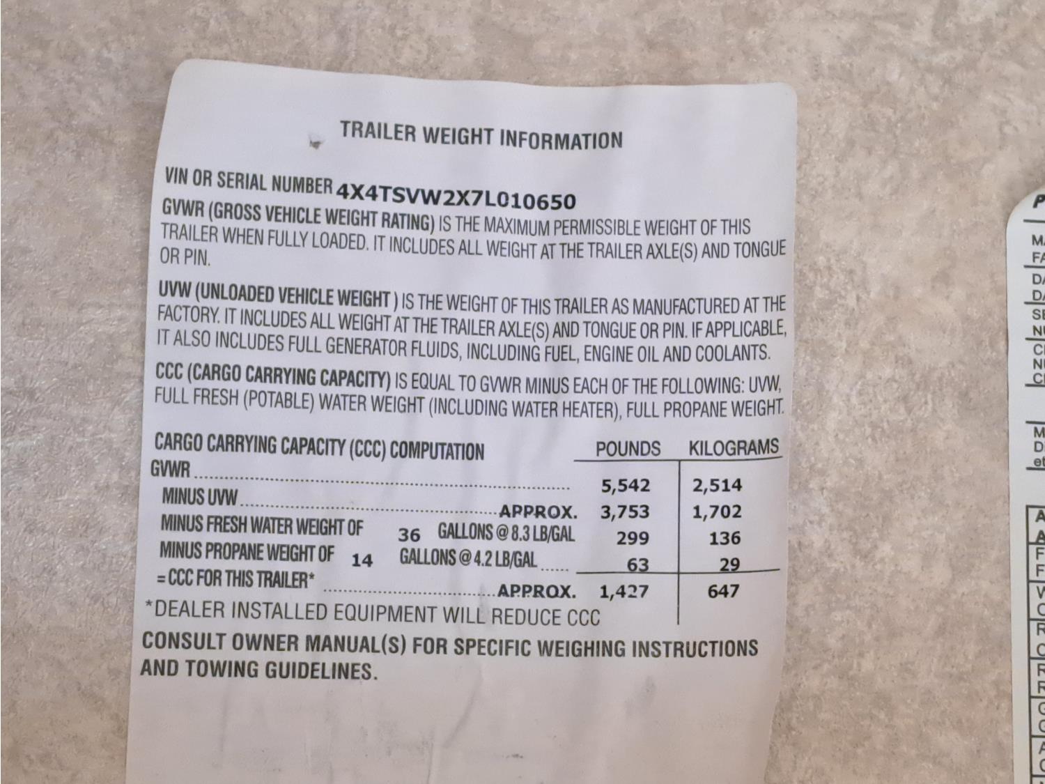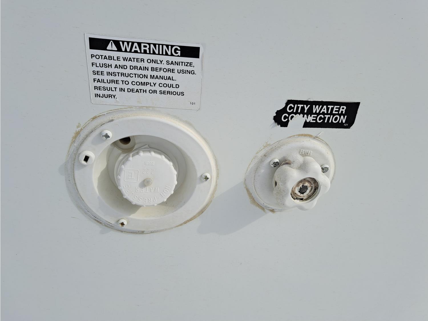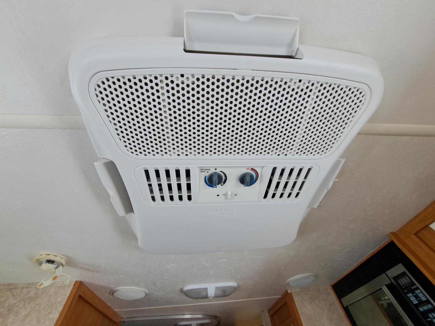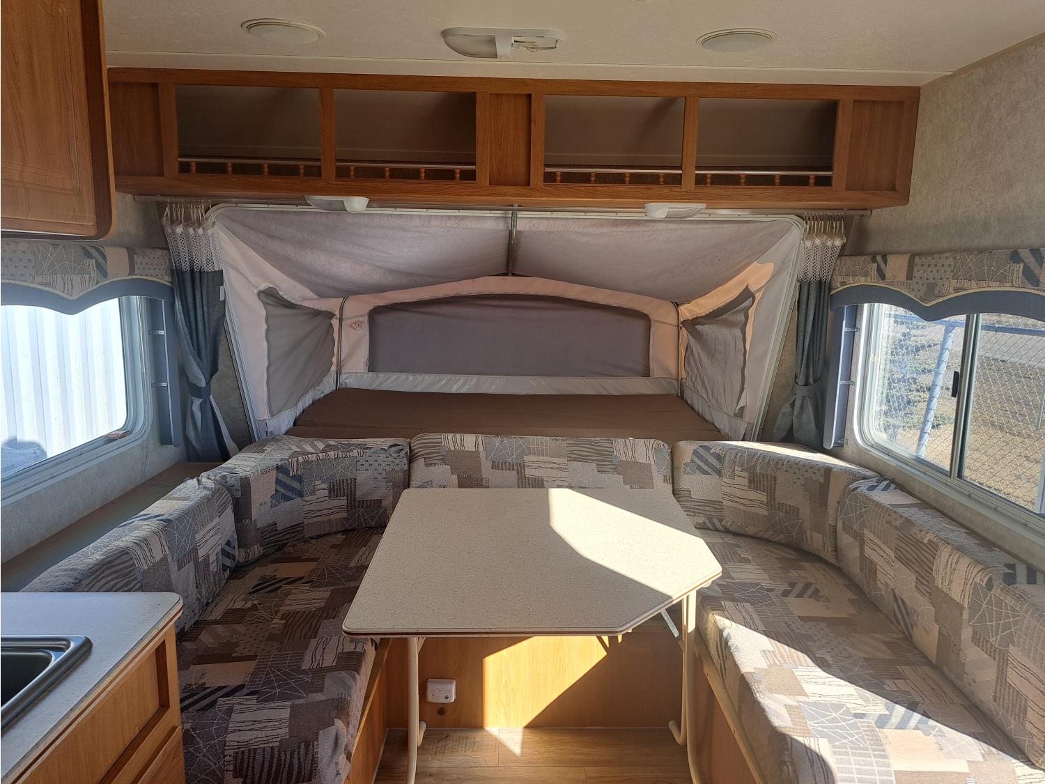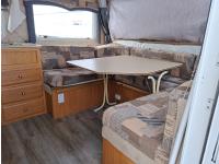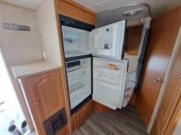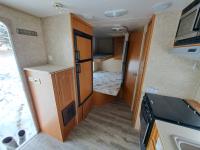 stove, fridge, microwave, full bath, bunk beds, A/C, outdoor shower, manual awning, spring suspension, electric brakes, (2) 30lb propane tanks, rear hitch, roof antenna, stereo, pop out tent, furnace, range fan, smoke detectors, Co2 detectors, 2 5/16 inch load distribution hitch assembly, window coverings, spare tire, 30 amp power cord with cross over to 120 volt., 205/75R14 tires