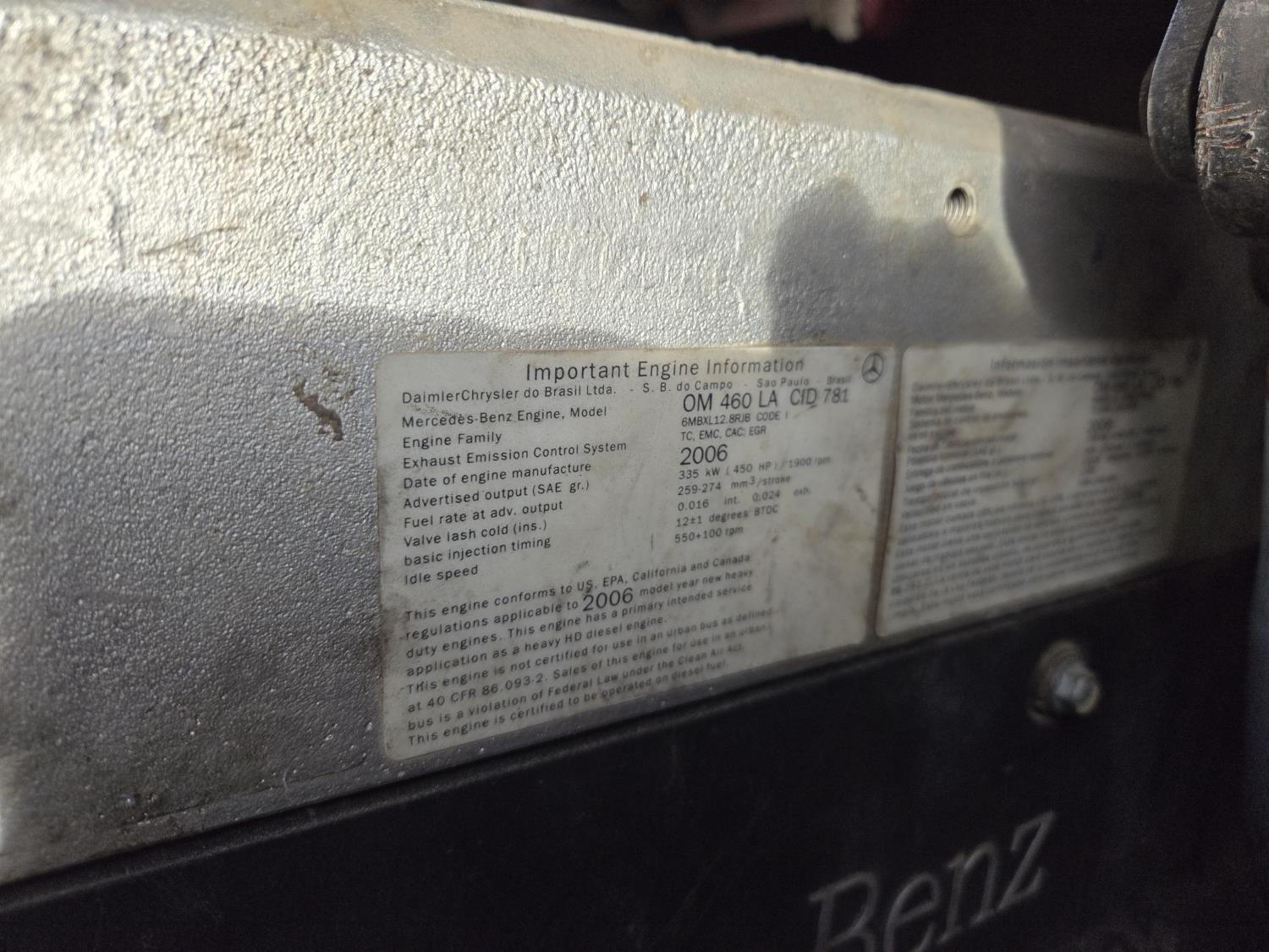 Mercedes Benz OM460 12.8 6 cylinder 450 HP engine, Eaton Fuller 18 speed manual transmission, 32 inch sleeper, A/C, leather interior, air ride driver seat, radio, hydraulic wet kit, moose bumper, Ace headache rack, chain holders, sliding 5th wheel, hydraulic winch, air ride suspension, 16,000 lb front axle, 45,400 lb rear axles, full lockers, 240 inch WB, all aluminum wheels, 385/65R22.5 tires