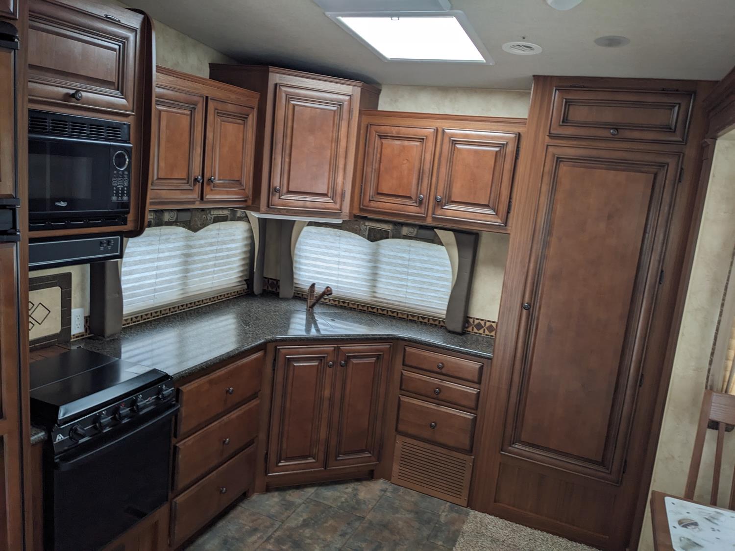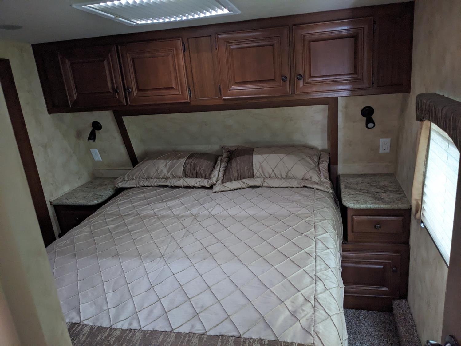 Sleeps 4, stove, fridge, microwave, full bath, master bedroom, A/C, outdoor shower, 2 slides, power awning, power levelling jacks, spring suspension, electric brakes, roof mounted satellite dish, solar panels, 235/80R16 tires