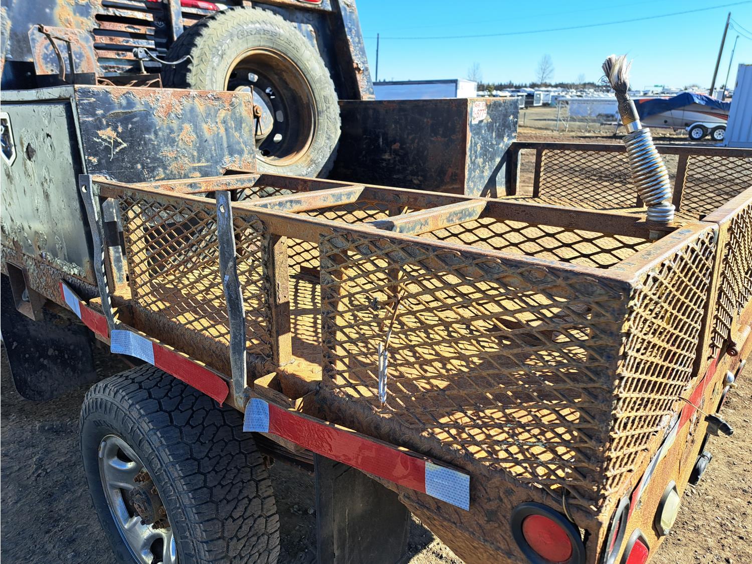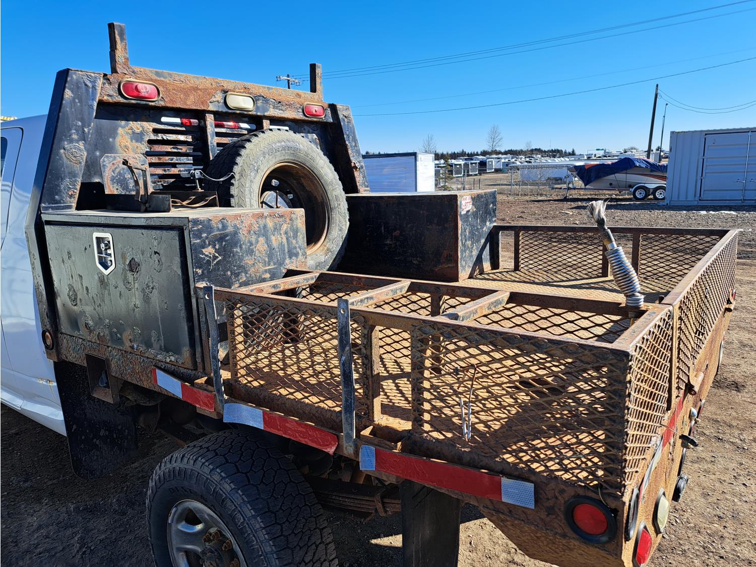 6.7 L, 6 cylinder, diesel, 6 speed automatic transmission, P/W, P/L, A/C, steel headache rack, steel box rails, steel toolbox, Pwr mirrors, pwr sliding rear window, CD player, pwr Inverter, tow haul mode, engine brake, trailer brake control, RODA DEACO Valve emergency shut off, spring suspension with added air bags, 160 inch wheel base, 87 inch long x 79 inch wide deck, rub rails, stake pockets, sparte tire, fire extinguisher holder, (2) 3 Ft x 18 inch x 18.5 inch tool boxes, 265/70R17 tires